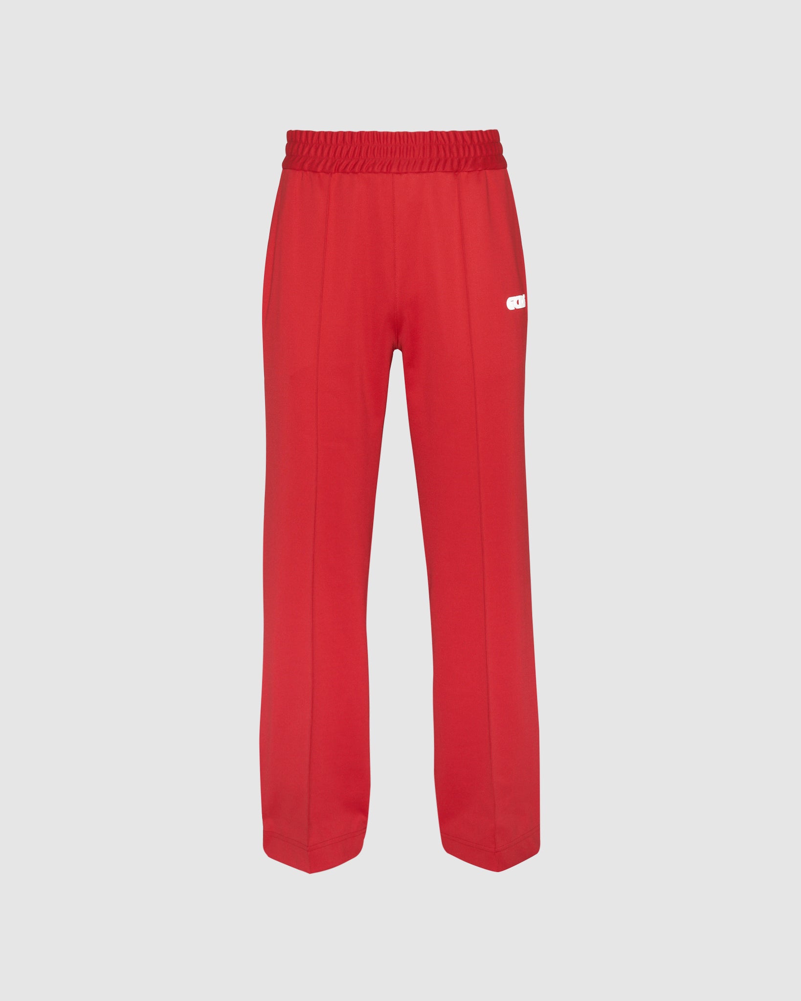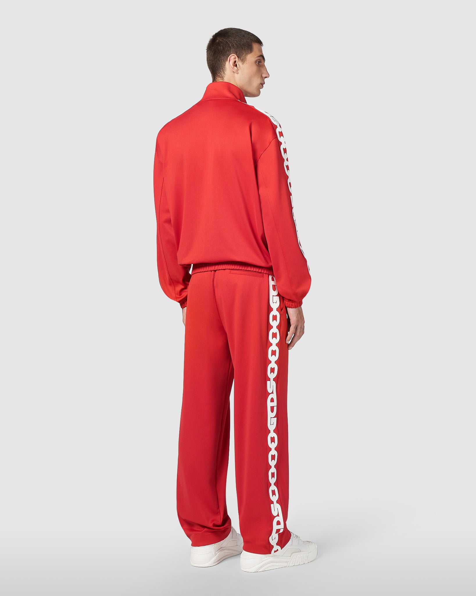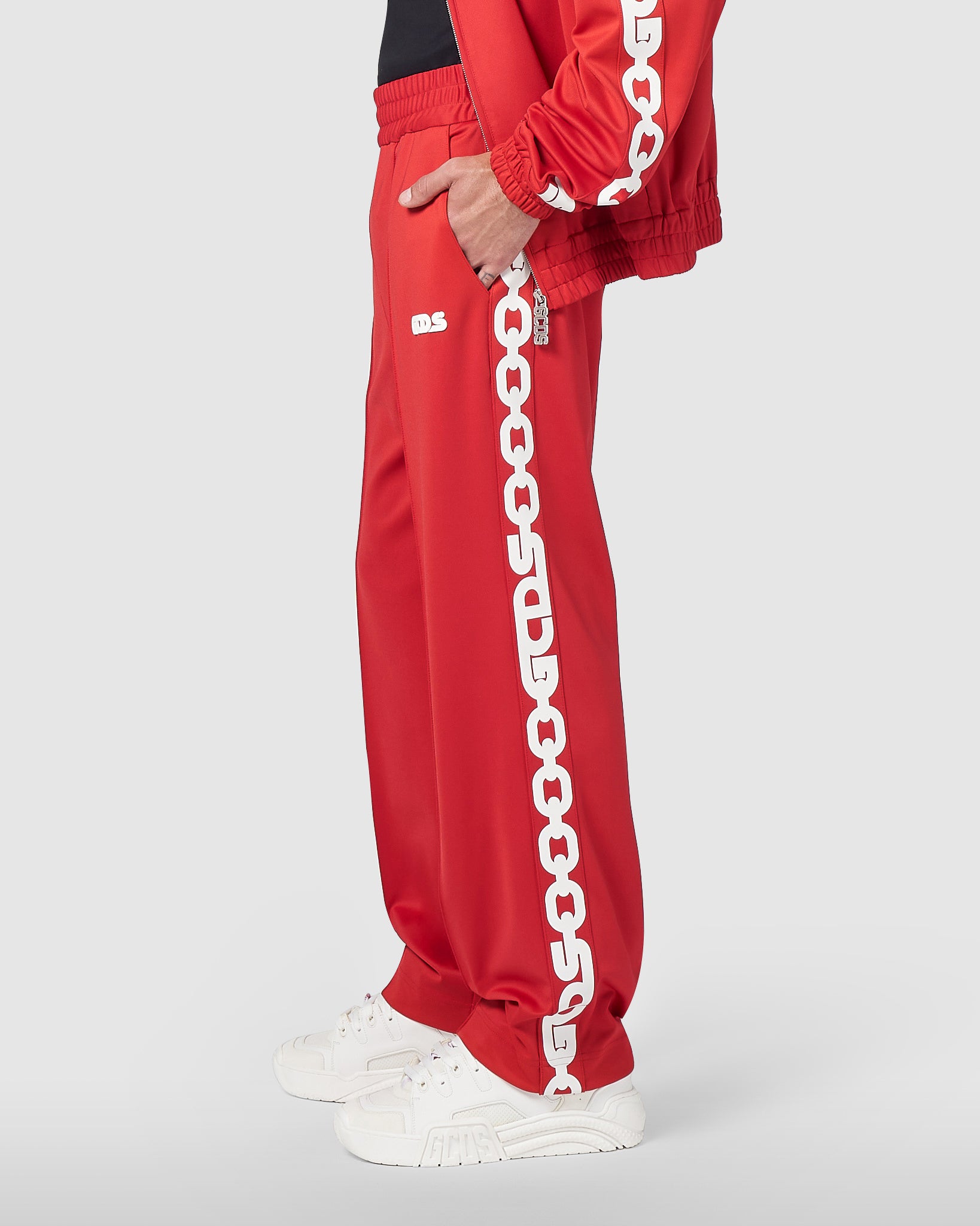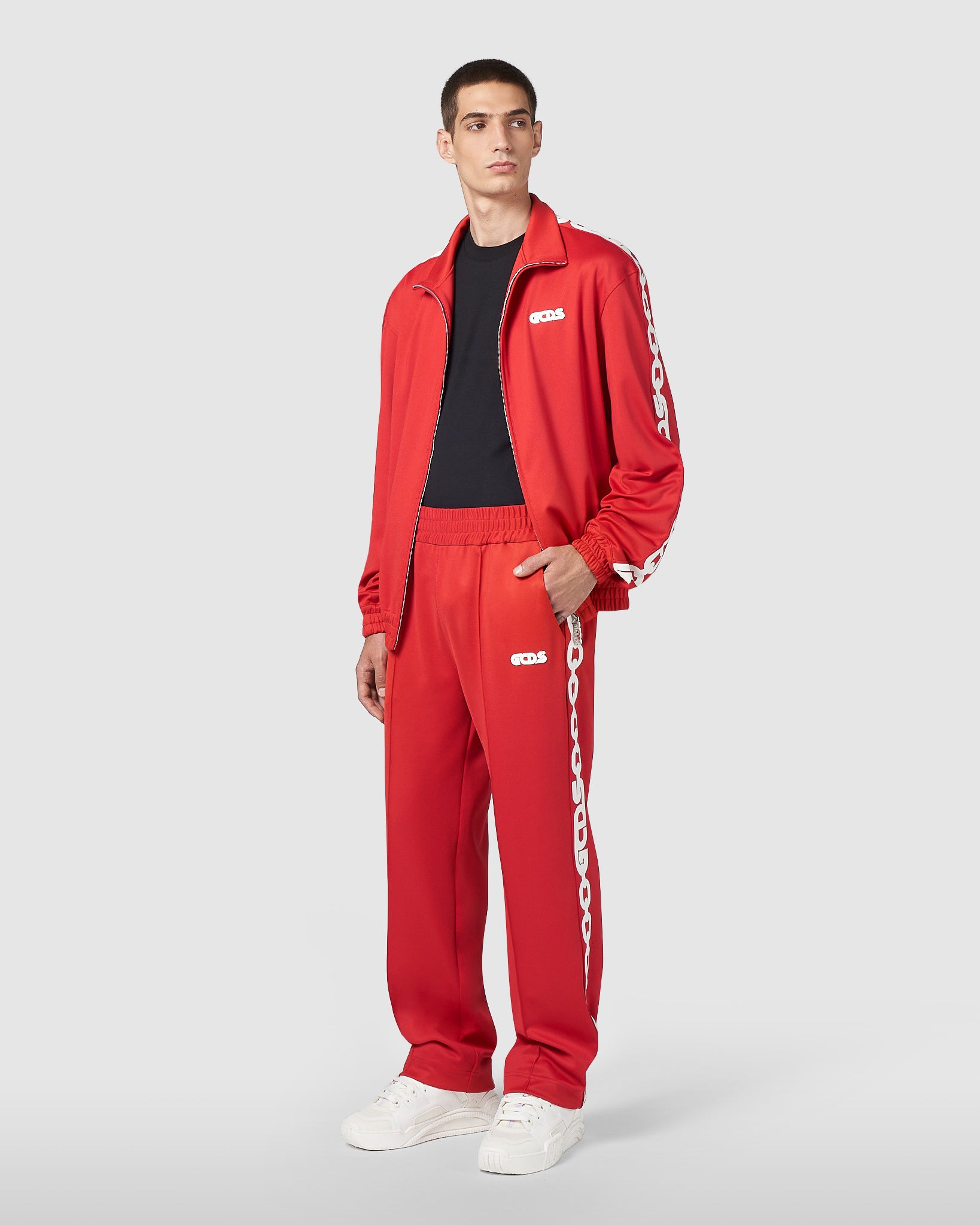 GCDS sweatpants with folded pleat on the front with thick thermo printed logo chain side band. Slash pockets, elastic waist. Relaxed fit.