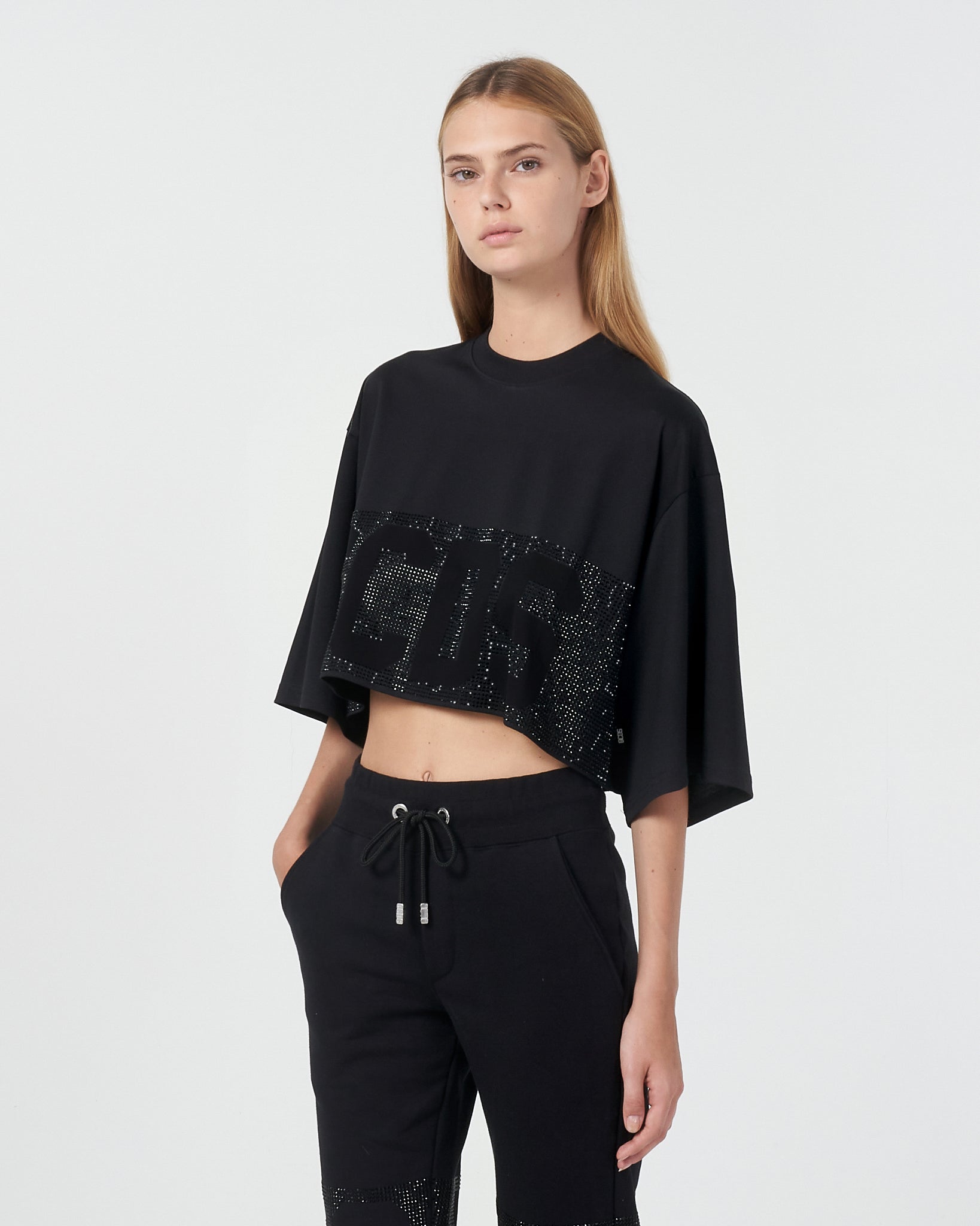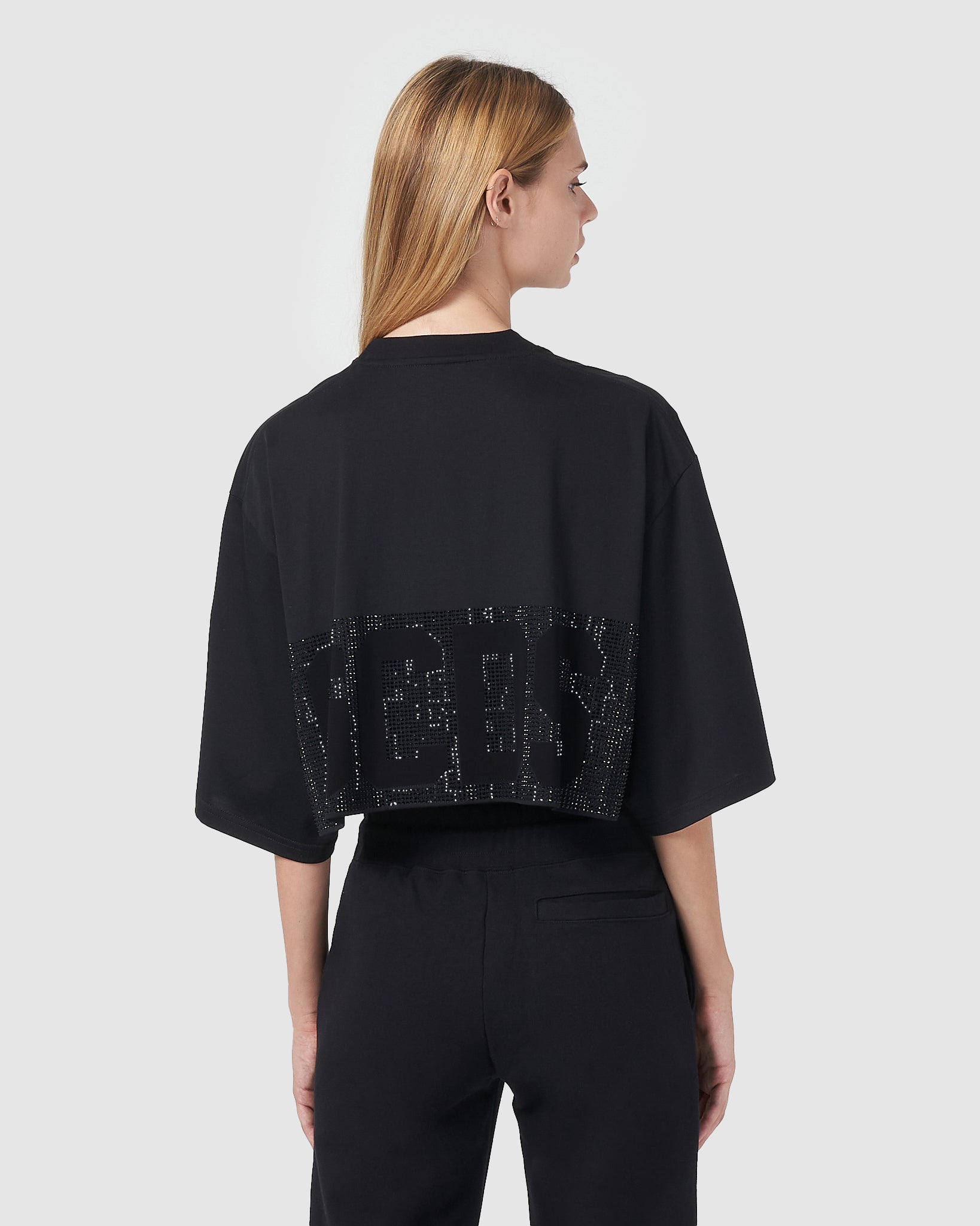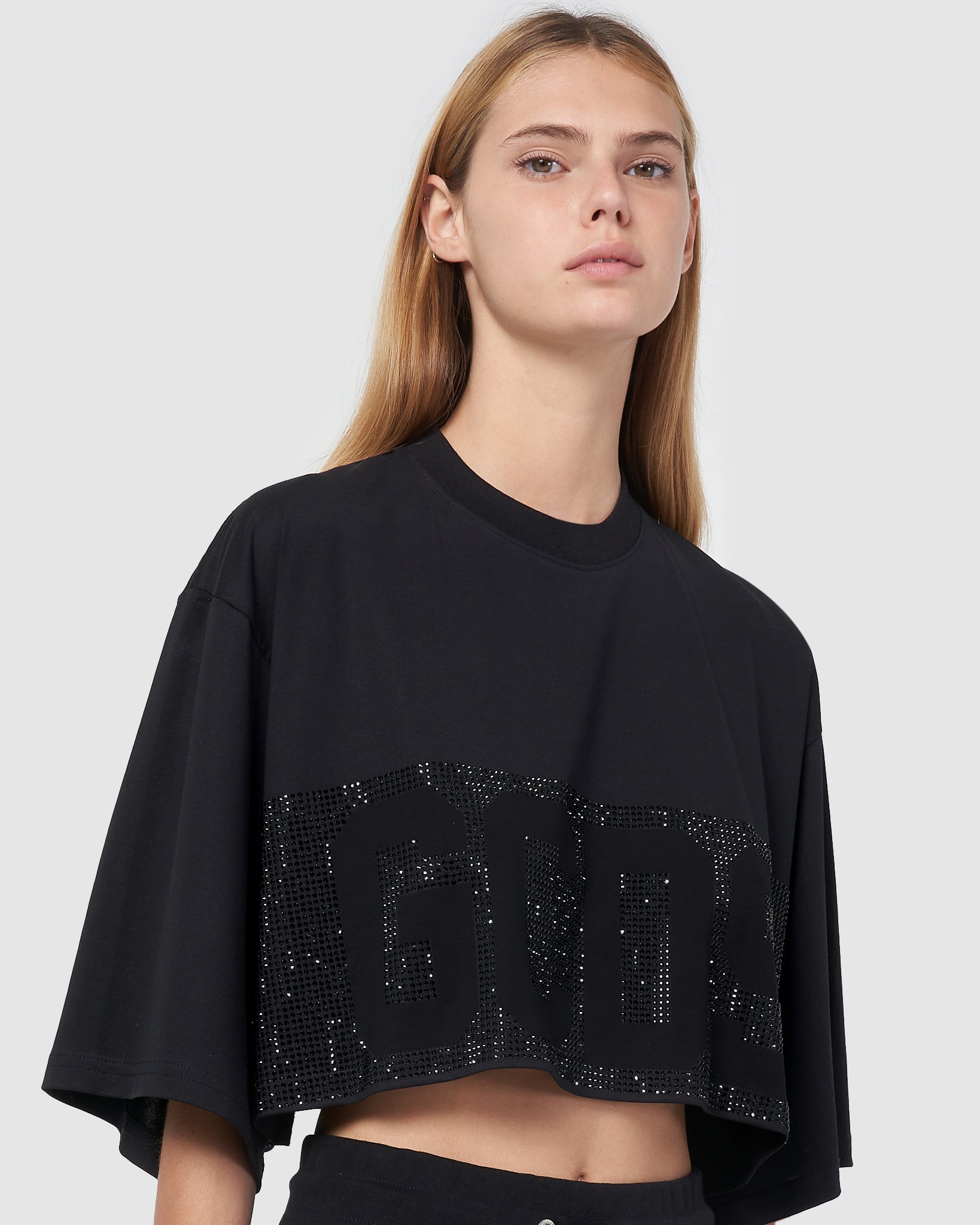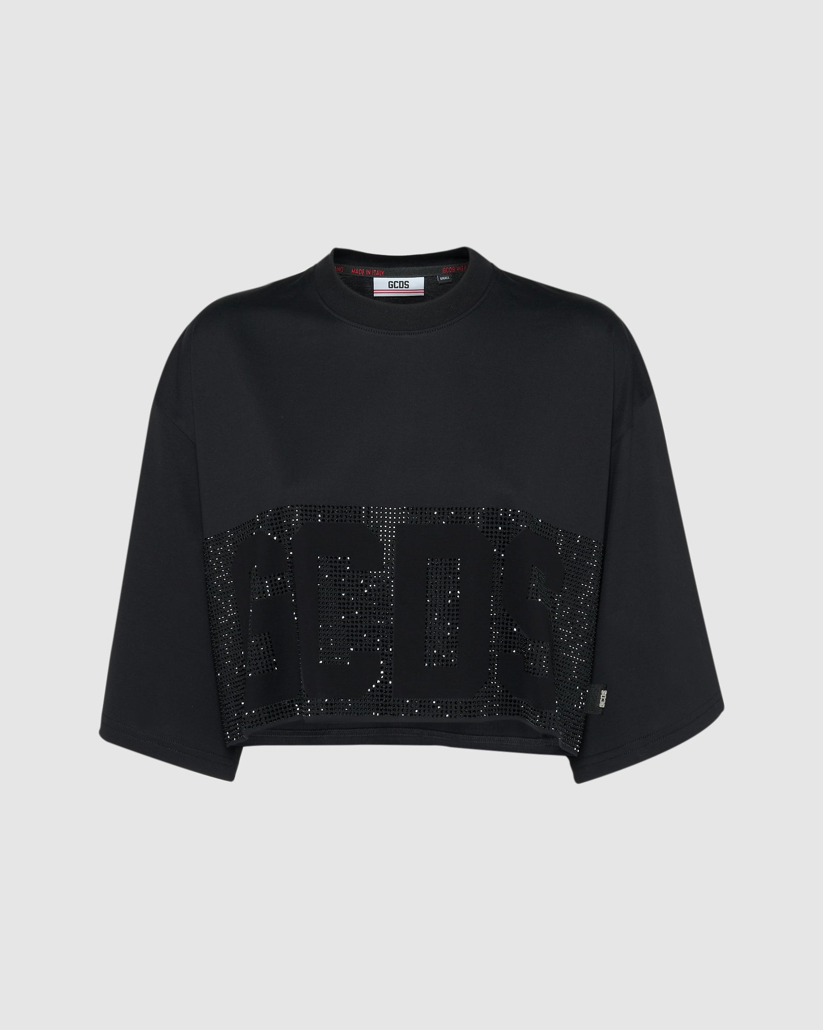 GCDS cropped cotton T-shirt. Full rhinestone band with negative logo inlaid on the front and back. Over-sized.