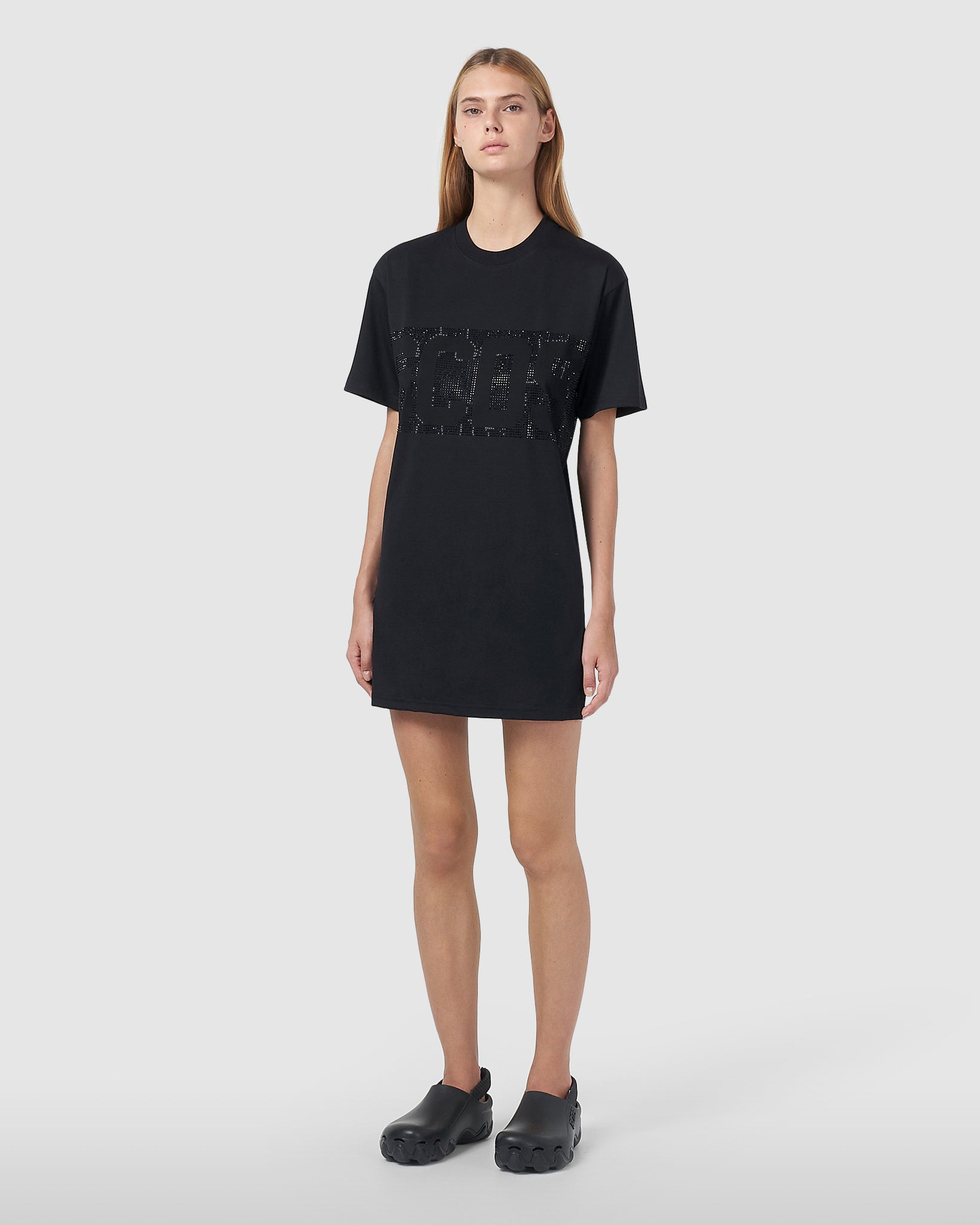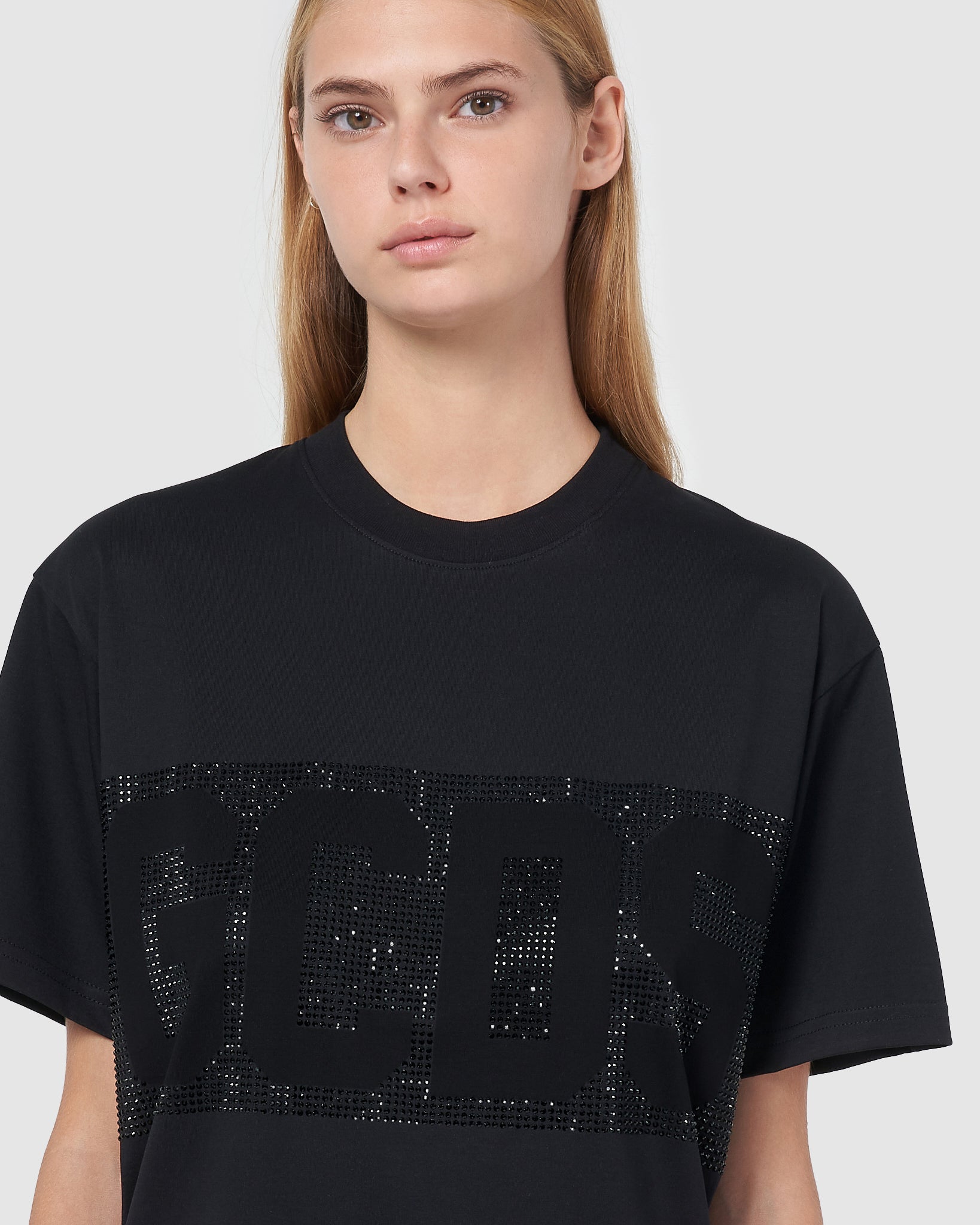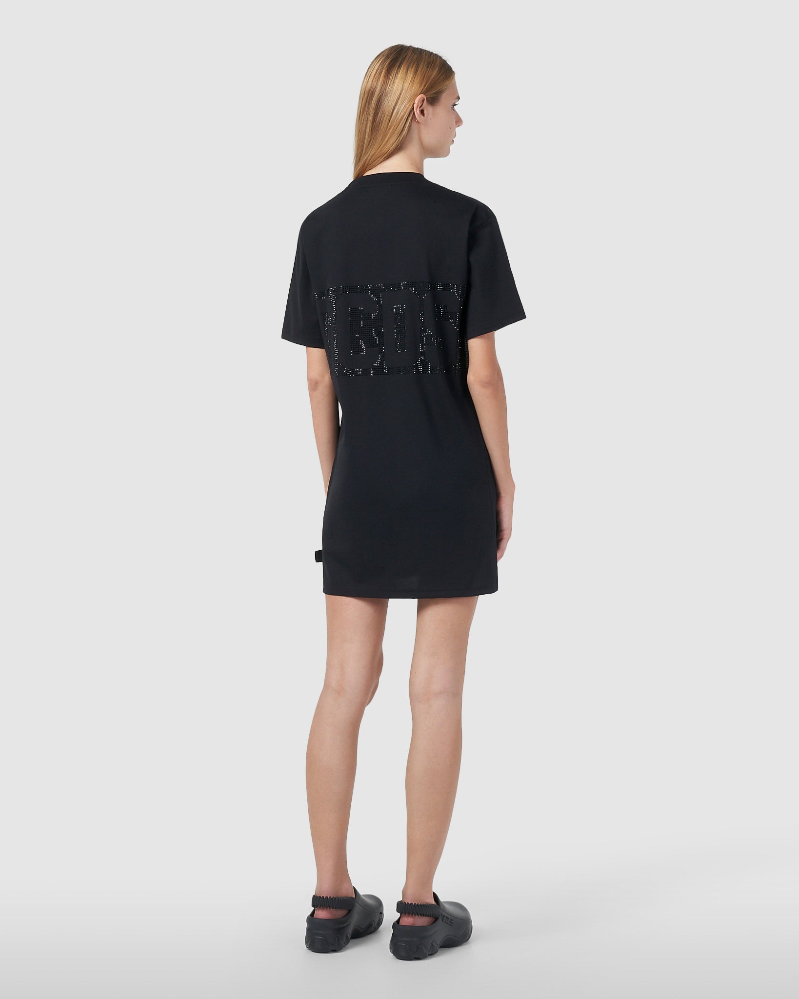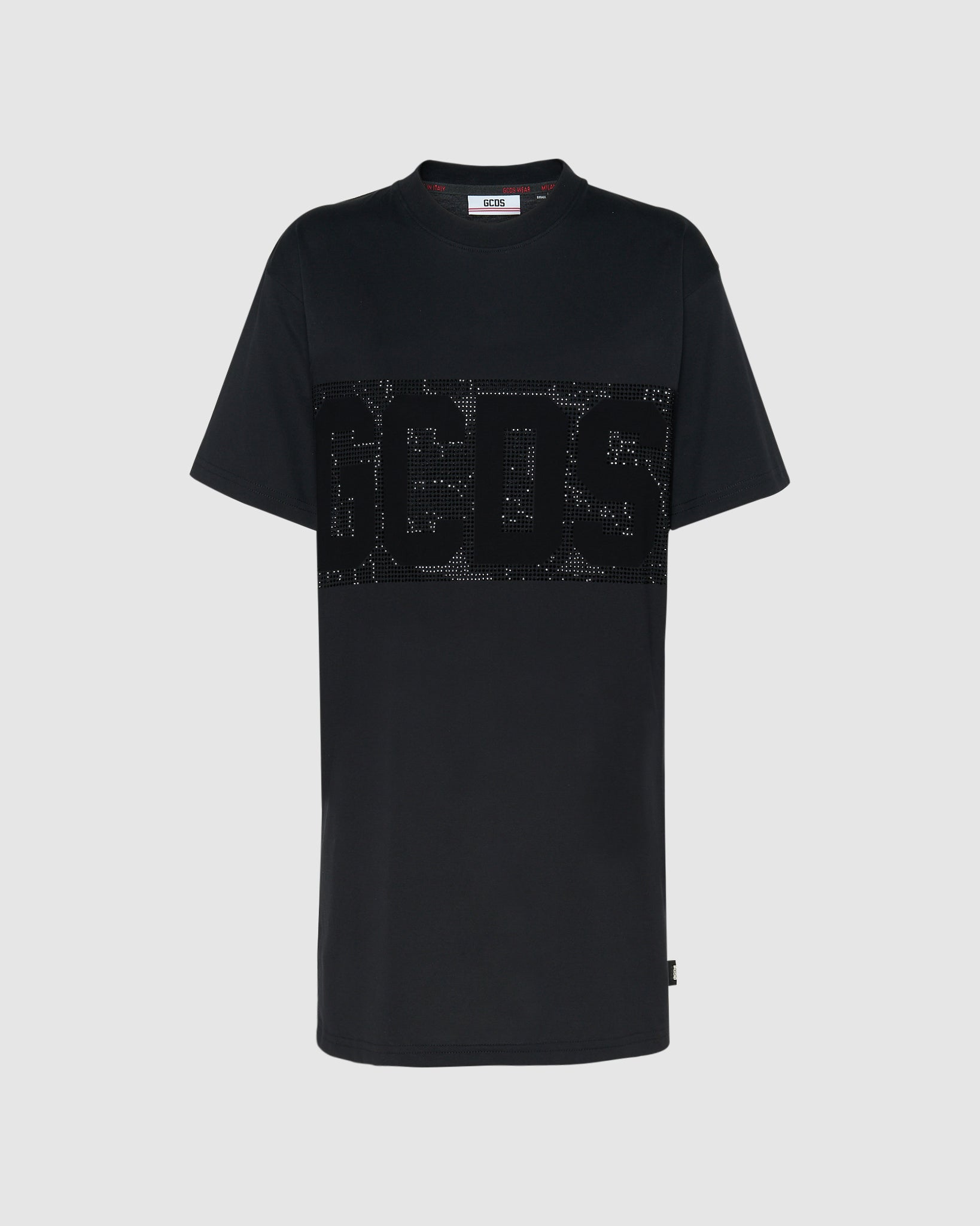 GCDS cotton maxi T-shirt. Full rhinestone band with negative logo on the front and back.
