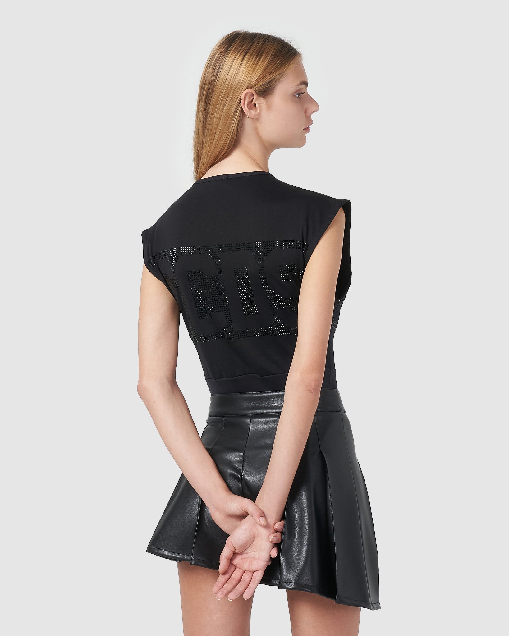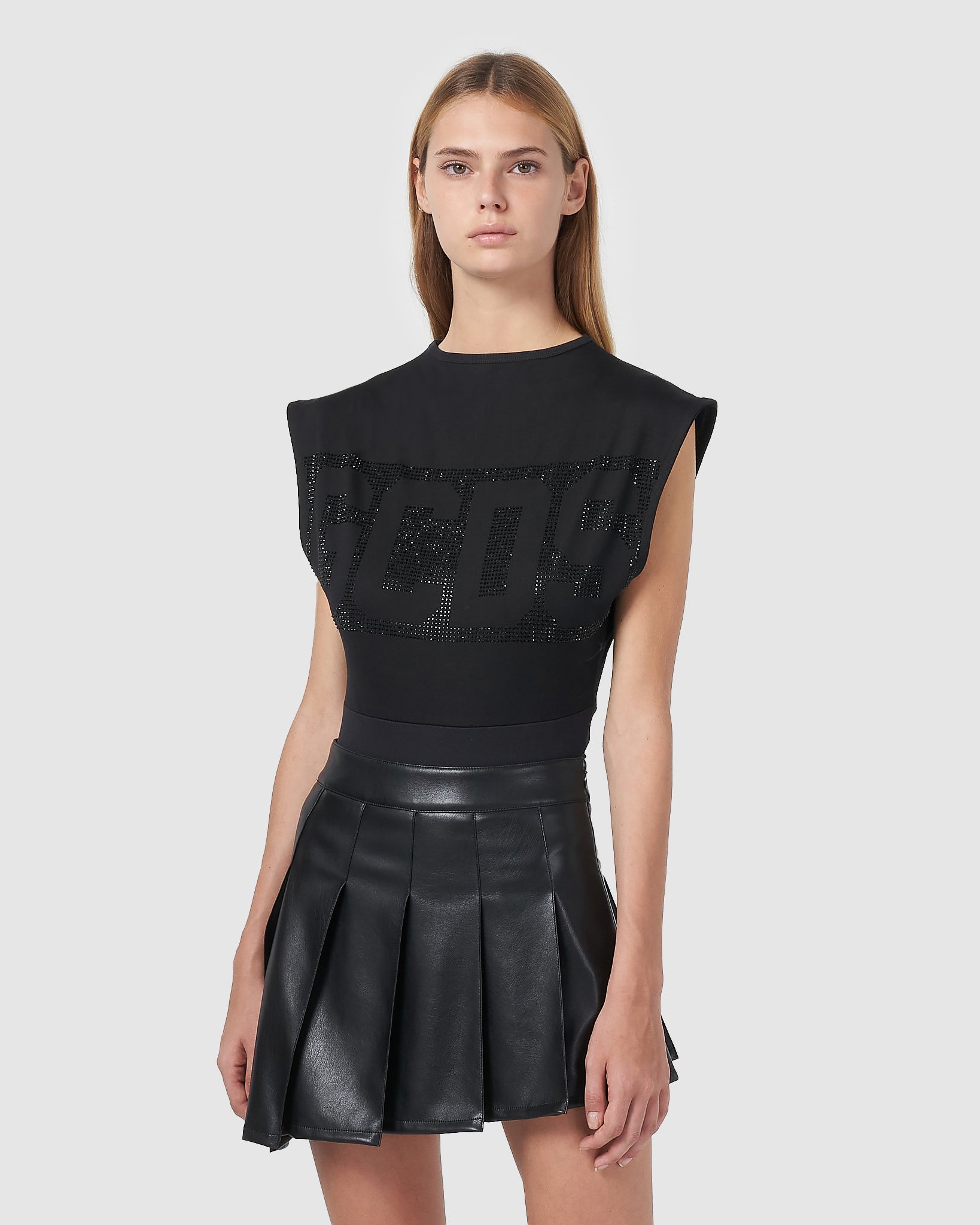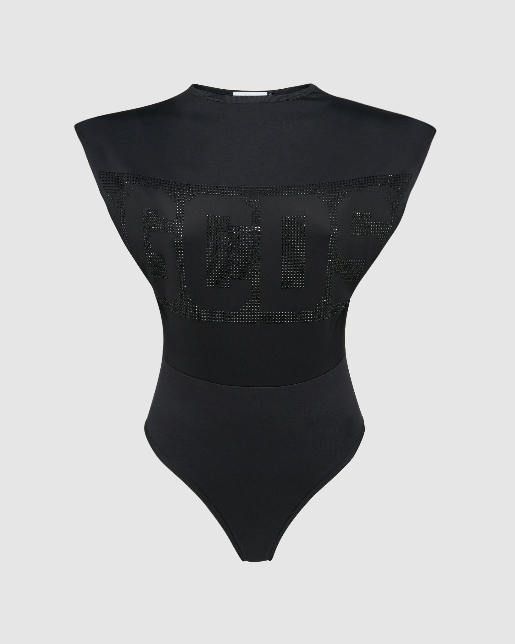 GCDS cotton bodysuit. Full rhinestone band with negative logo inlaid on the front and back. From the waist down, stretch cotton narrow rib.