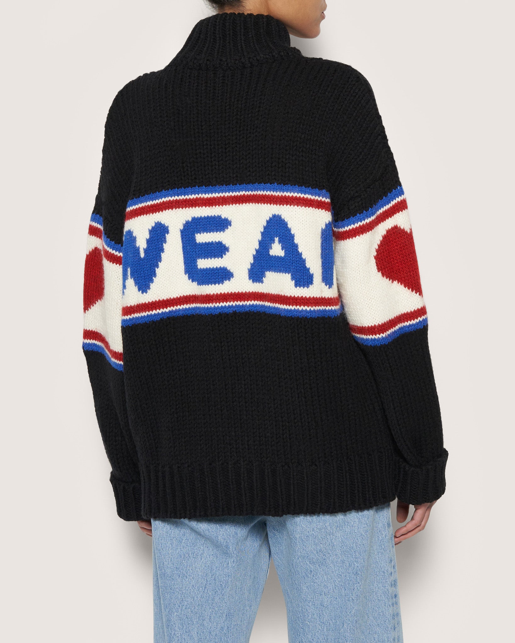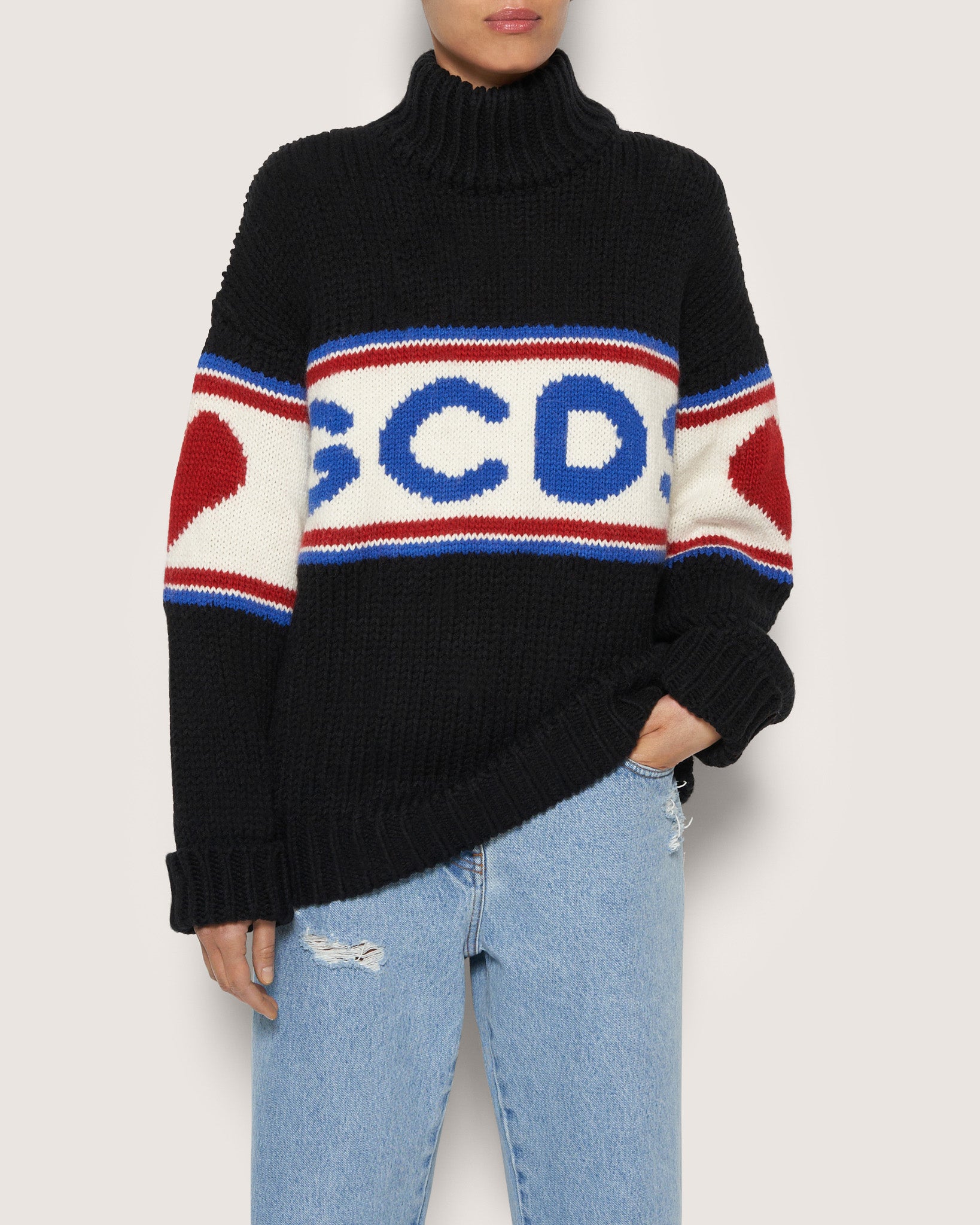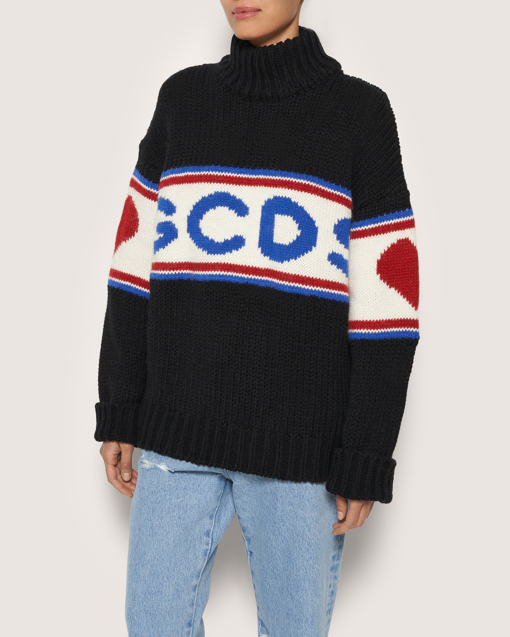 Soft jersey GCDS sweater, high-necked. Wool-blend GCDS logo band on the front and back, with hearts on the sleeves. Over-sized.