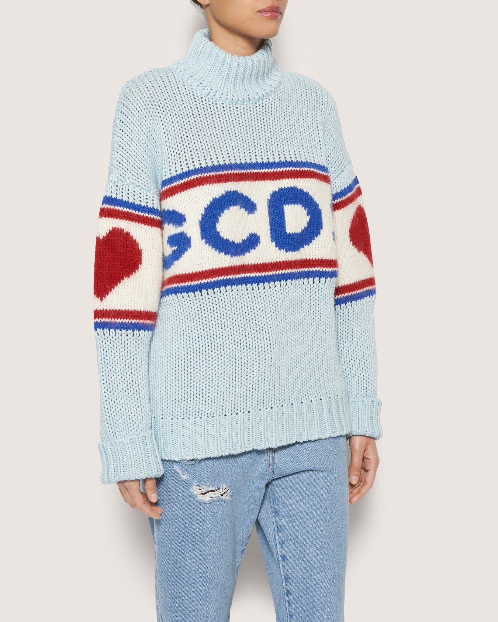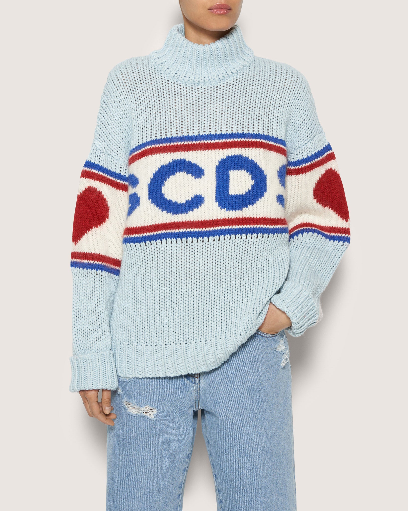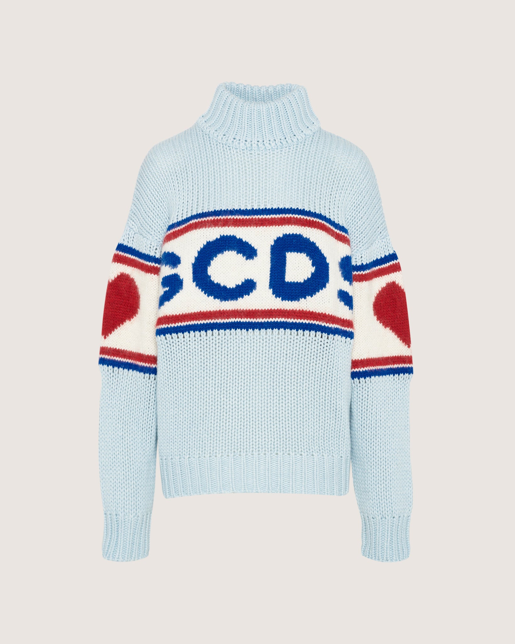 Soft jersey GCDS sweater, high-necked. Wool-blend GCDS logo band on the front and back, with hearts on the sleeves. Over-sized.