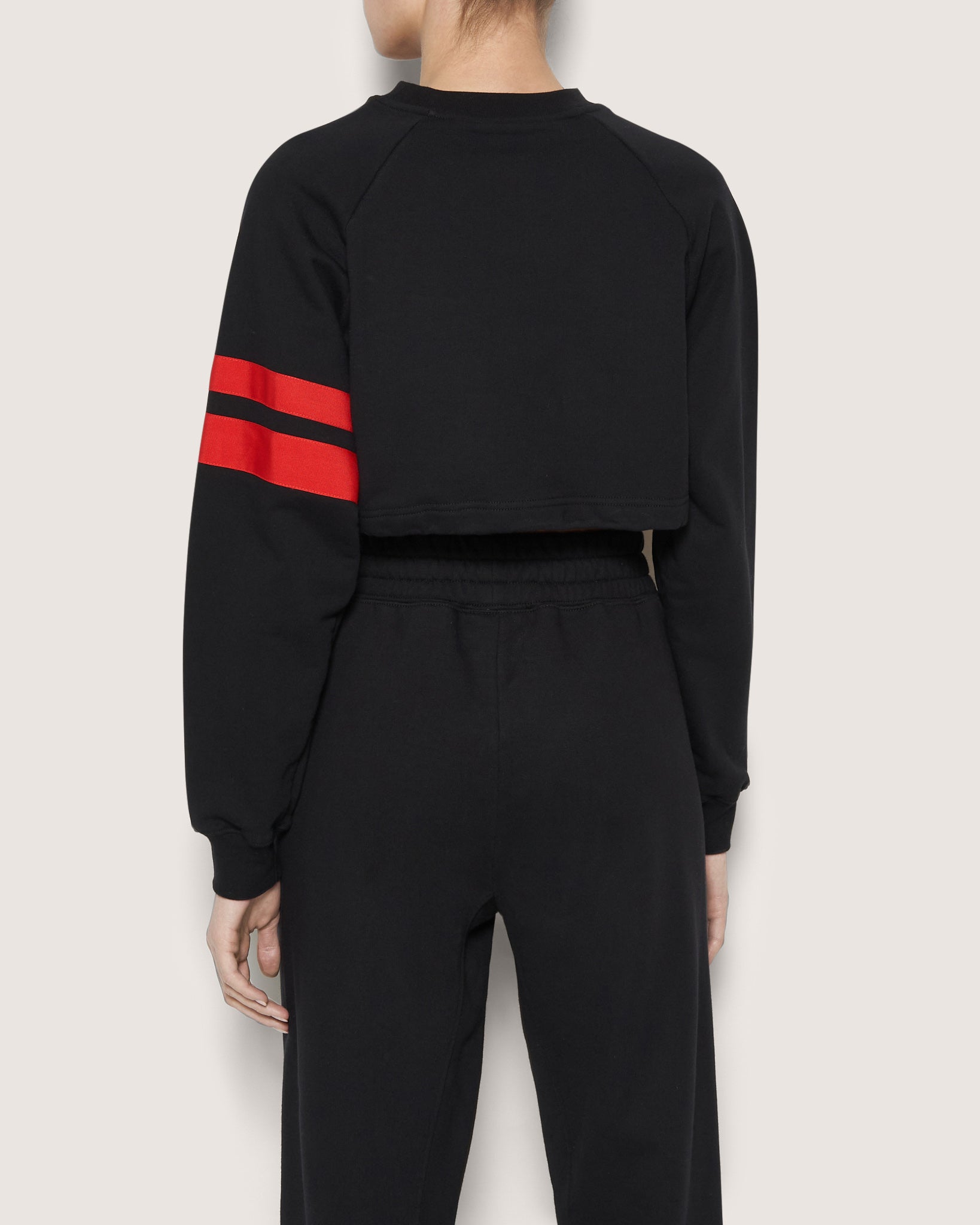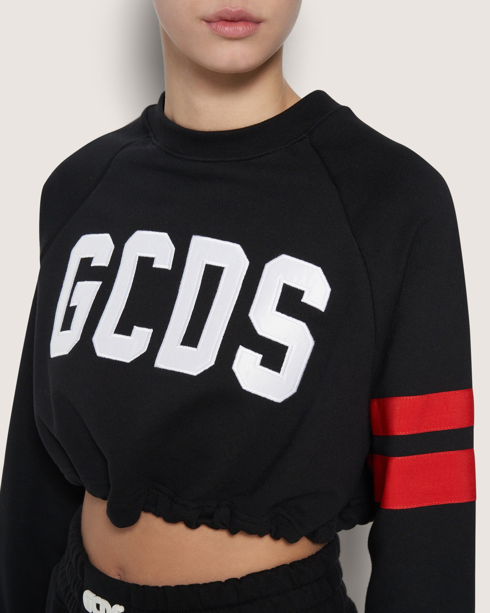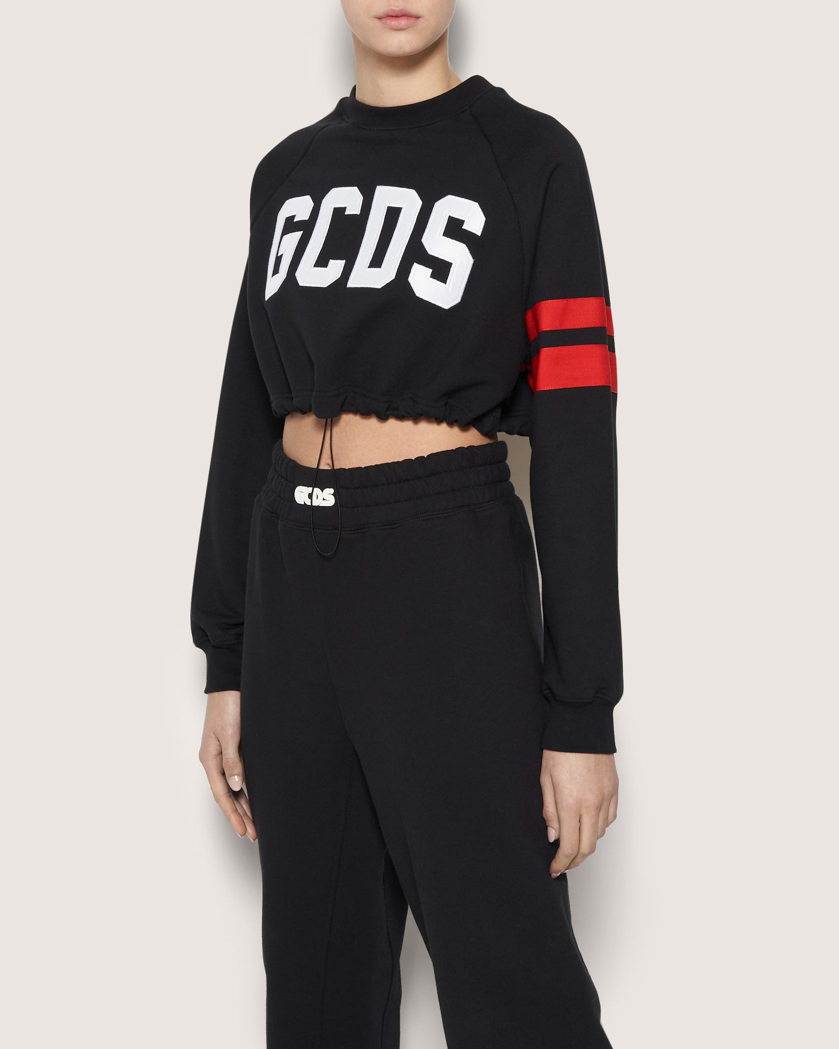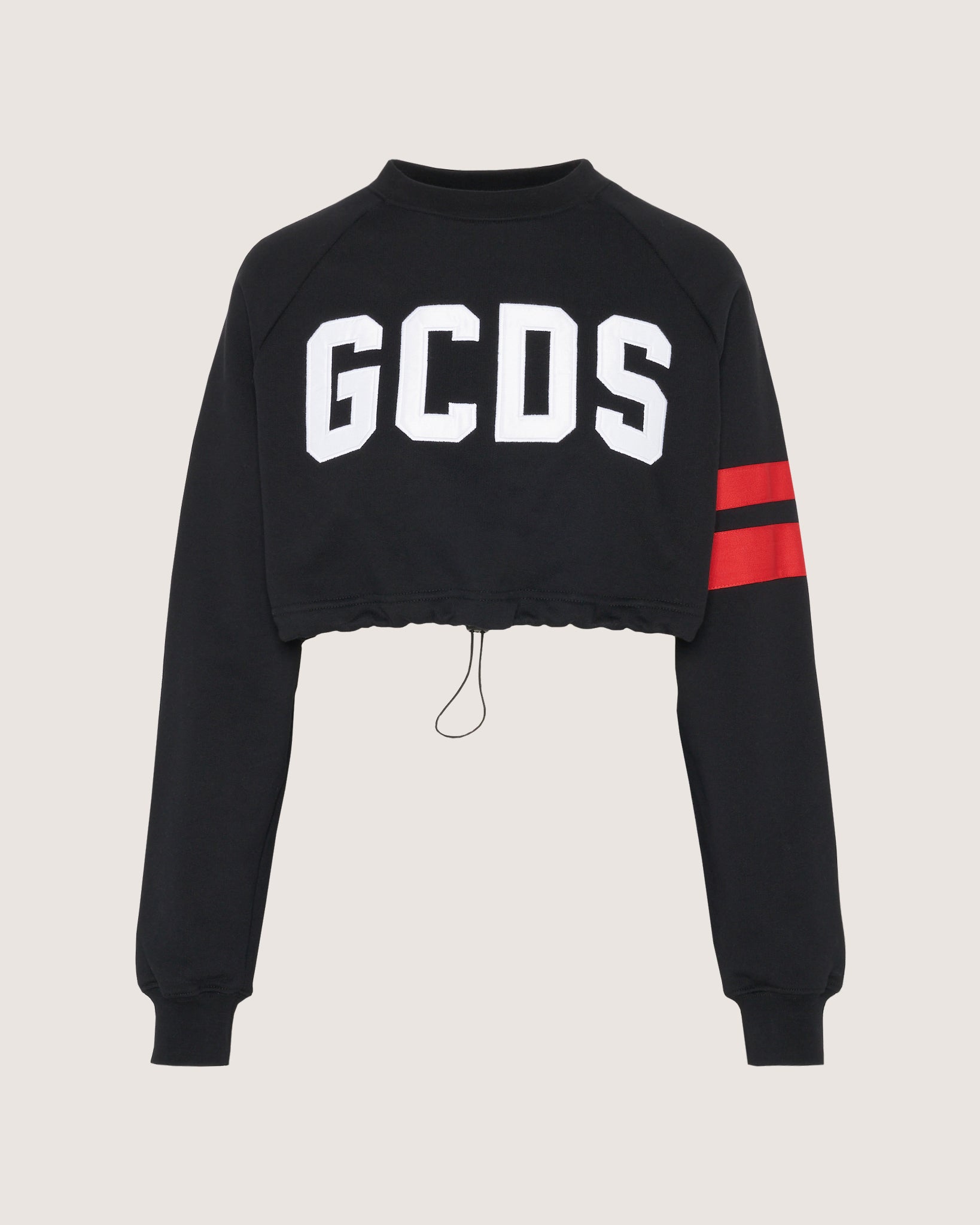 GCDS Crewneck crop with cord ties at the bottom and characteristic wide ribbed neckline. Raglan cut, long sleeves with ribbed stretch cuff. Contrasting white logo, matching drawstring appliqué on center front. Contrasting red bands on left sleeve.