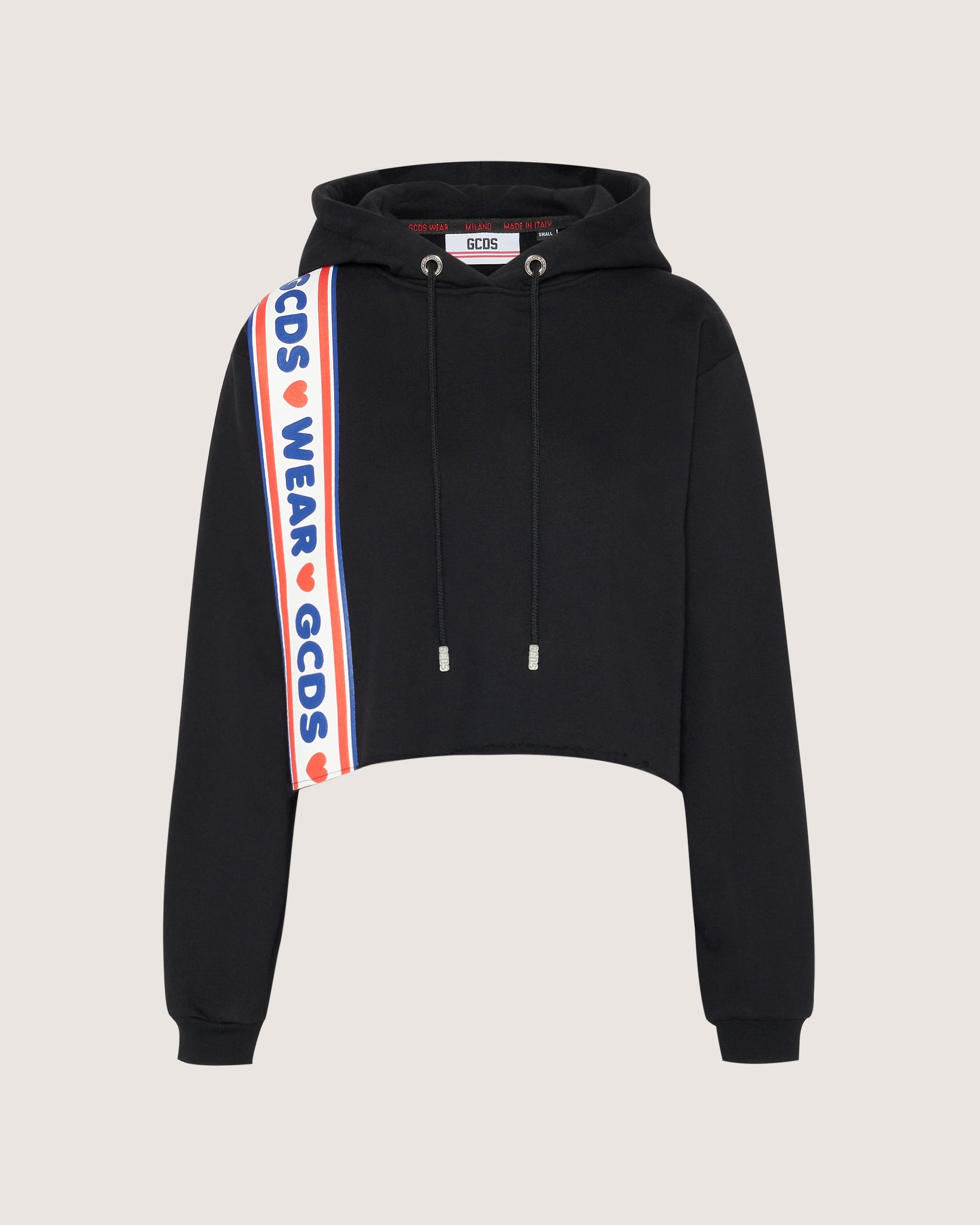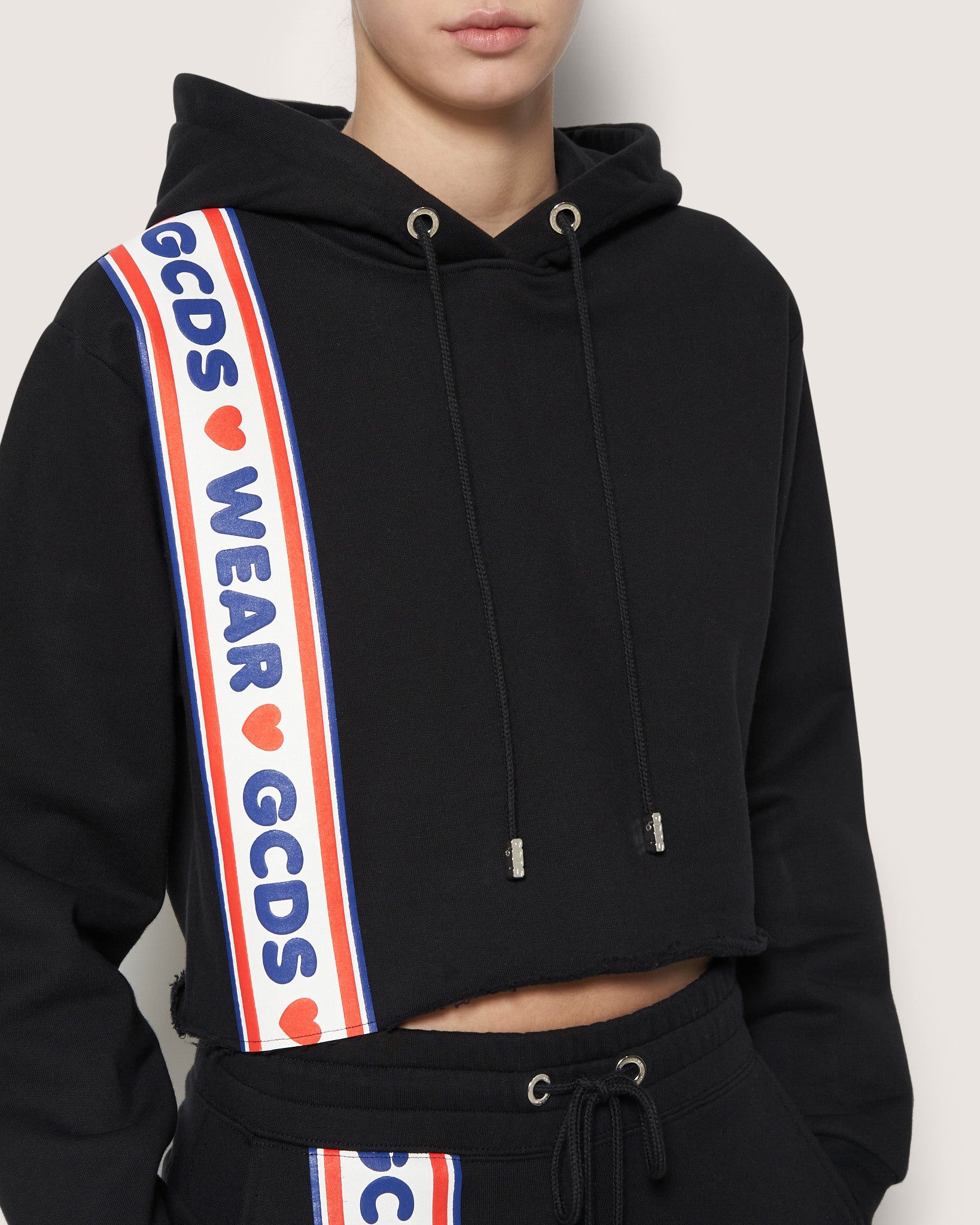 Raw-cut cropped GCDS sweatshirt and long sleeves. Adjustable hood with drawstring and cord clamp. 3D heart printed on the hood and 3D GCDS Wear Cute logo band along the side.