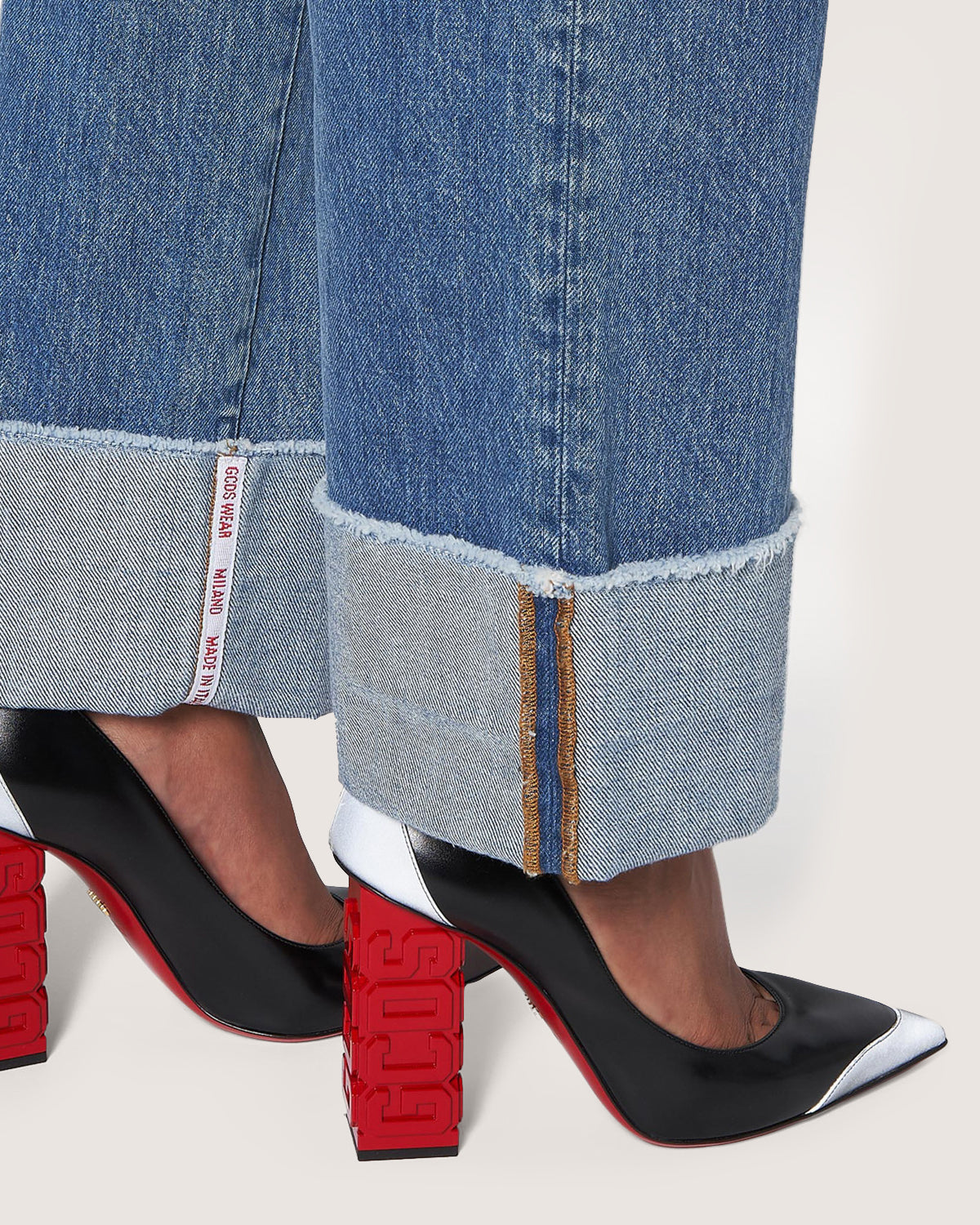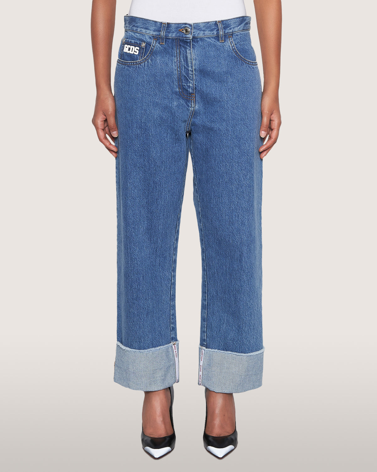 Low-waisted boyfriend cut jeans with high turn-ups at the bottom.