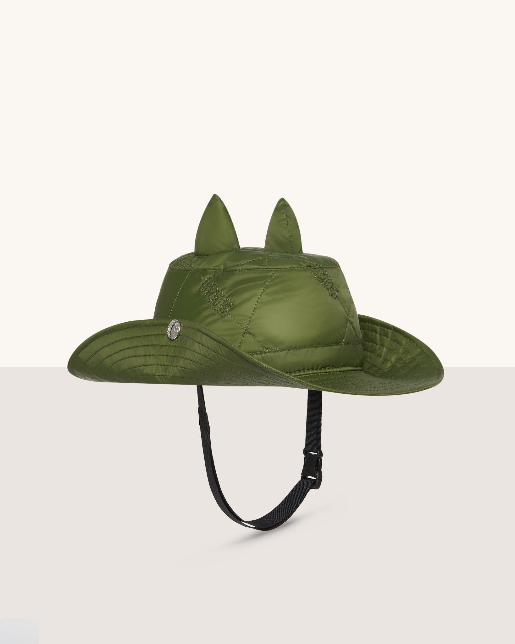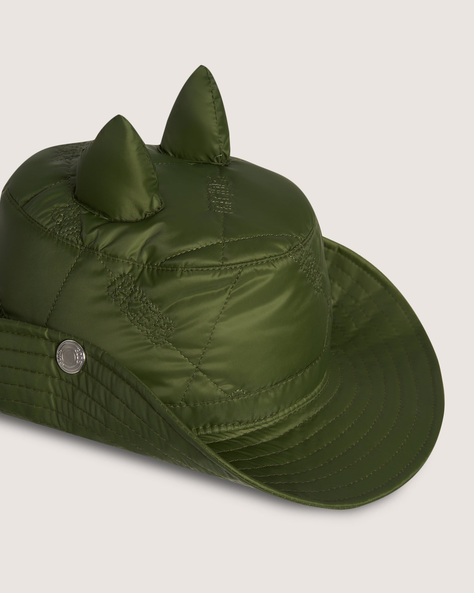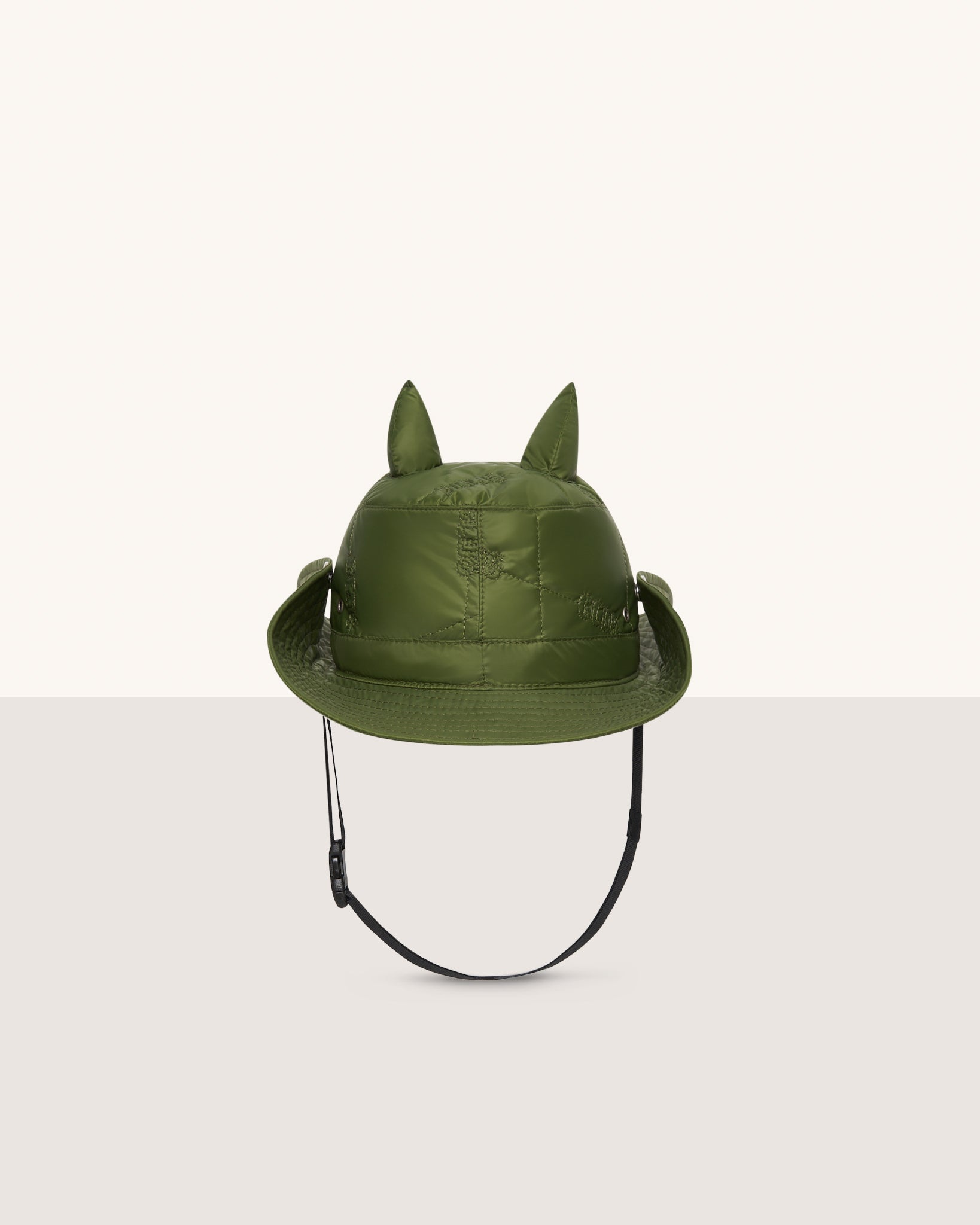 Australian GCDS hat with padded ears, in quilted nylon with logo. Logo button snaps on the sides. Adjustable strap with snap buckle.