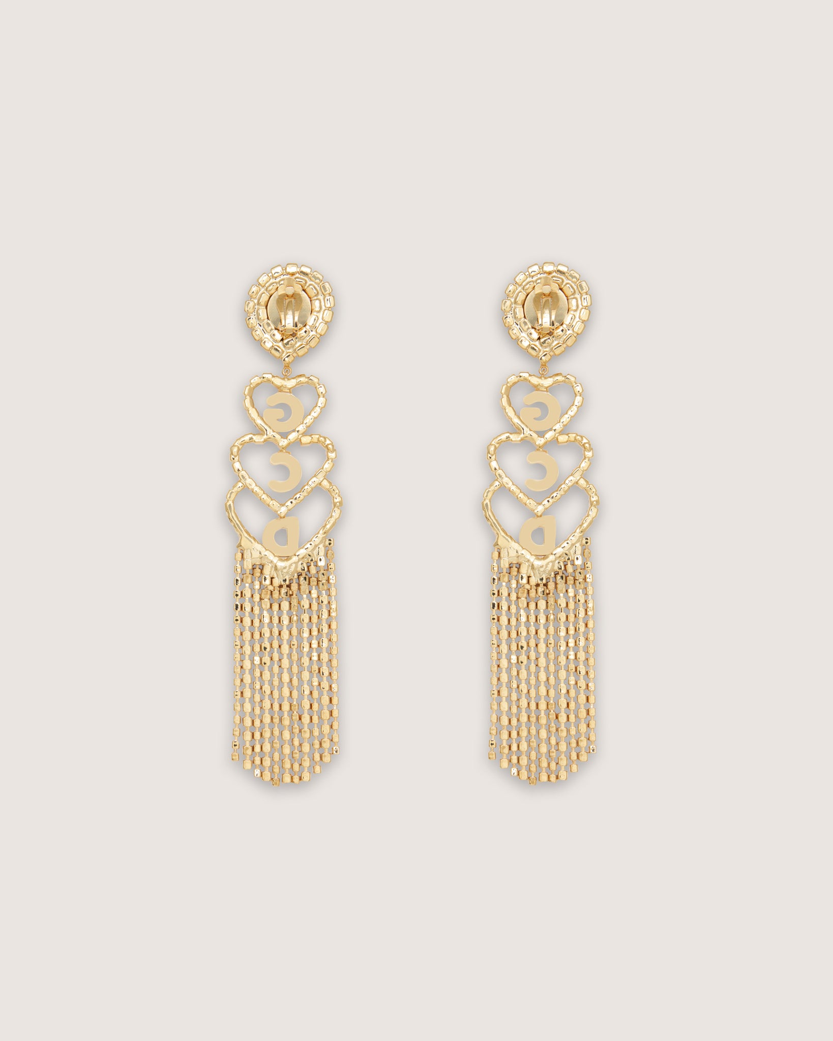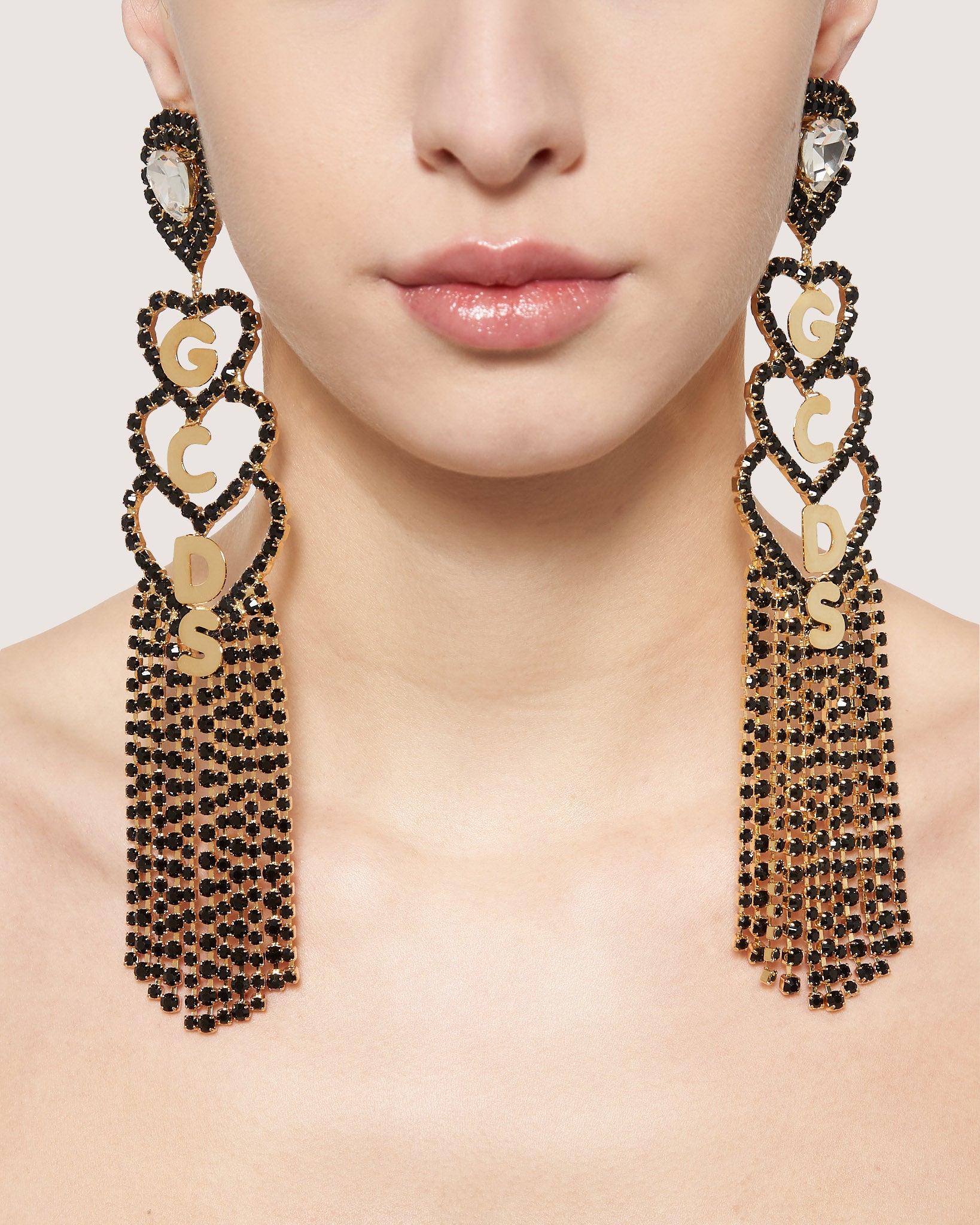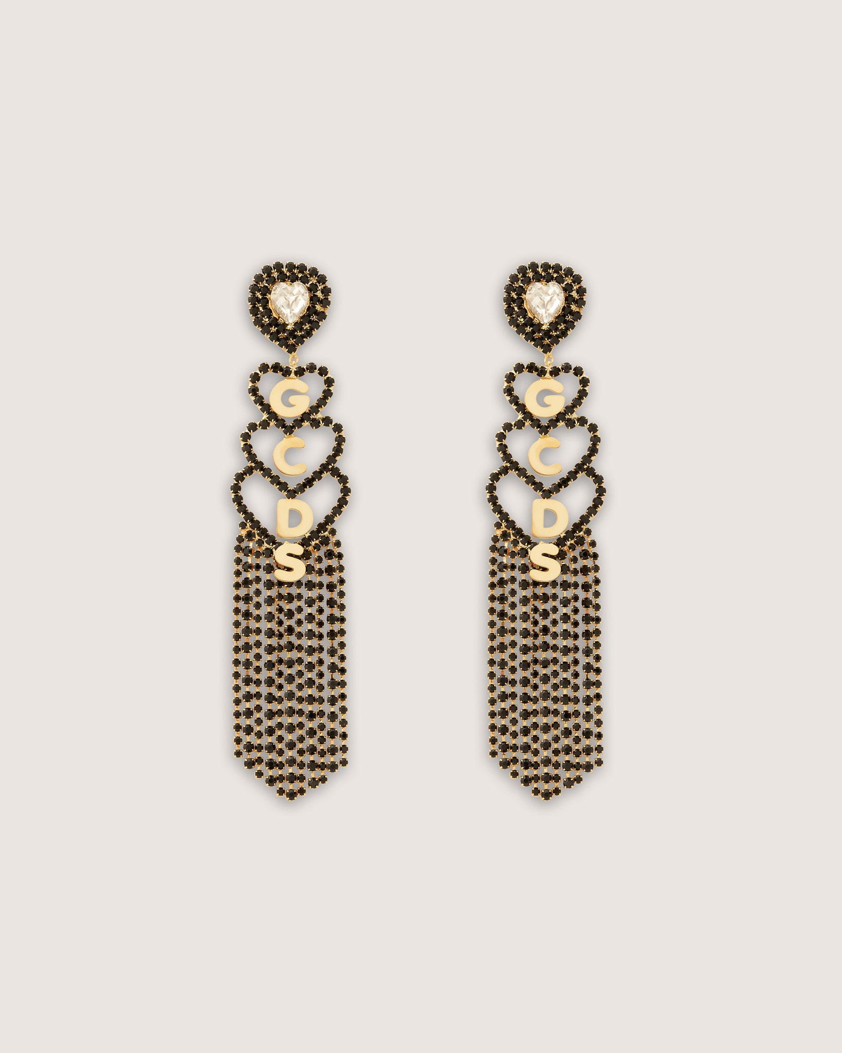 Maxi GCDS earrings with maxi Preciosa crystal heart. Row of linked hearts with GCDS Cute logo. Different lengths and sizes of fringe.