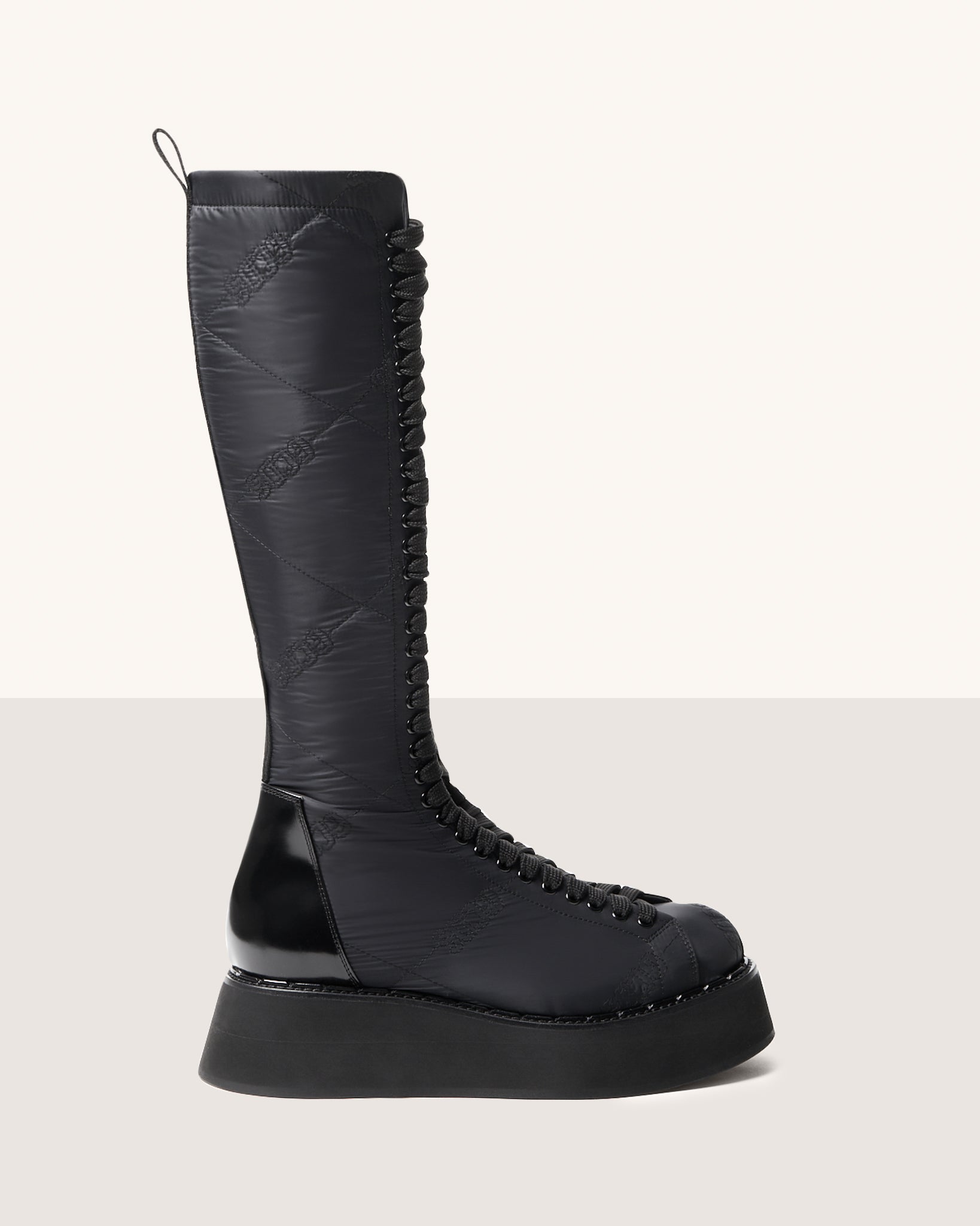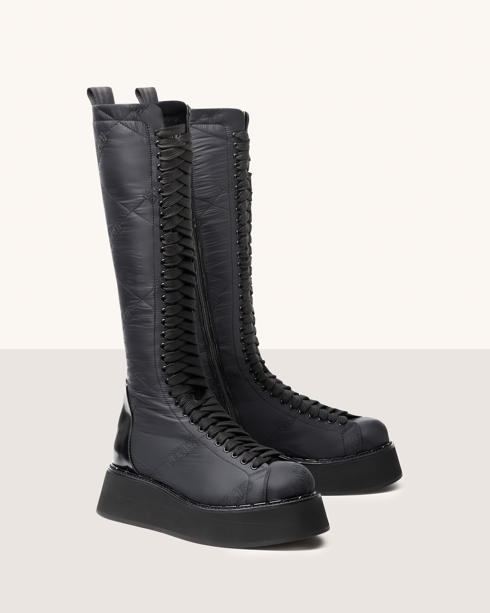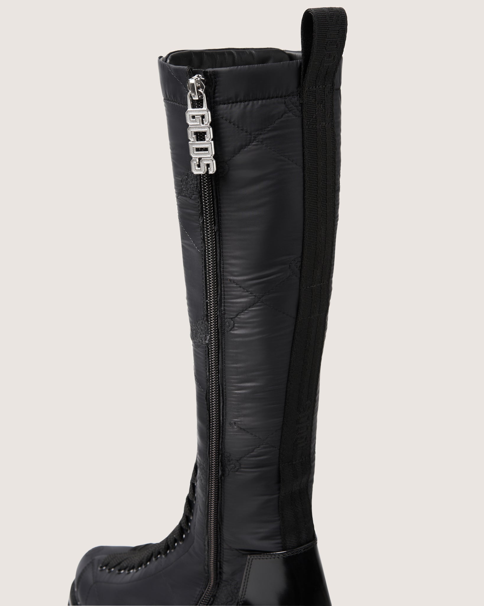 Tall GCDS Combat boots, diamond quilted Ripstop fabric with logo with ultra-light micropore sole. Classic stitched welt. Tight lace-up on the vamp and inside zipper.