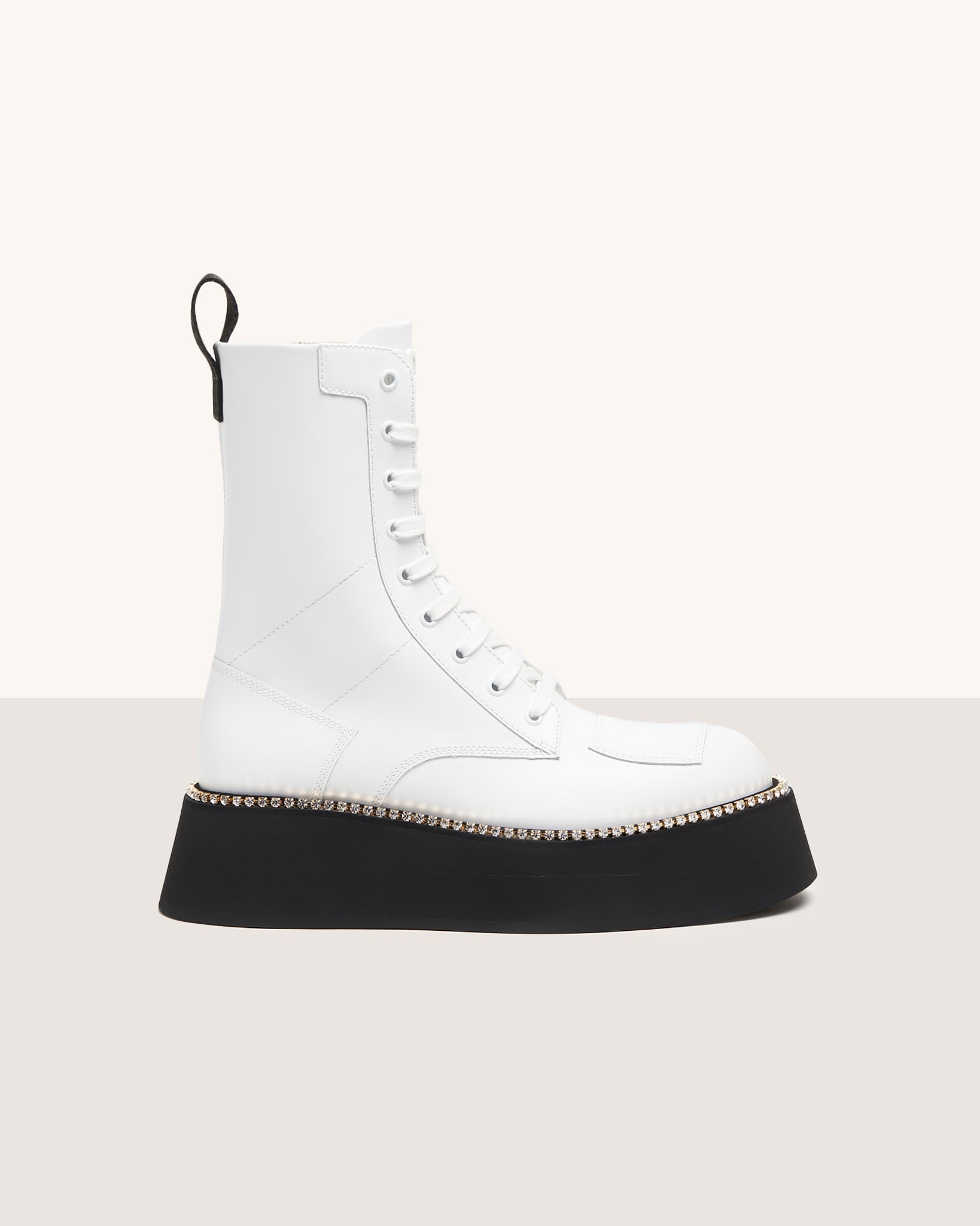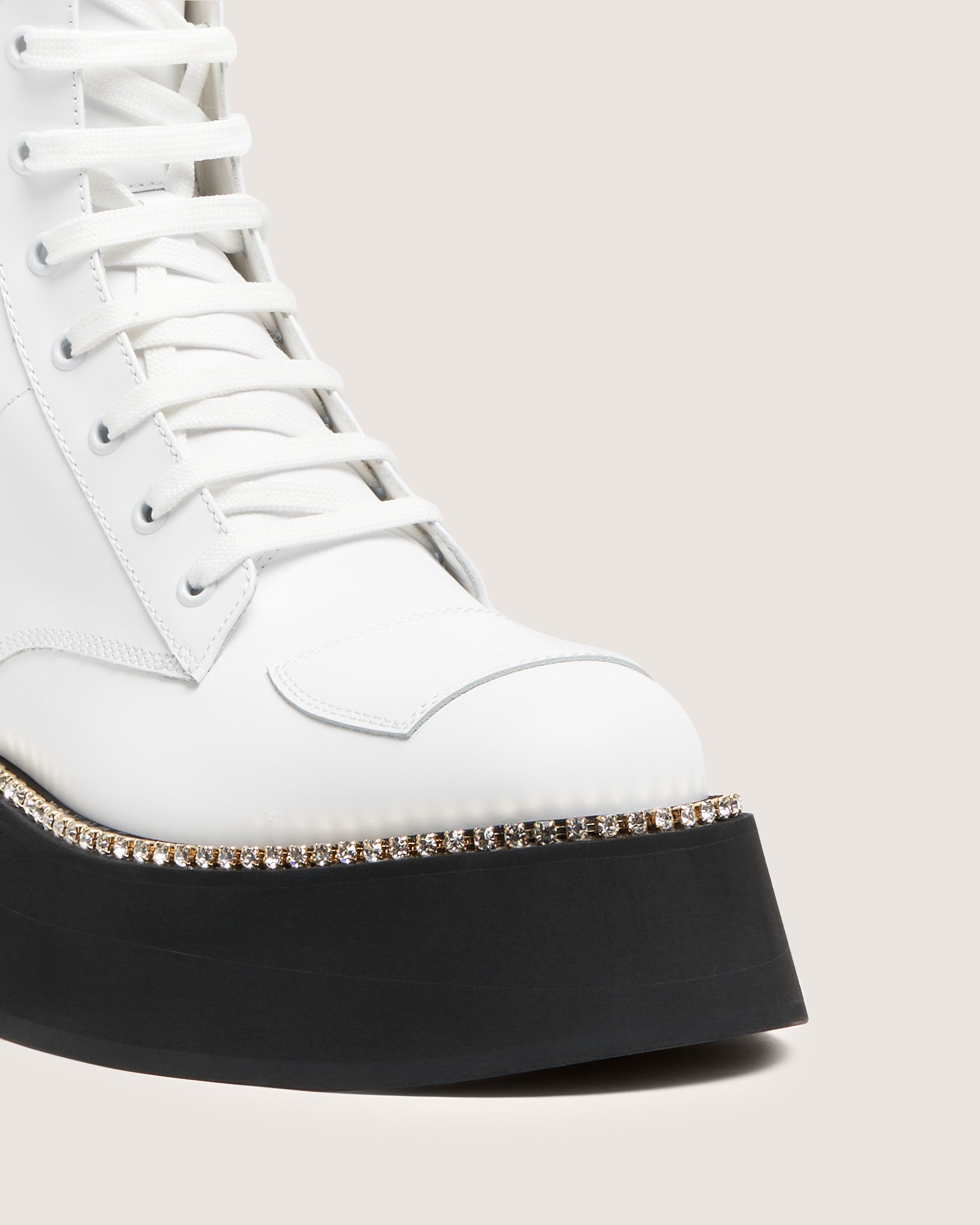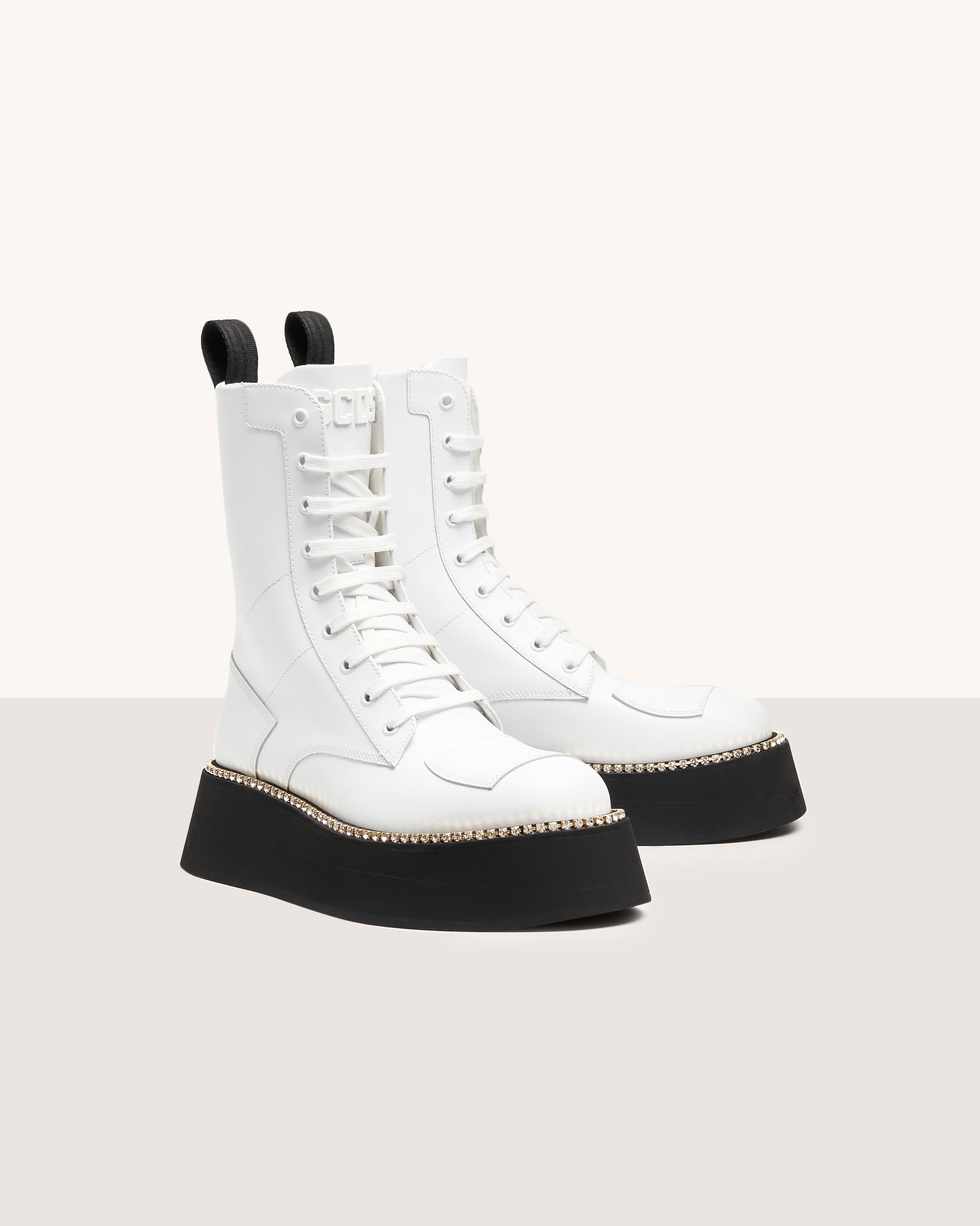 GCDS boots, brush off calf leather, with ultra-light micropore sole. Heat-sealed logo patch on the front. Preciosa rhinestone chain welt. Front lace-ups and inside zipper.