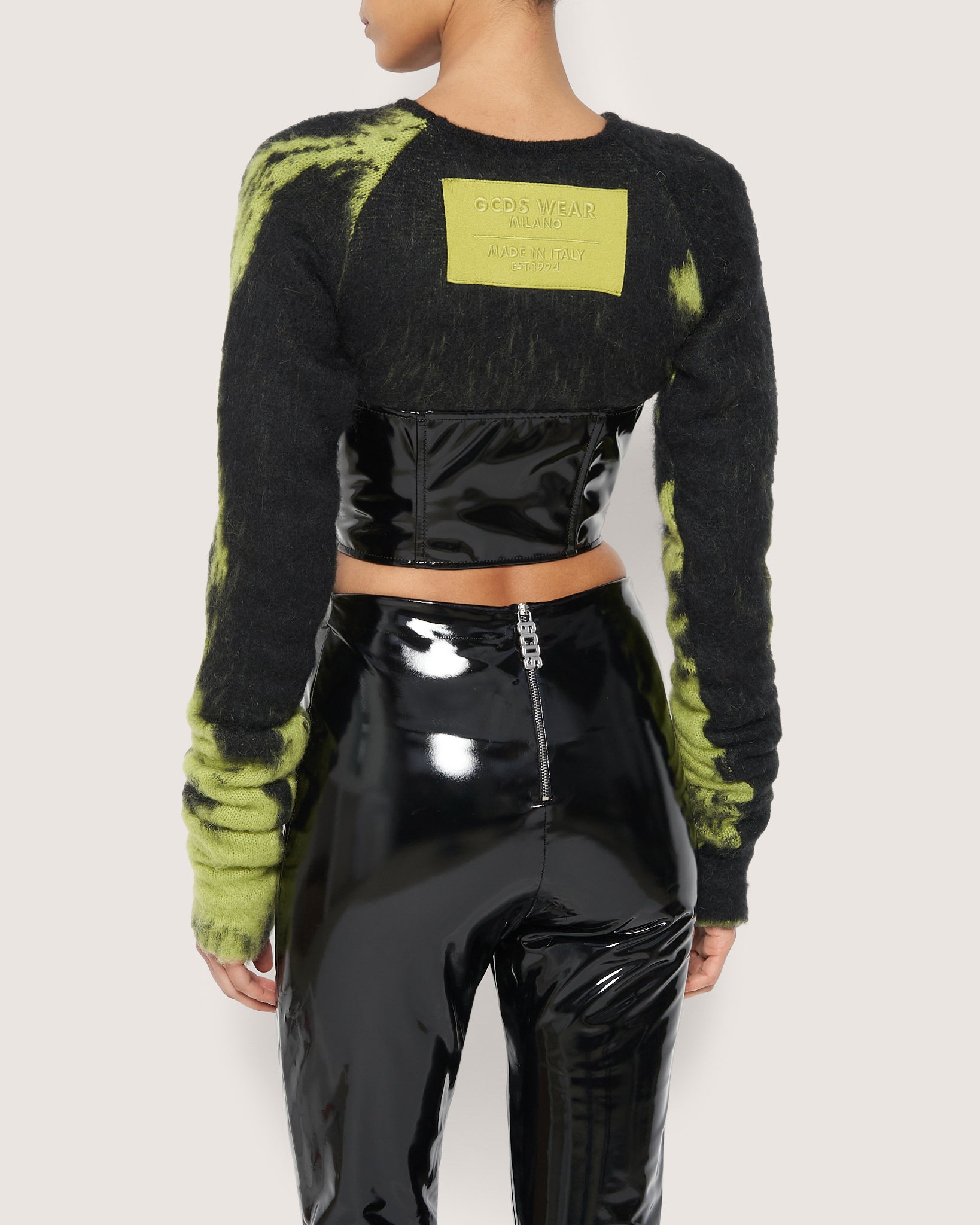 Mohair GCDS top with black vinyl corset. Upper section has raglan cut, extremely long sleeves. On the back, GCDS Wear logo patch with flat embroidery in the center. Vinyl corset, with underwire and boning for a better fit. Similar to the same deign of this season's Alcantara collection.