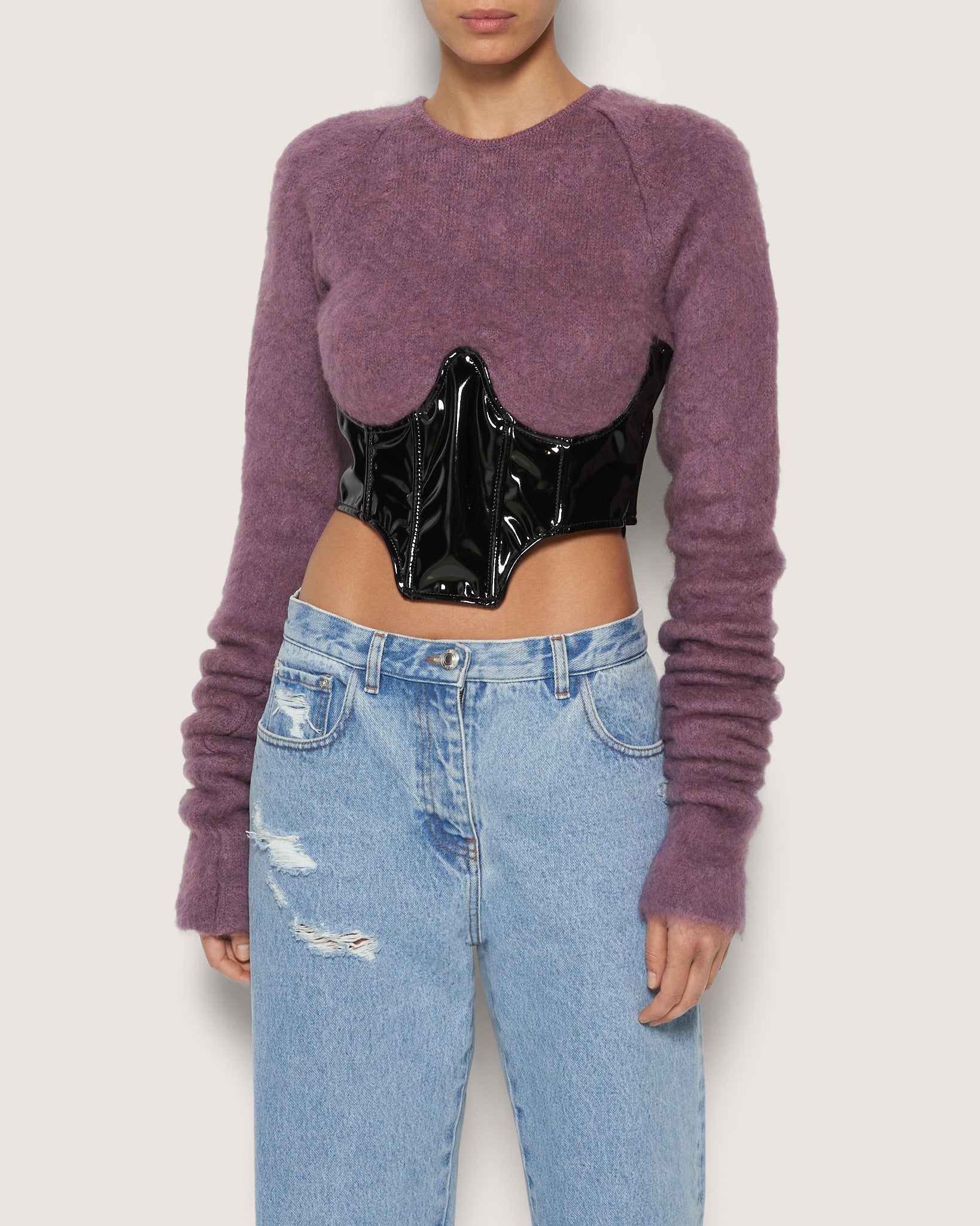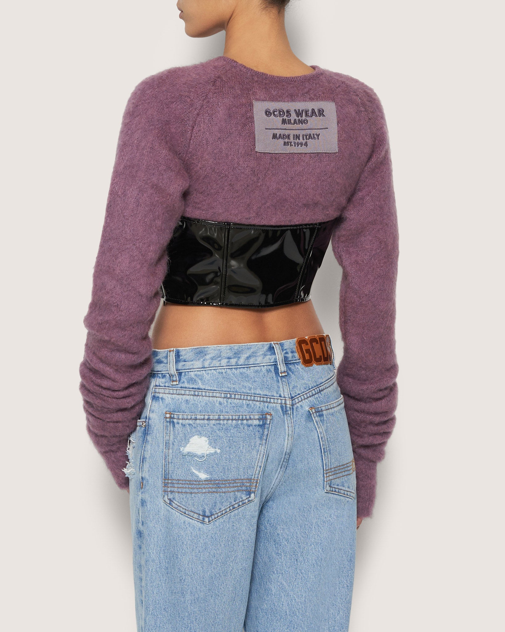Mohair GCDS top with black Vinyl corset, with underwire and boning for a better fit. Upper section has raglan cut, extremely long sleeves. On the back, GCDS Wear logo patch with flat embroidery in the center.