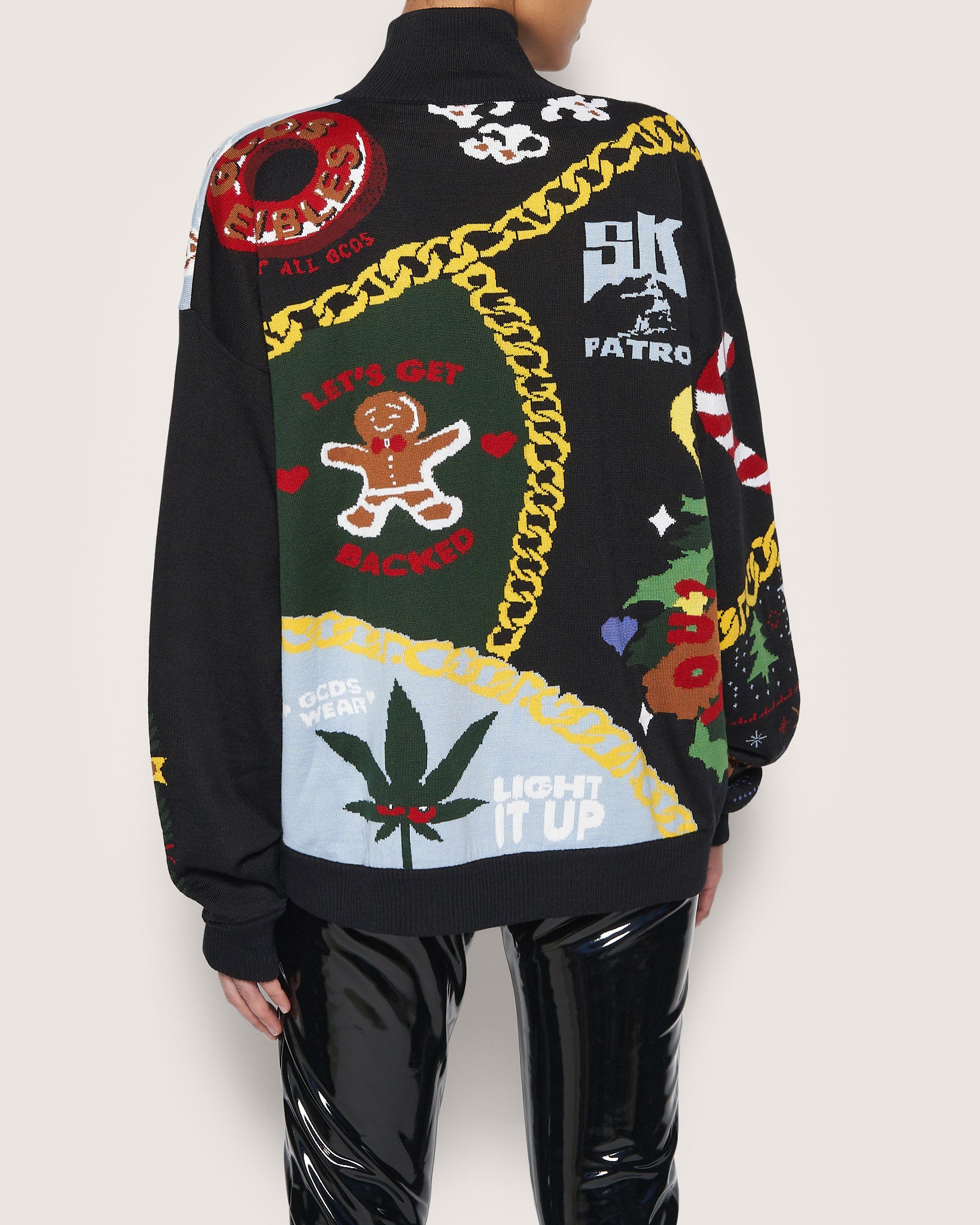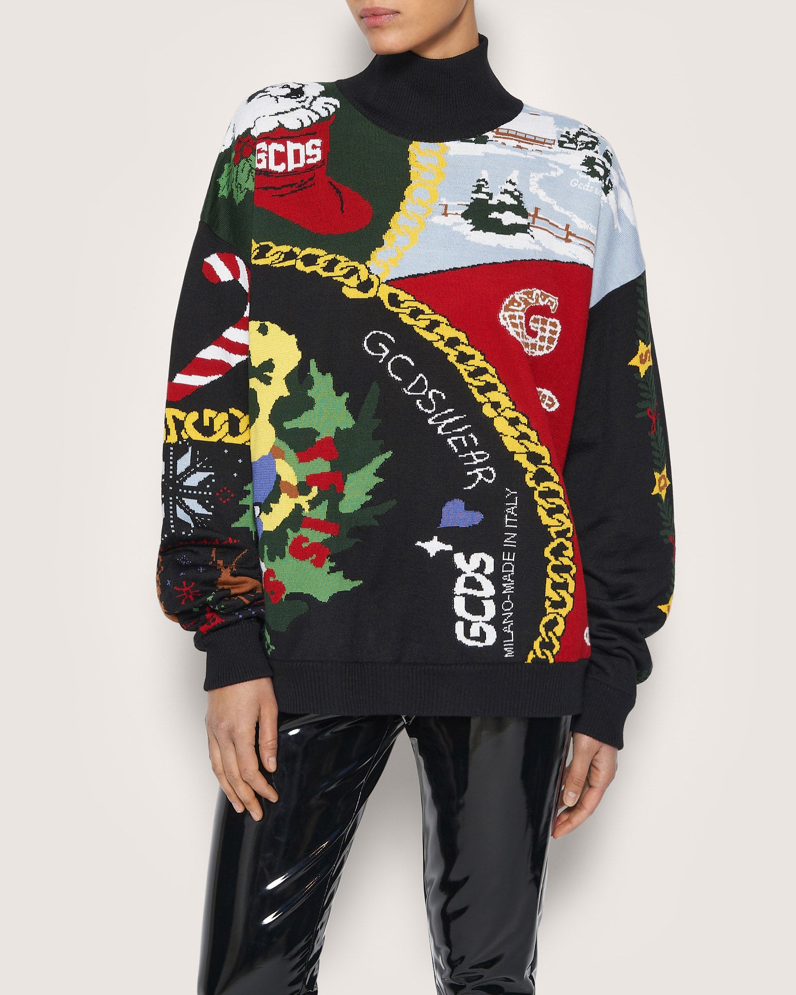 High-necked jersey GCDS sweater. Quintessential Christmas nostalgia themed graphics, new chain logo and mix of iconic GCDS graphics. Lightly over-sized.