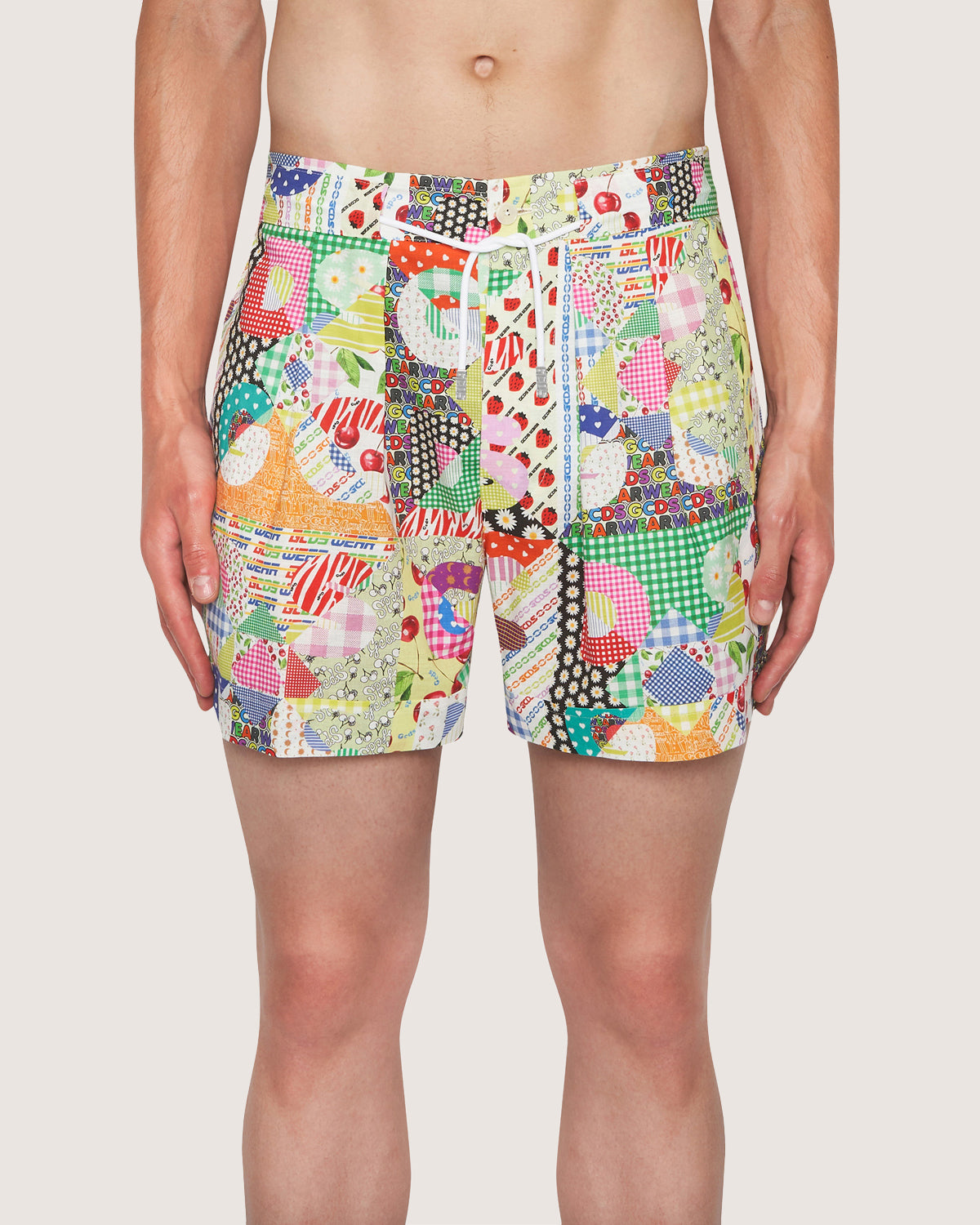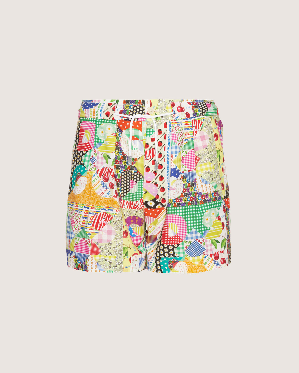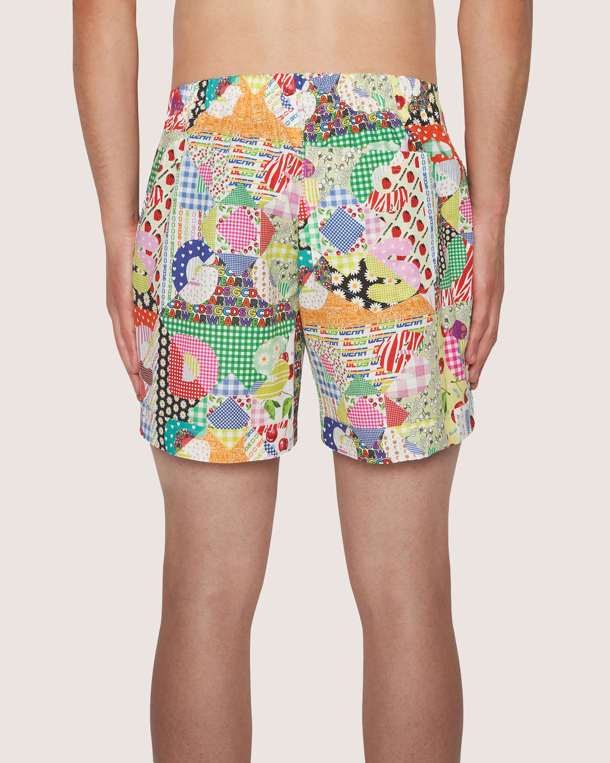 Boxer shorts with GCDS patchwork print and GCDS logo patch applied to the front.