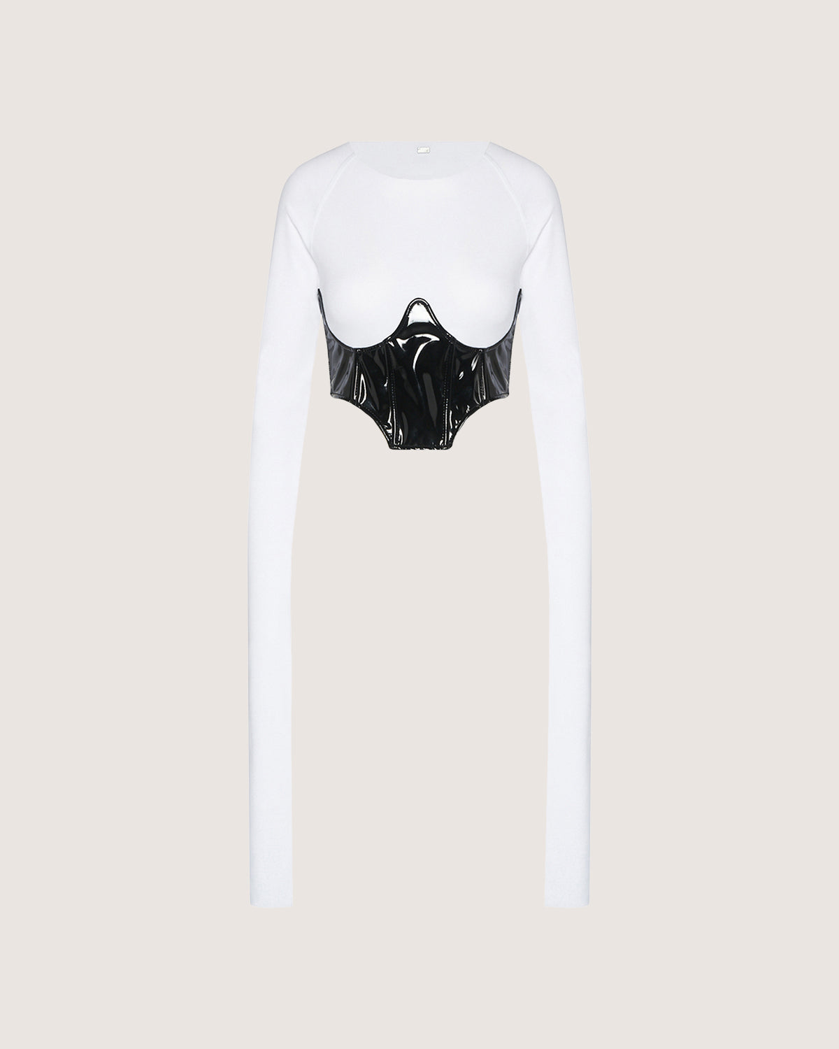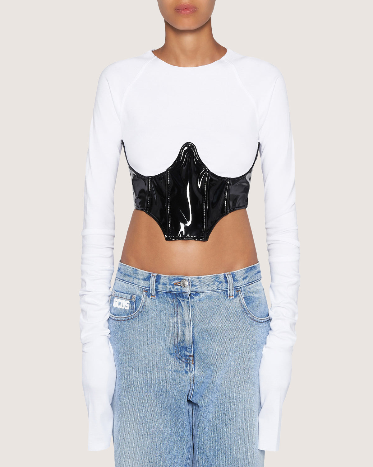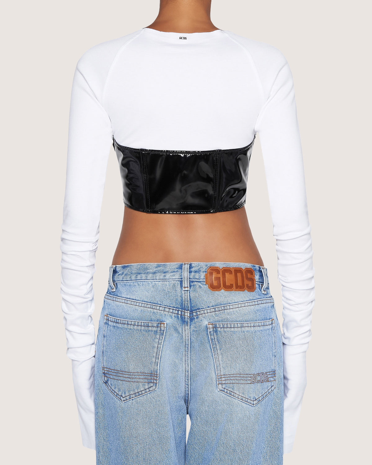 Cotton top with vinyl corset and inserted splints. Raglan cut and raw cut on sleeve bottom and crew neck. GCDS logo plaque applied on center back. Invisible zipper on left side.
