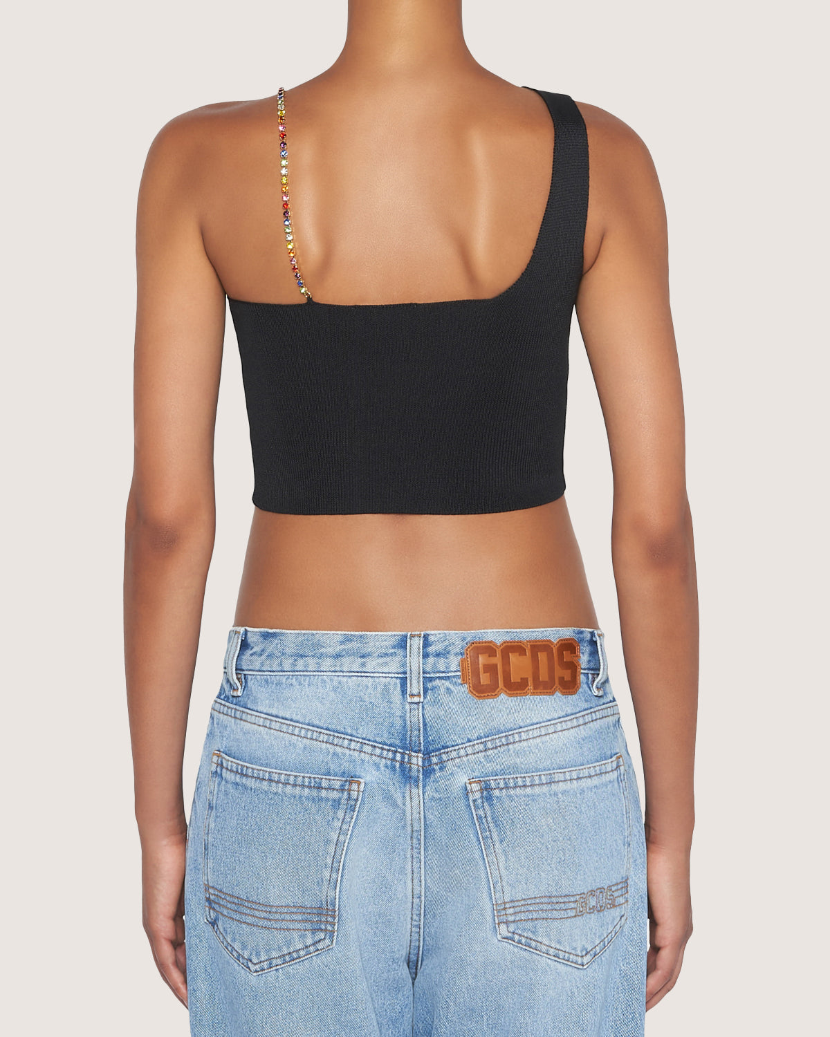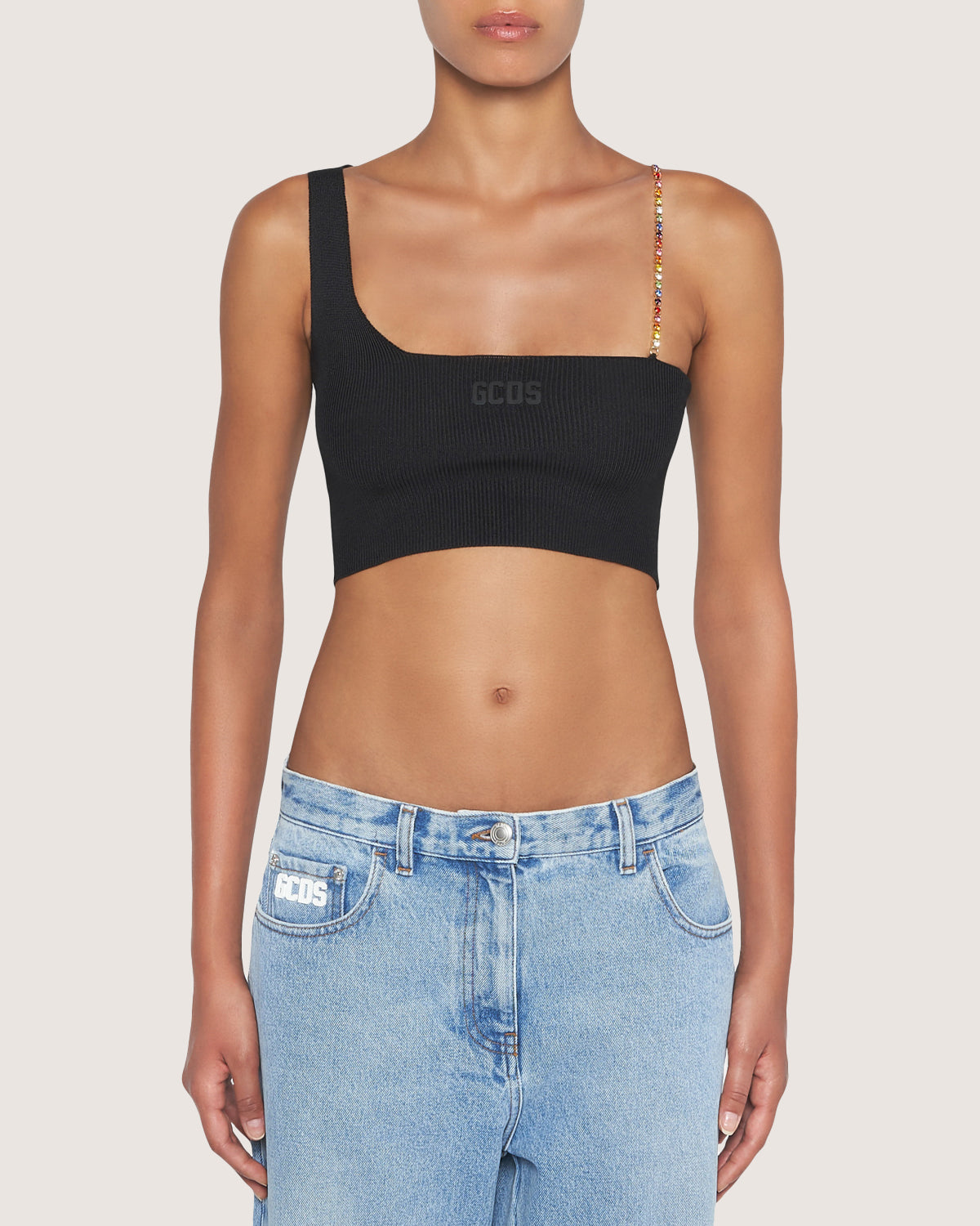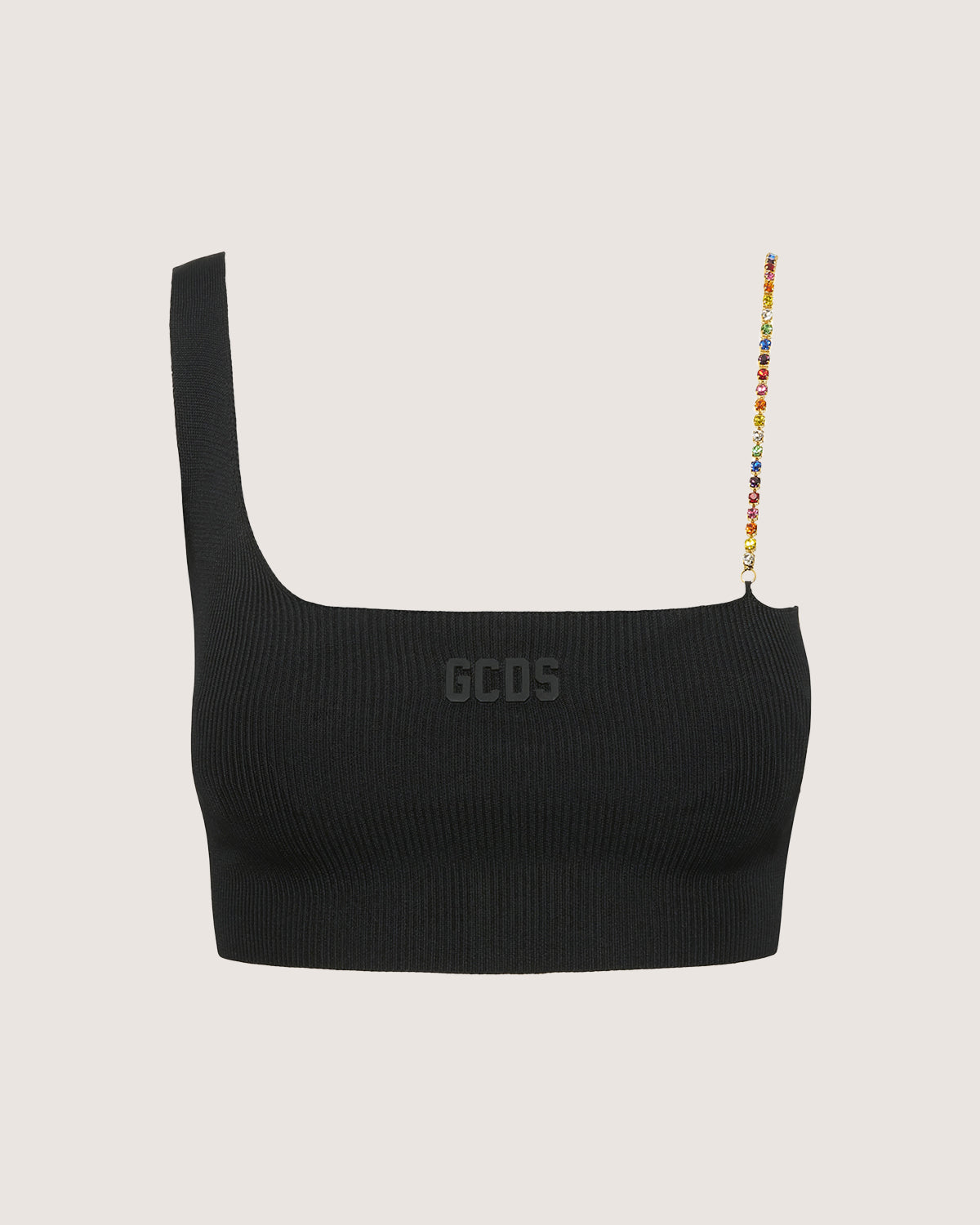 Mini crop top in solid stretch knit. Jewelled left shoulder strap with multicoloured crystals. Rubberized GCDS logo patch applied to the centre front.