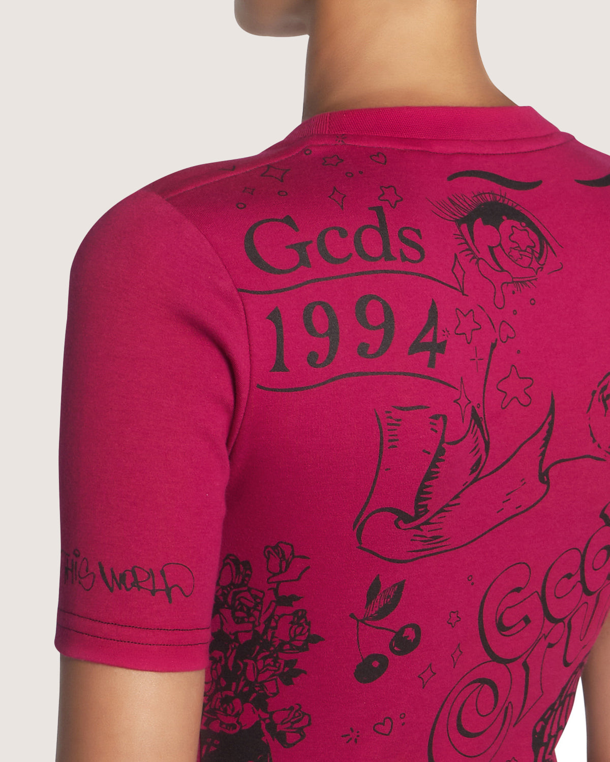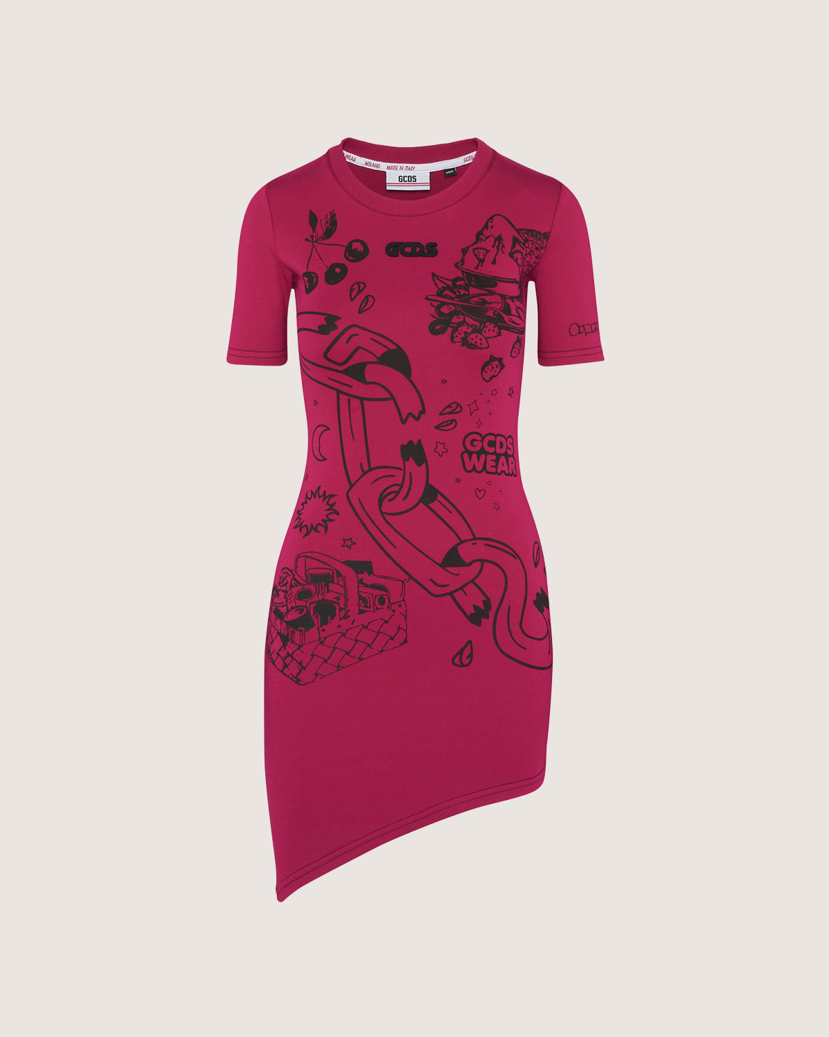 Cotton dress, short sleeves and asymmetrical cut. Contrasting seams. Graphic print placed on front and back. Contrasting rubberized logo patch applied on the center front.