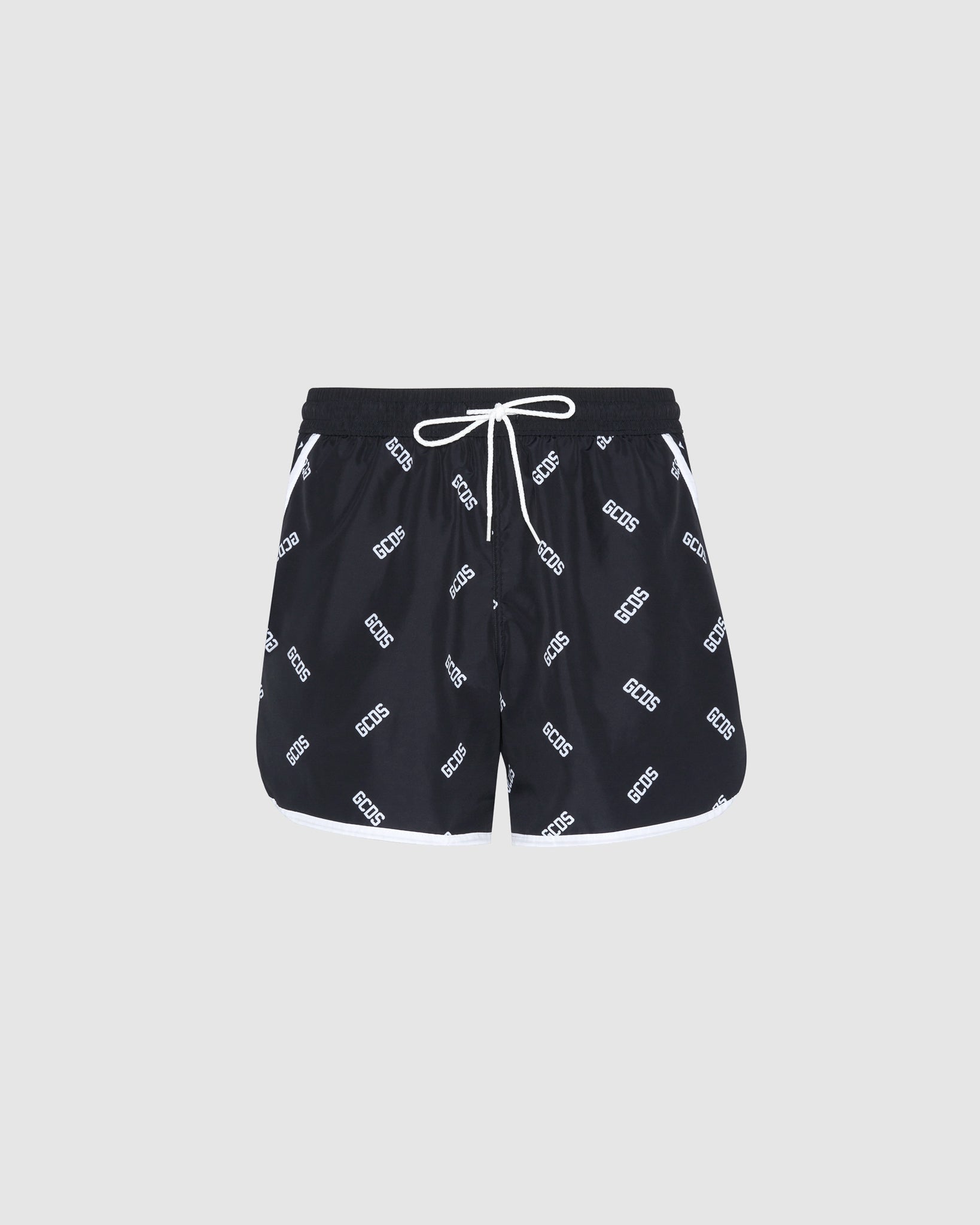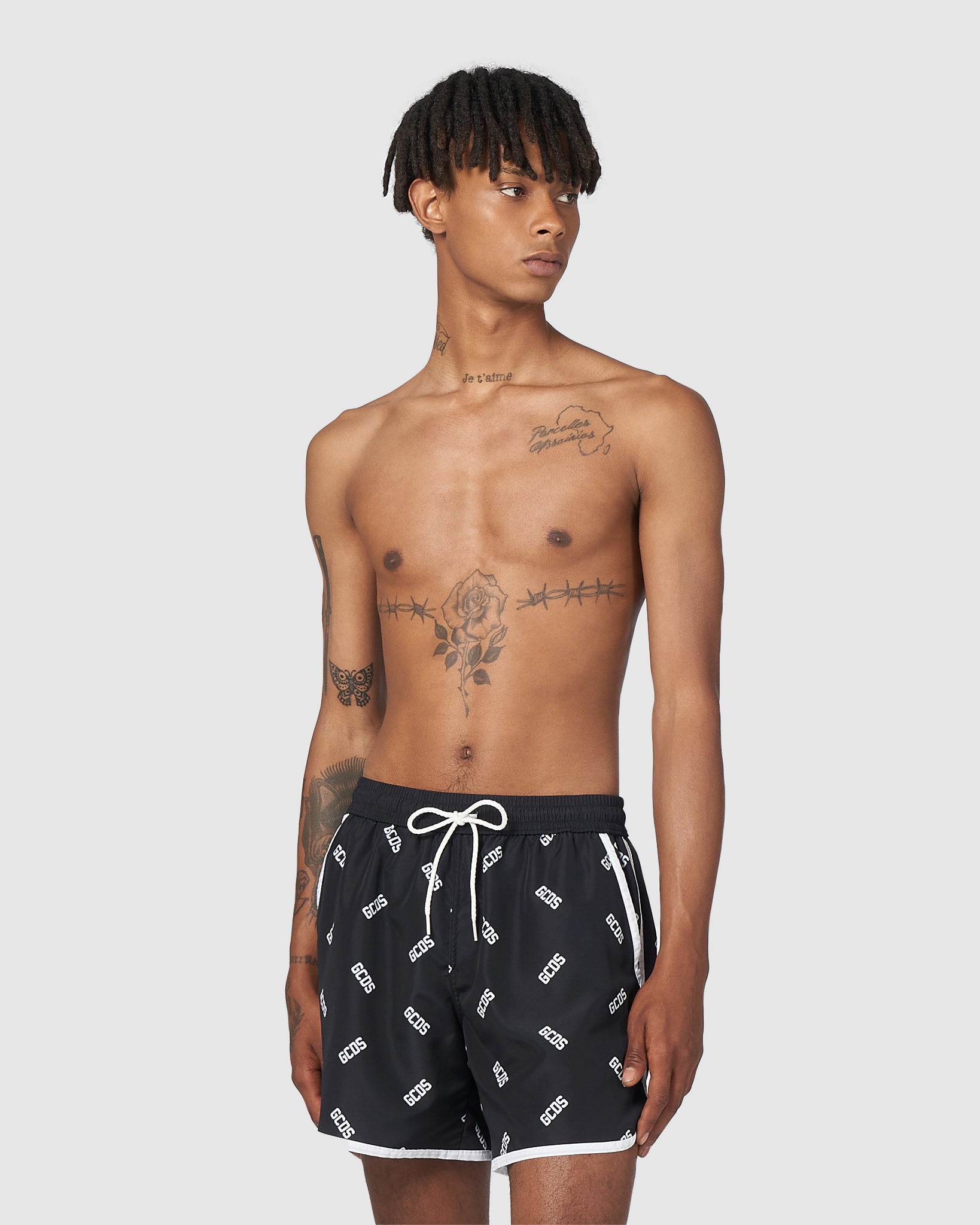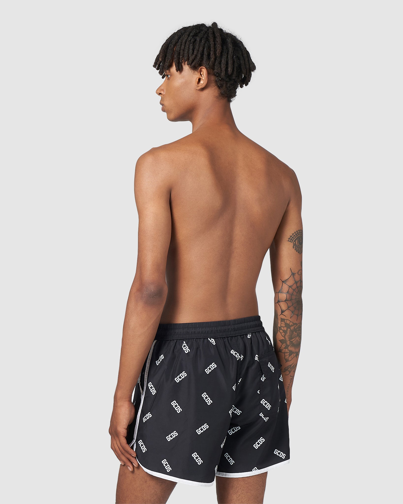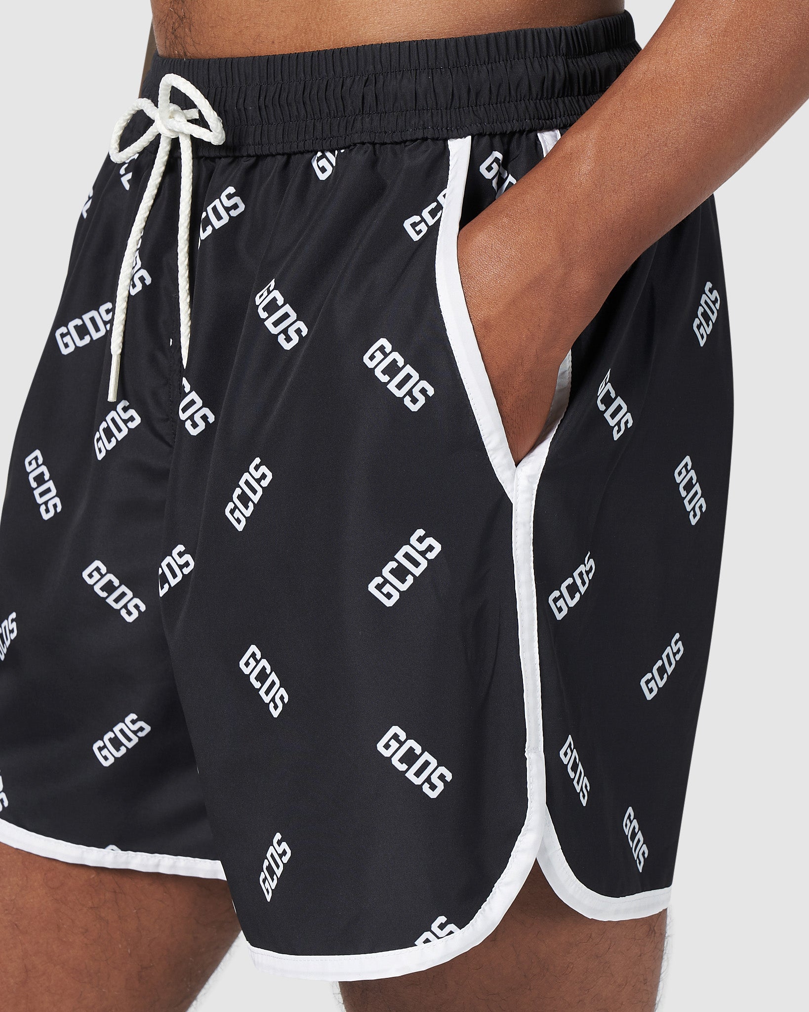 Nylon GCDS running-style swim shorts, with curved hem and contrast trim. All-over logo print. Slash pockets. Elastic waistband with contrast drawstring. Rear Velcro pocket.