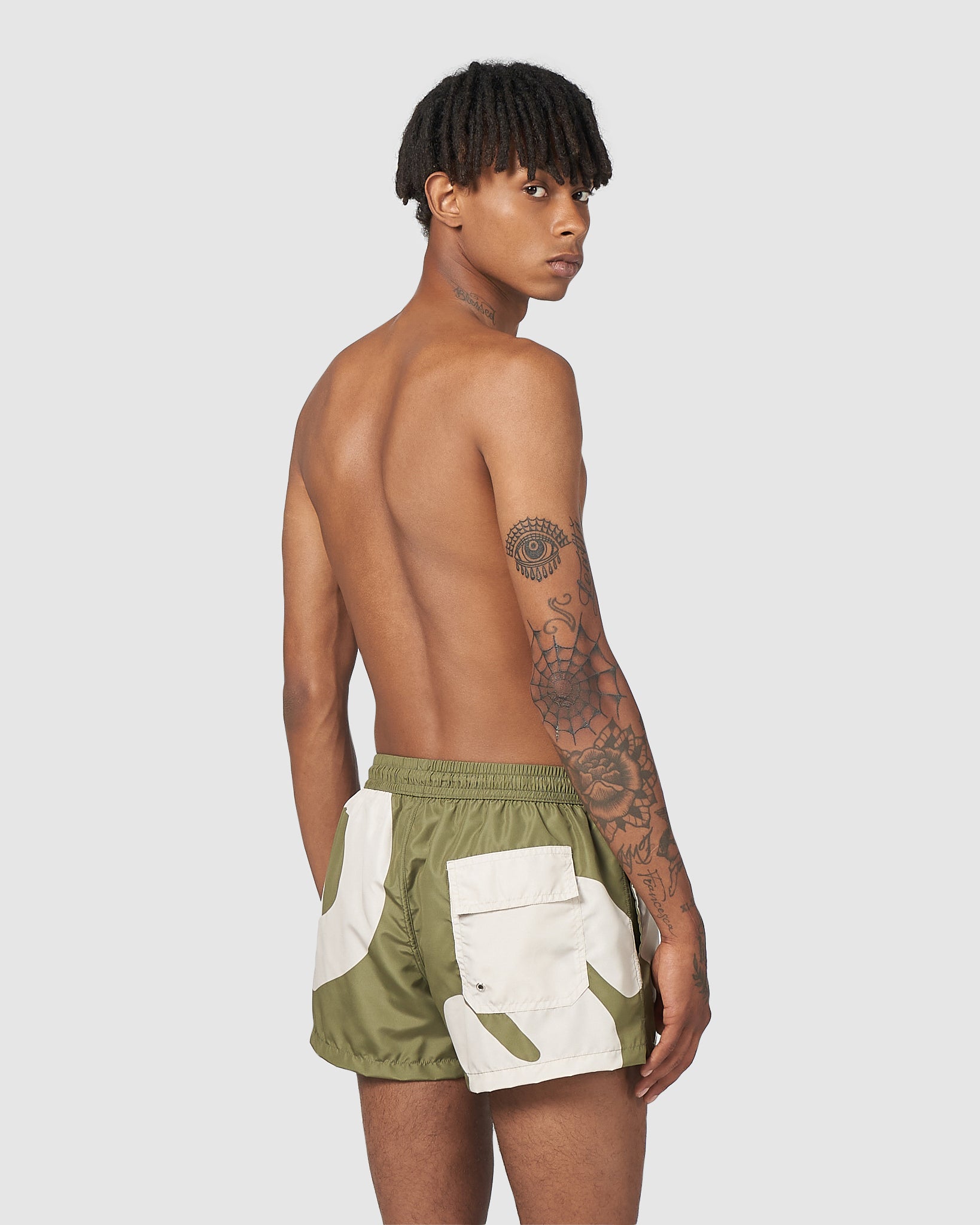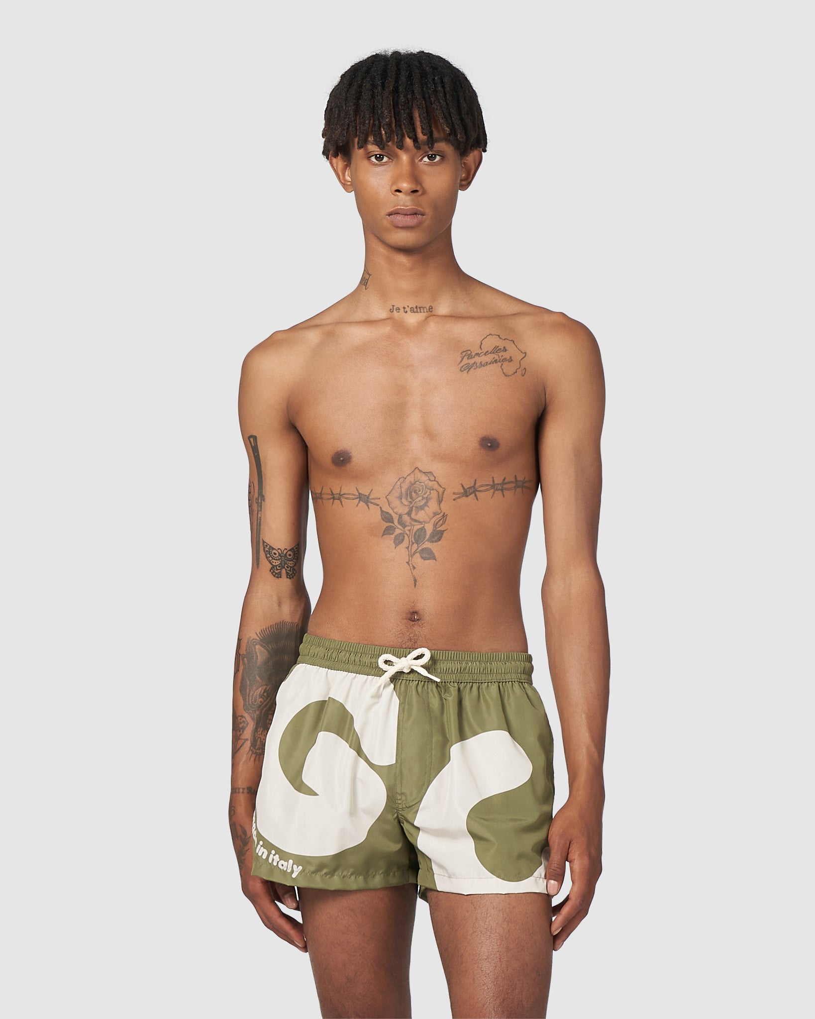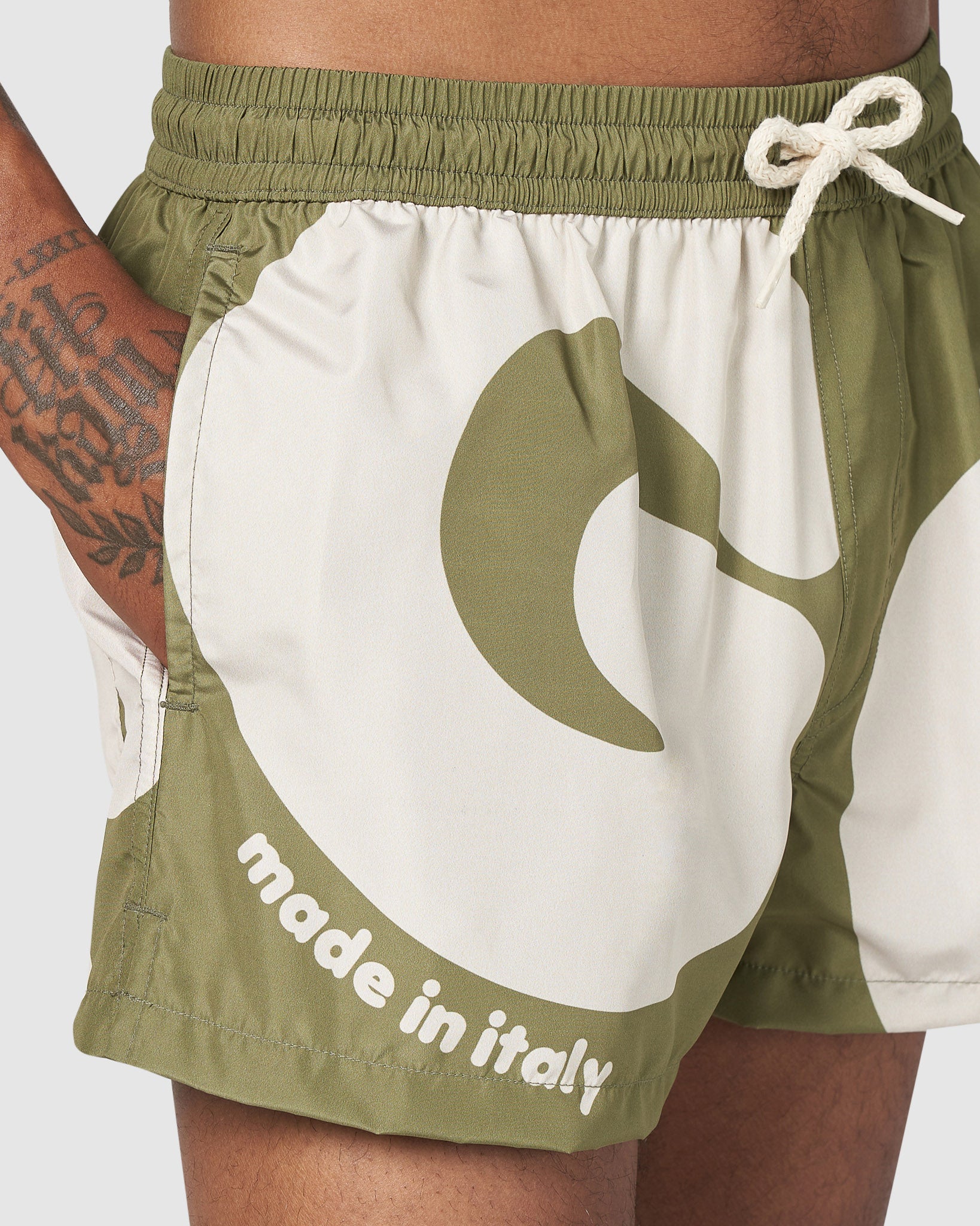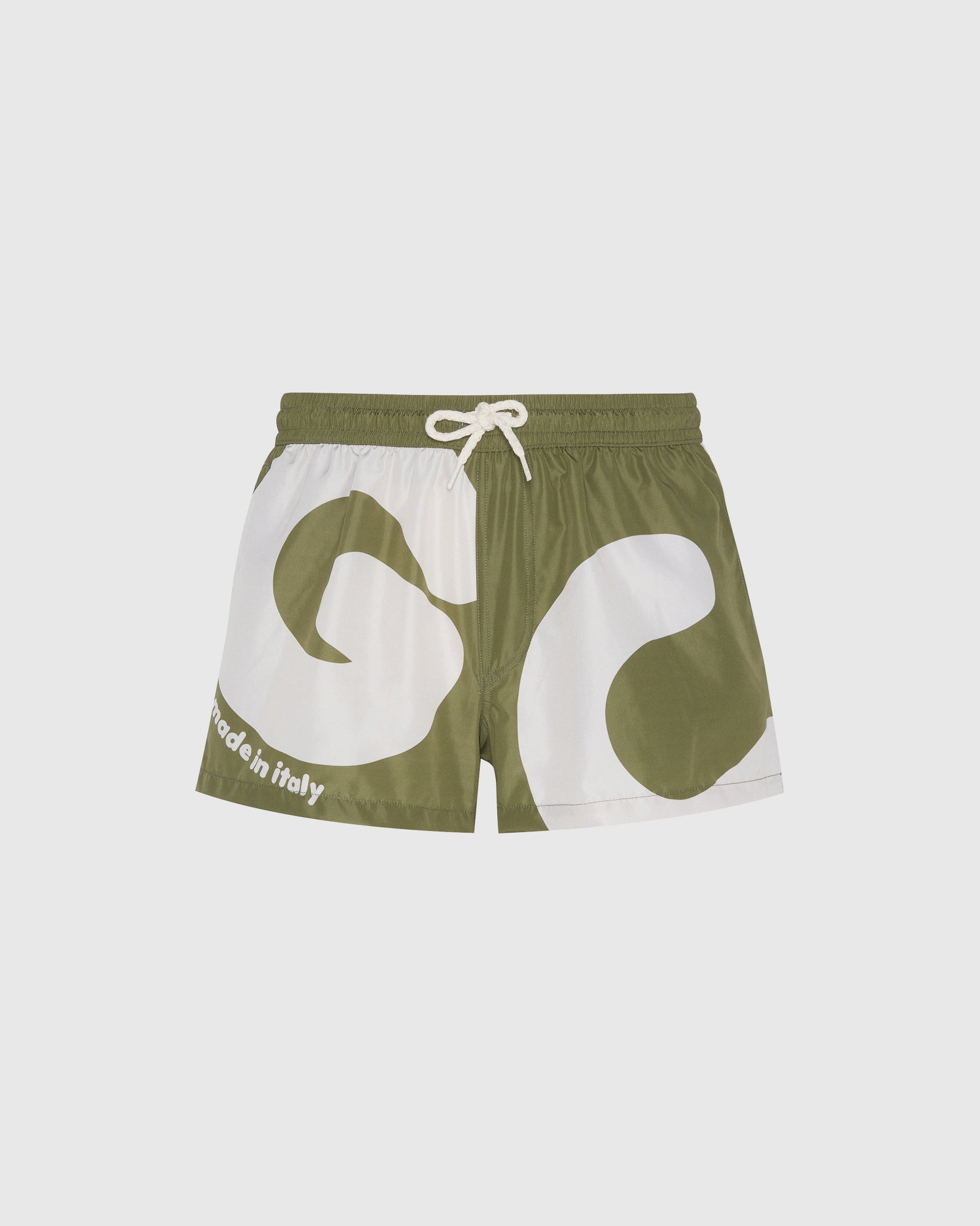 Nylon GCDS swim shorts with Andy maxi logo digital print front and back. Made in Italy print on the front. Side slits. Welt pockets. Elastic waistband and drawstring. Rear Velcro pocket.
