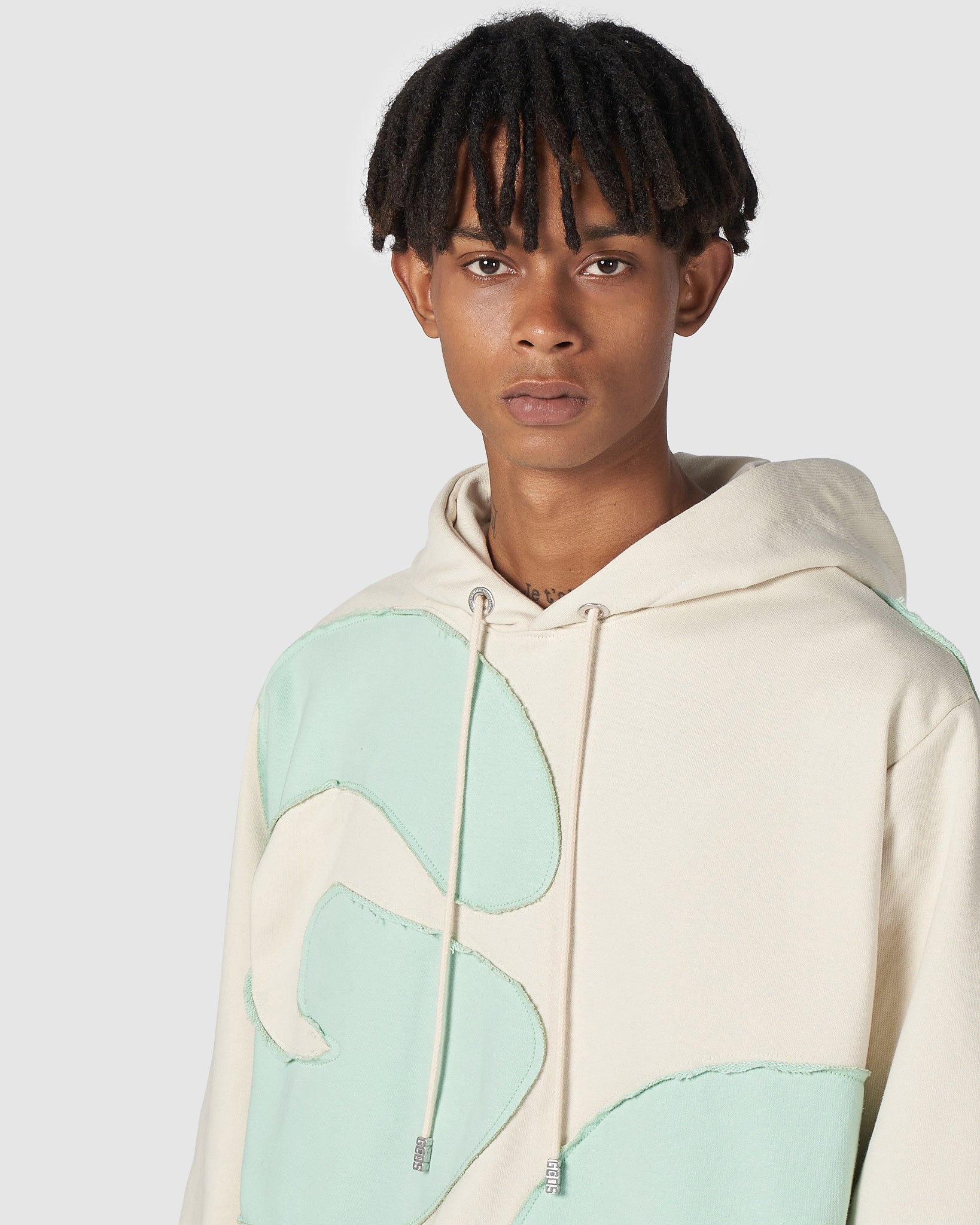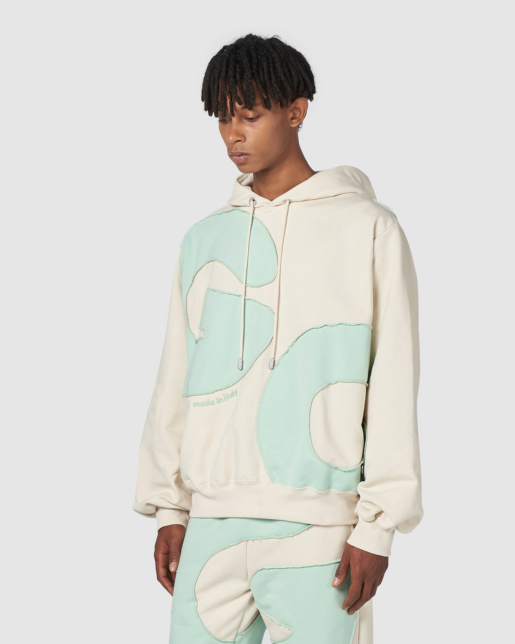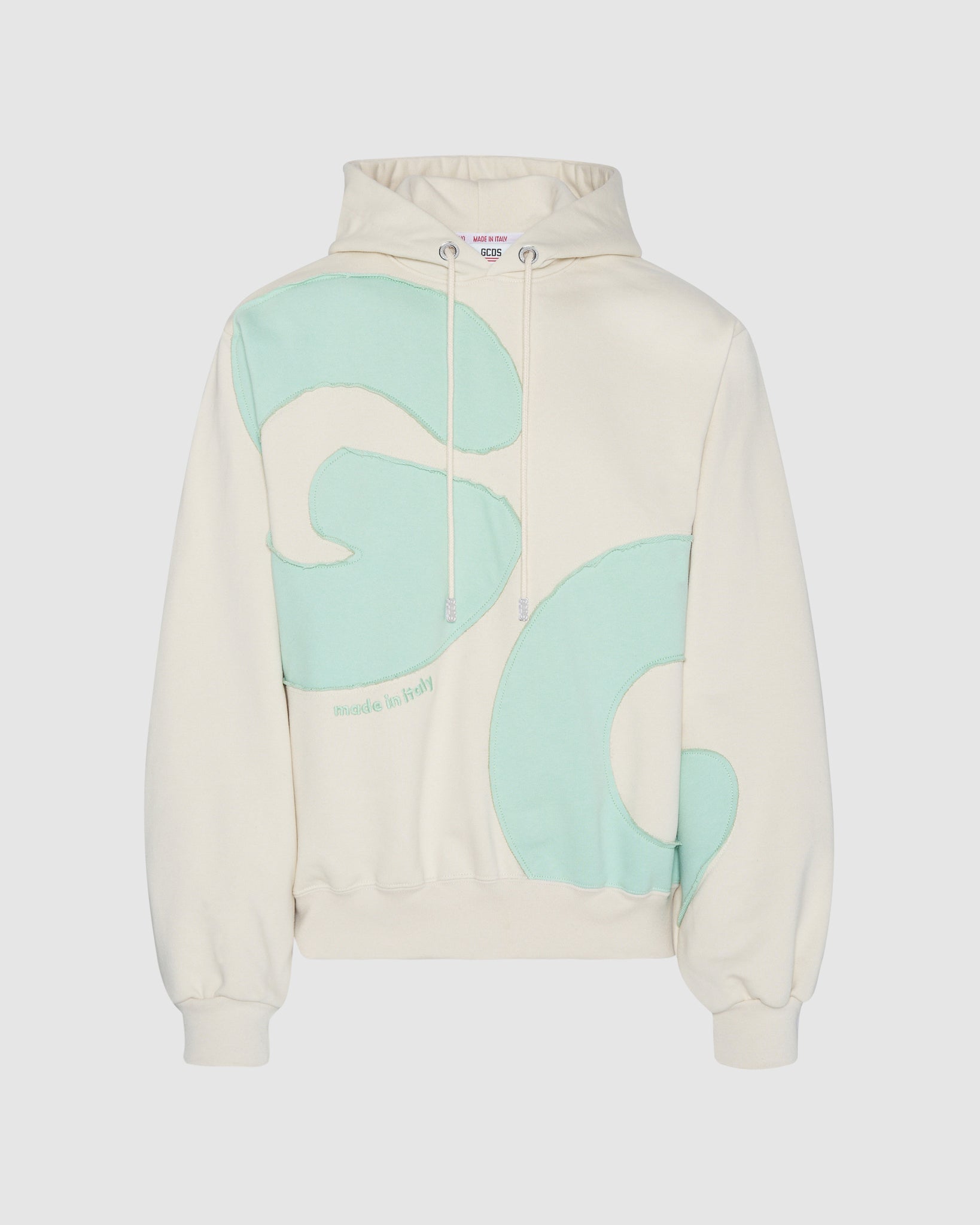 Long-sleeved GCDS hoodie with adjustable hood. Raw-cut maxi Andy logo appliquéd with topstitching on the front and back. Made in Italy embroidery on the front. Over-sized.