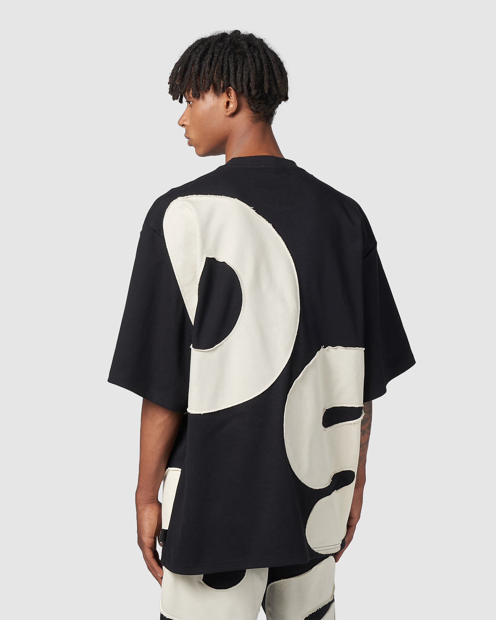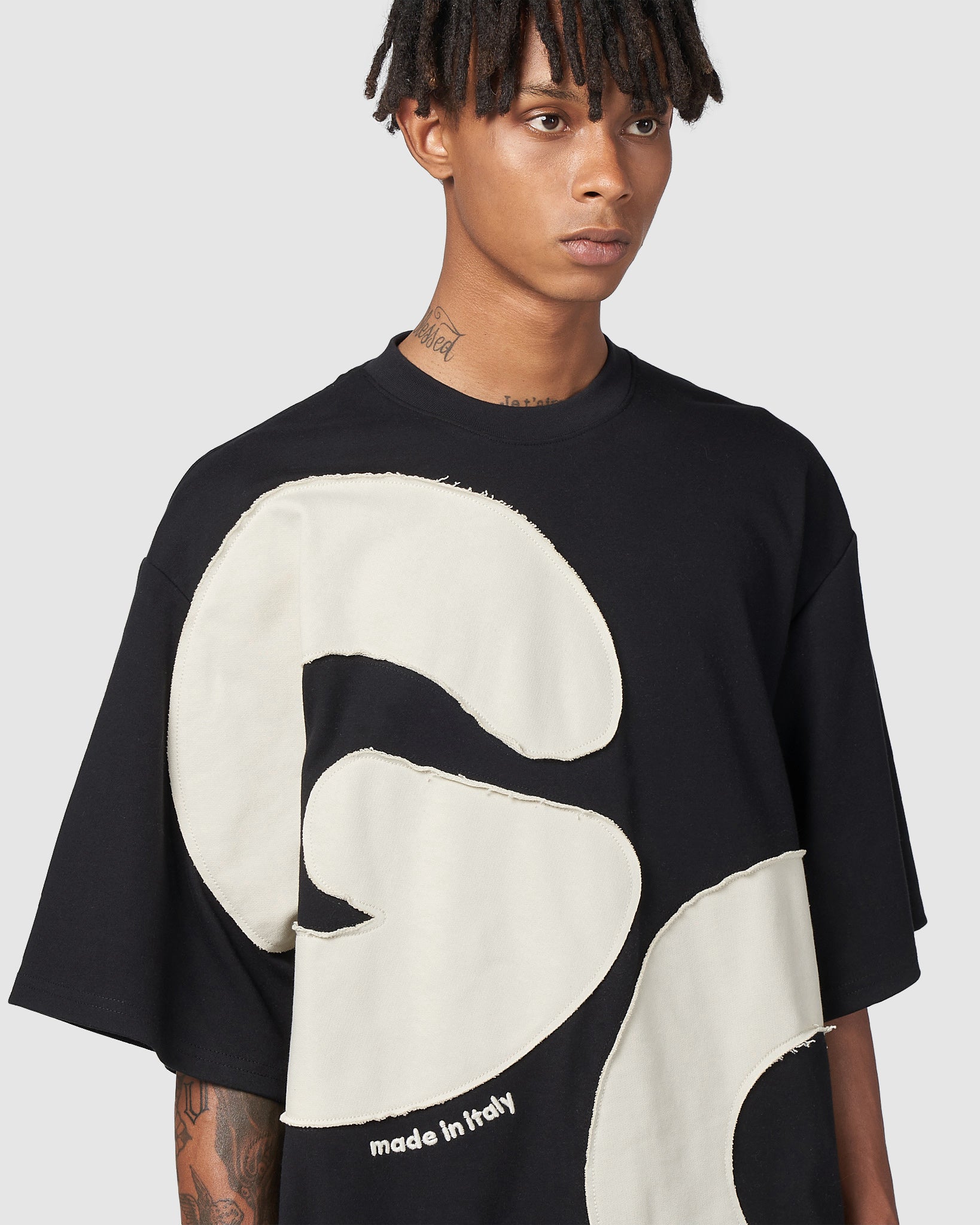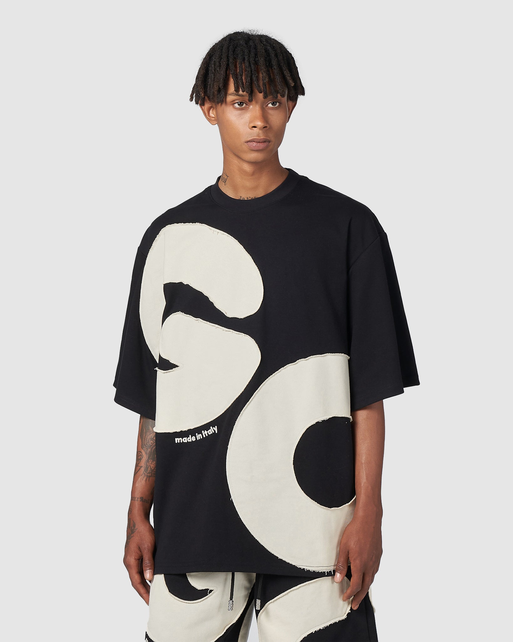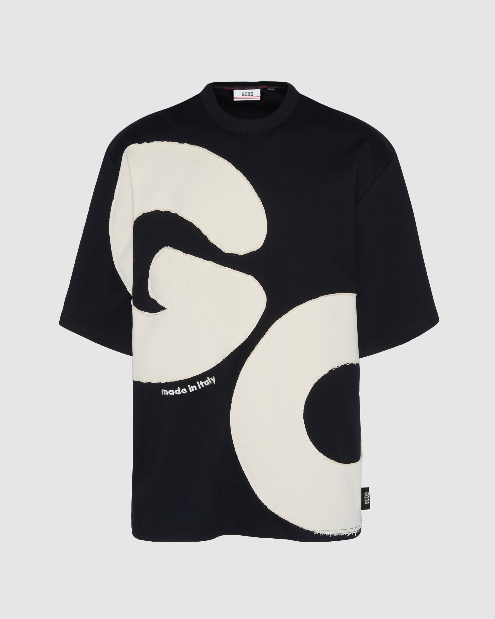 Cotton GCDS T-shirt with raw-cut maxi Andy logo appliquéd with topstitching on the front and back. Made in Italy embroidery on the front. Over-sized.