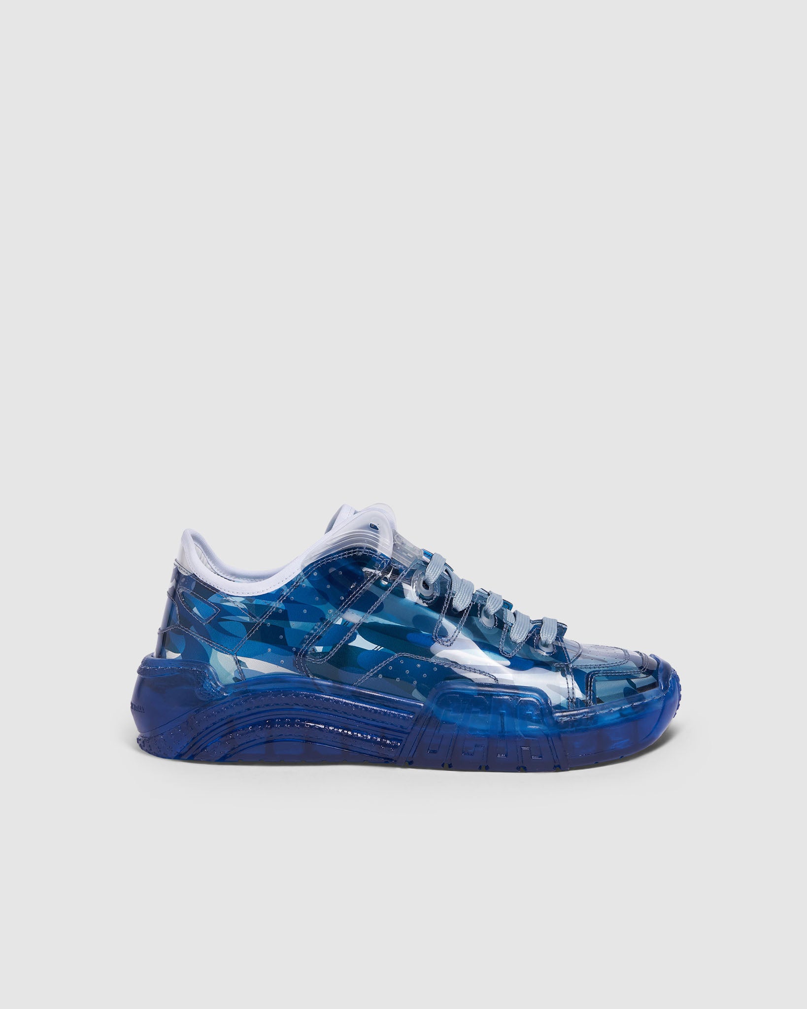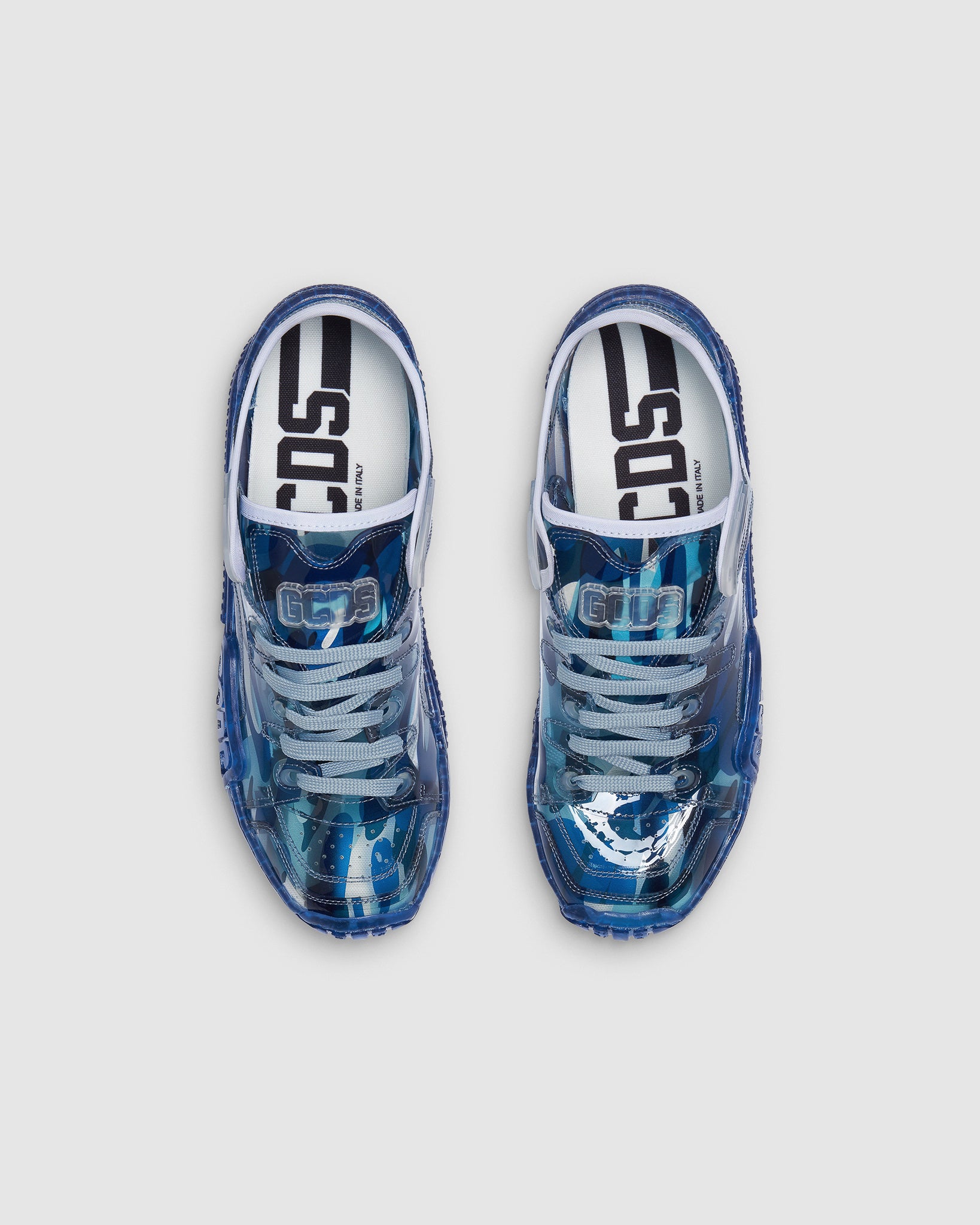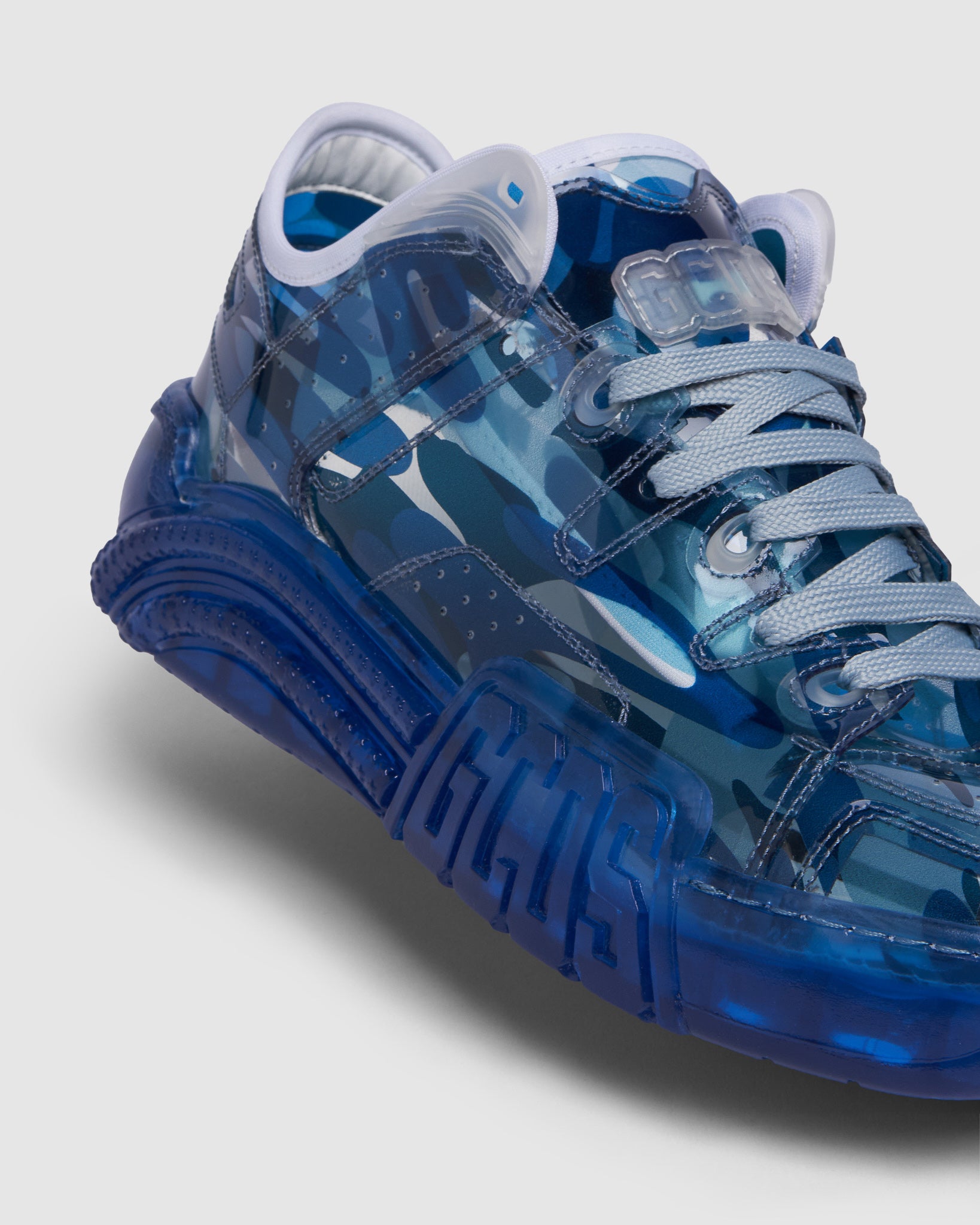 Clear PVC camouflage motif GCDS sneakers, inspired by the late ‘90s. The vamp features several seams with rubber inserts and matching topstitching. Tongue with logo on the front. Sole, similar to skateboarding shoes, with star pattern bands and GCDS logo spoiler on the side. Tone on tone laces.