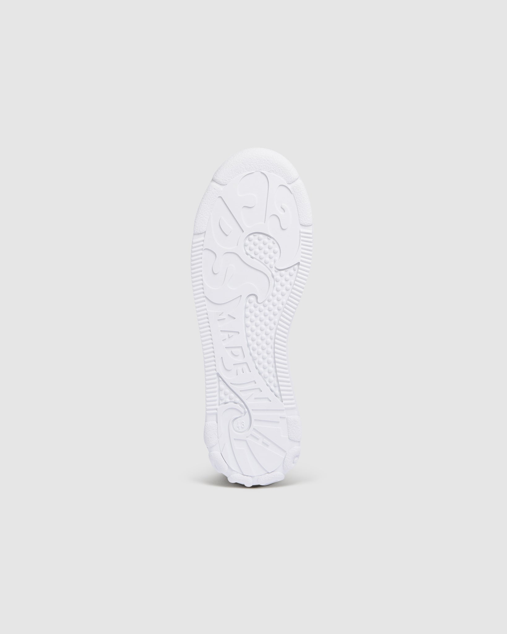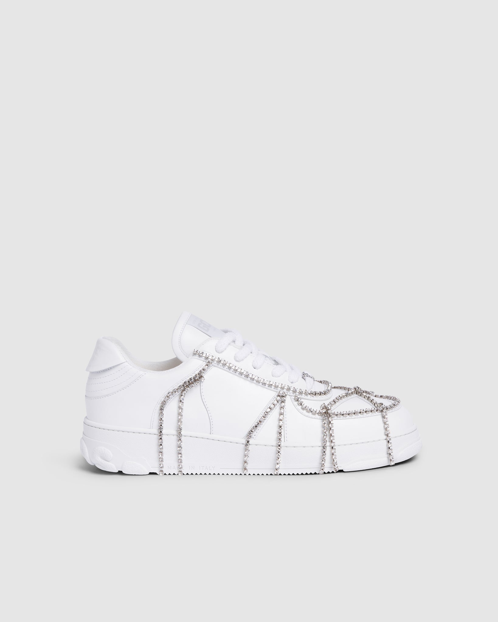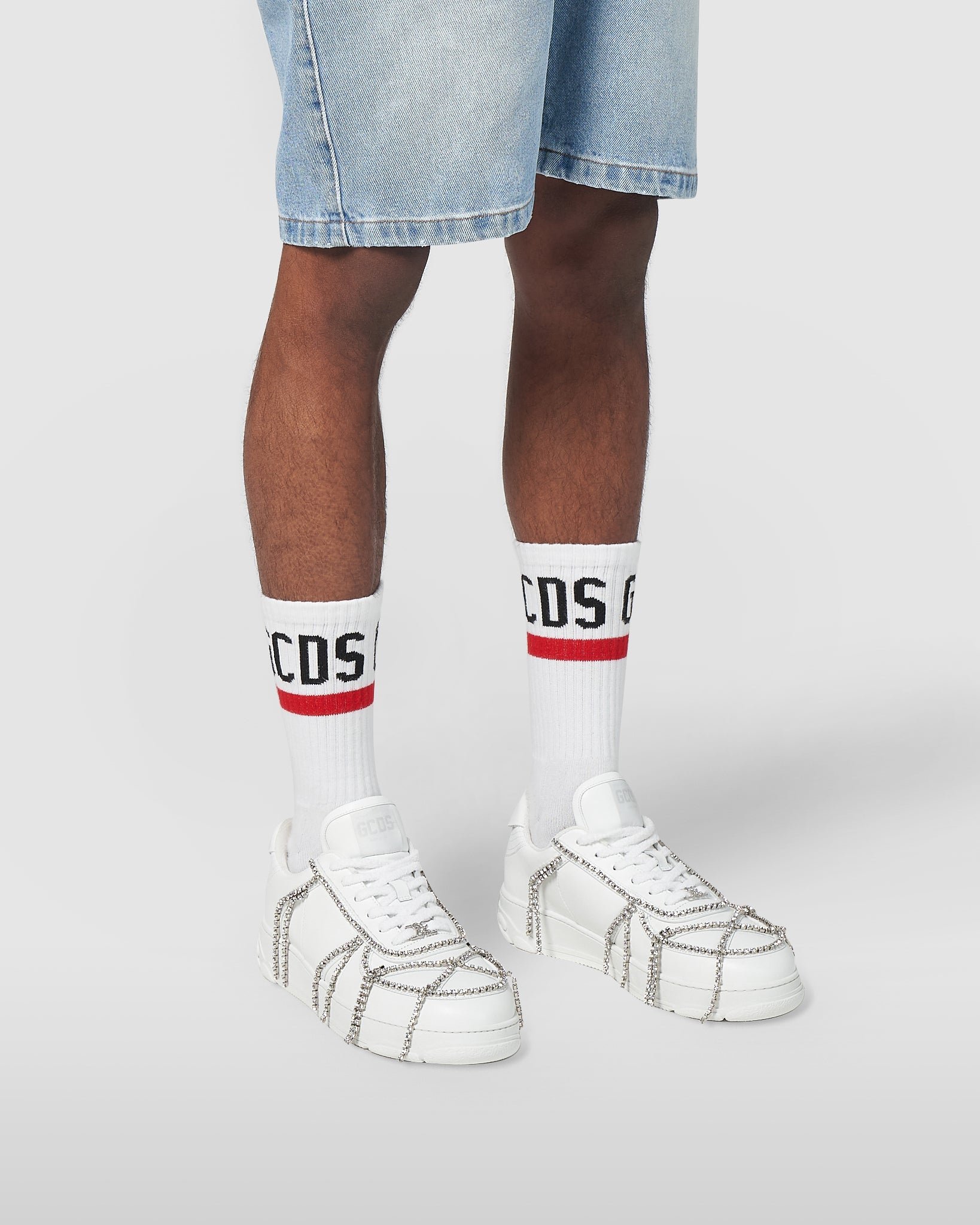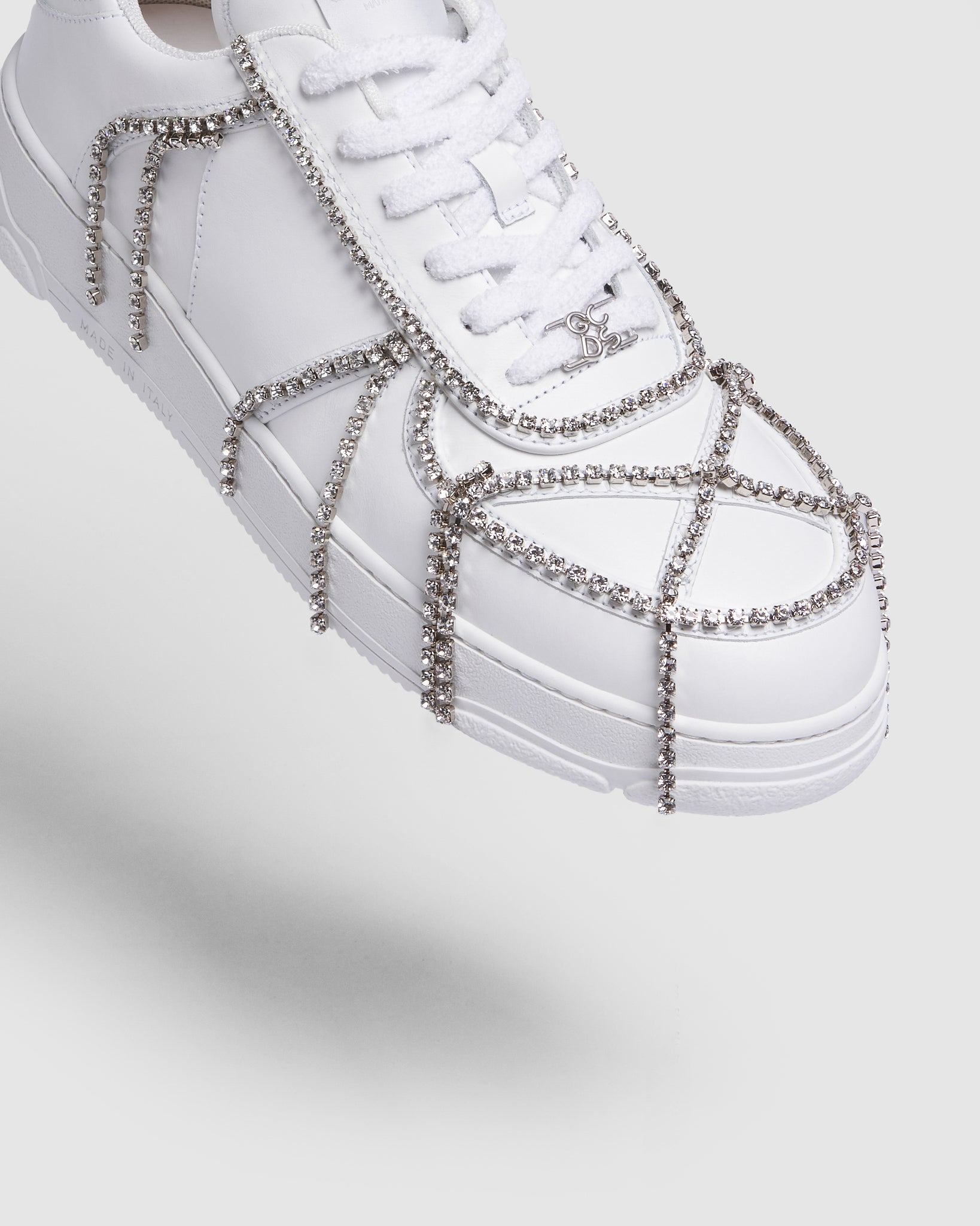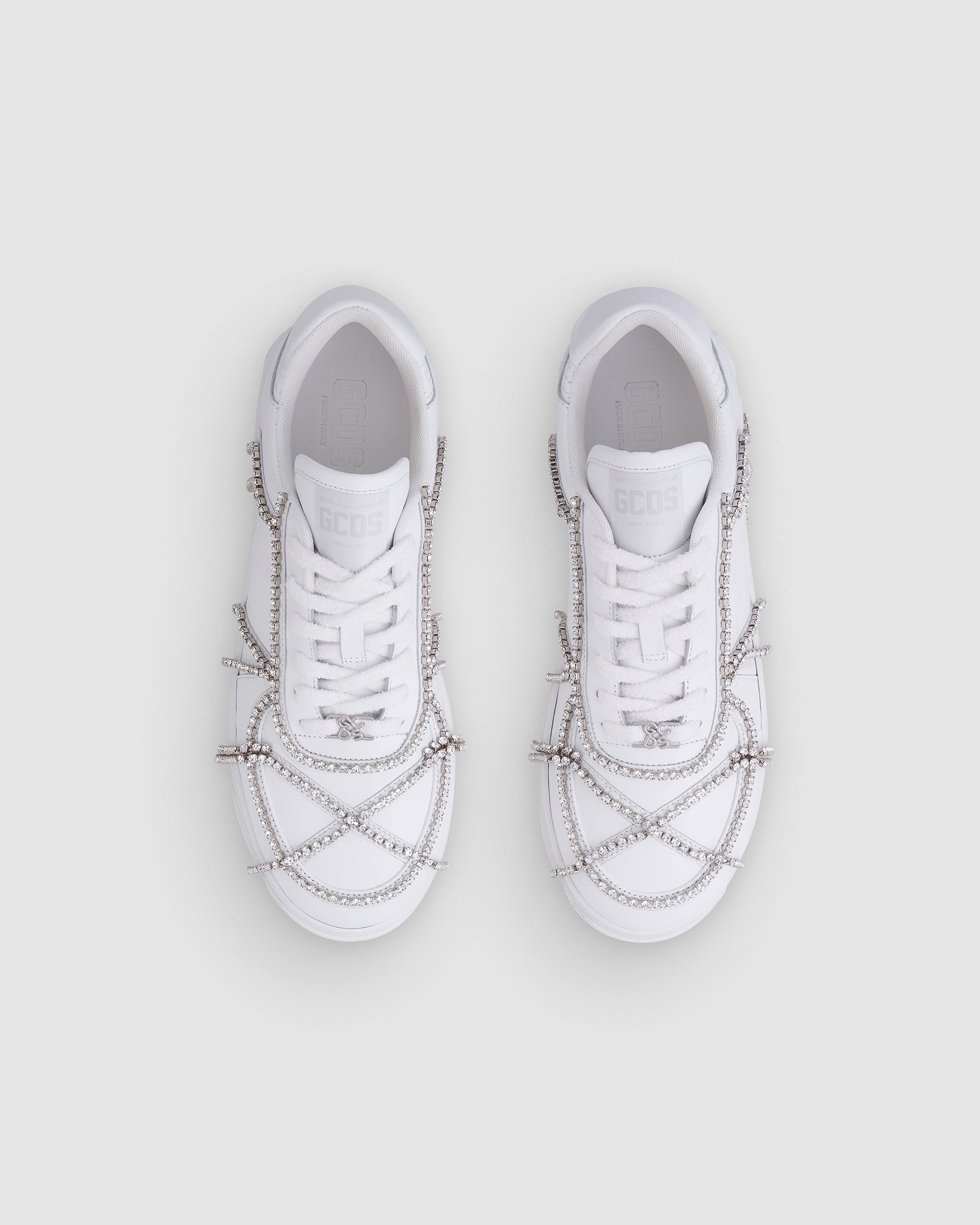 Basketball-inspired GCDS sneakers with a sports aesthetic. Vamp in white calfskin leather, featuring prominent seams, entirely trimmed with chains of crystals by Preciosa, with fringes applied by hand. Toebox with crystals by Preciosa. Nami box sole in the classic wave shape with logo on the outsole. Matching laces and Andy logo deubré.
