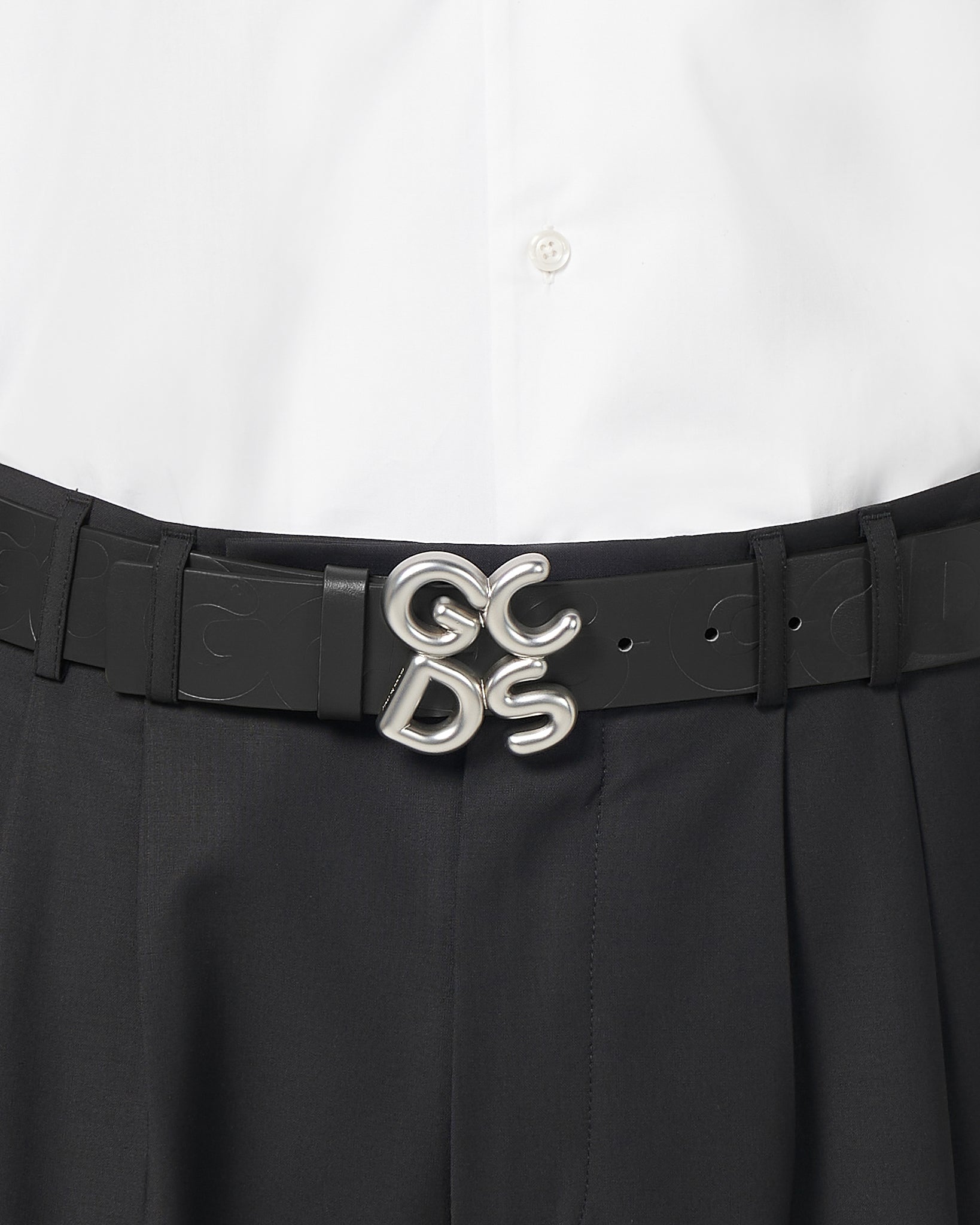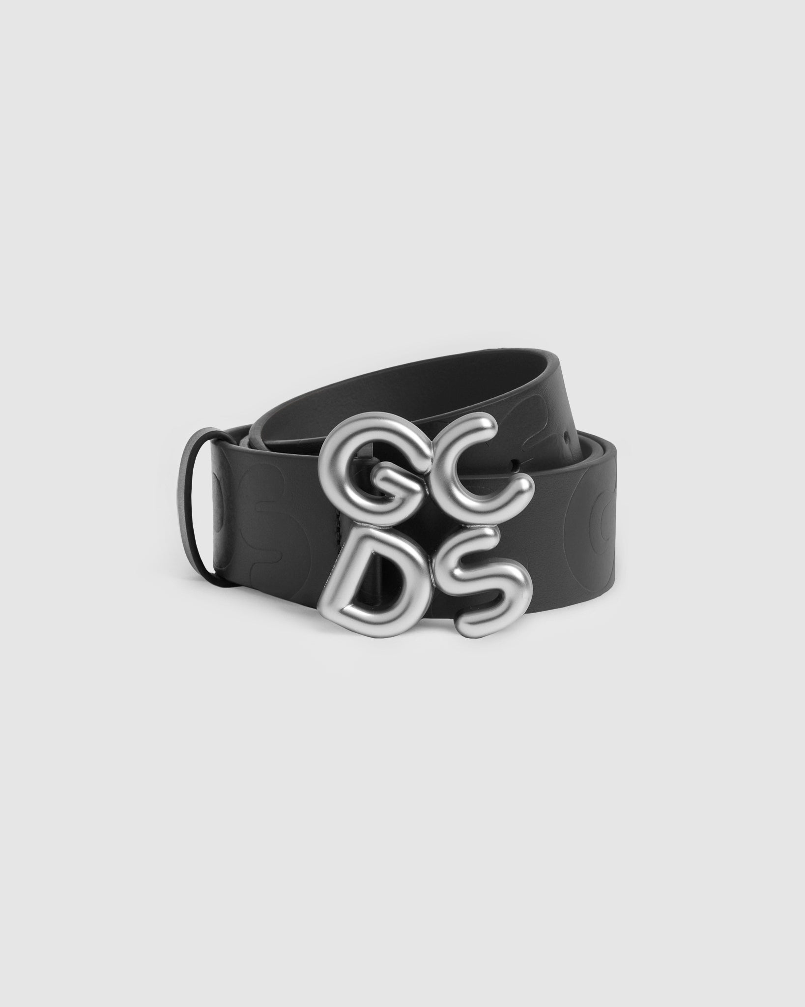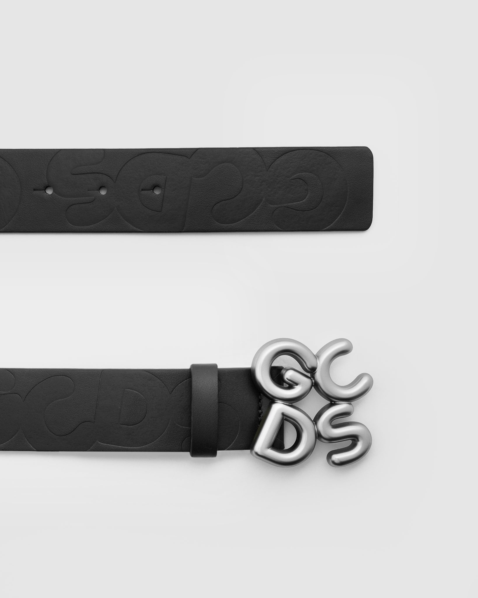 Leather GCDS belt with loops and new rounded Andy logo buckle. On the strap, embossed maxi Andy logo.