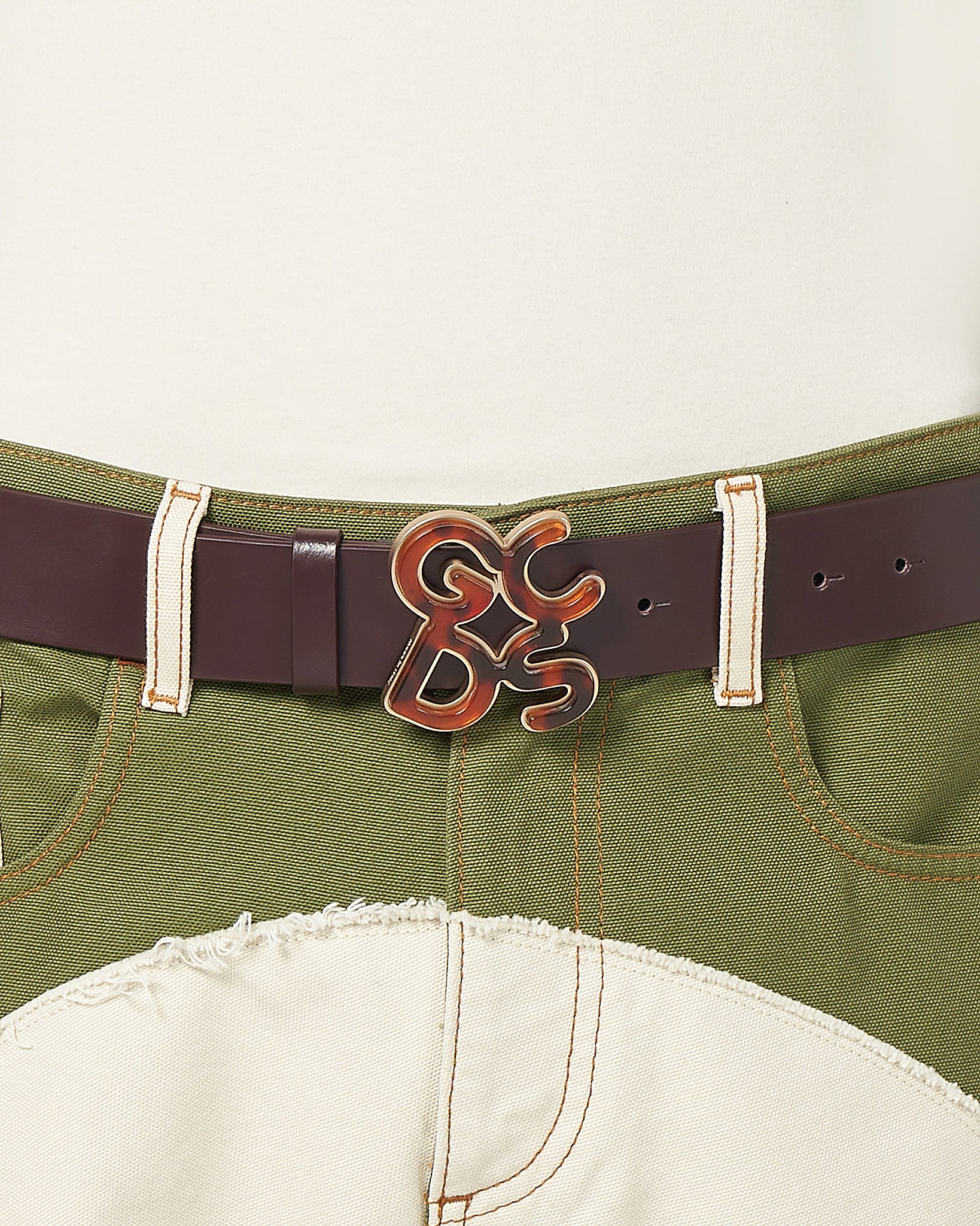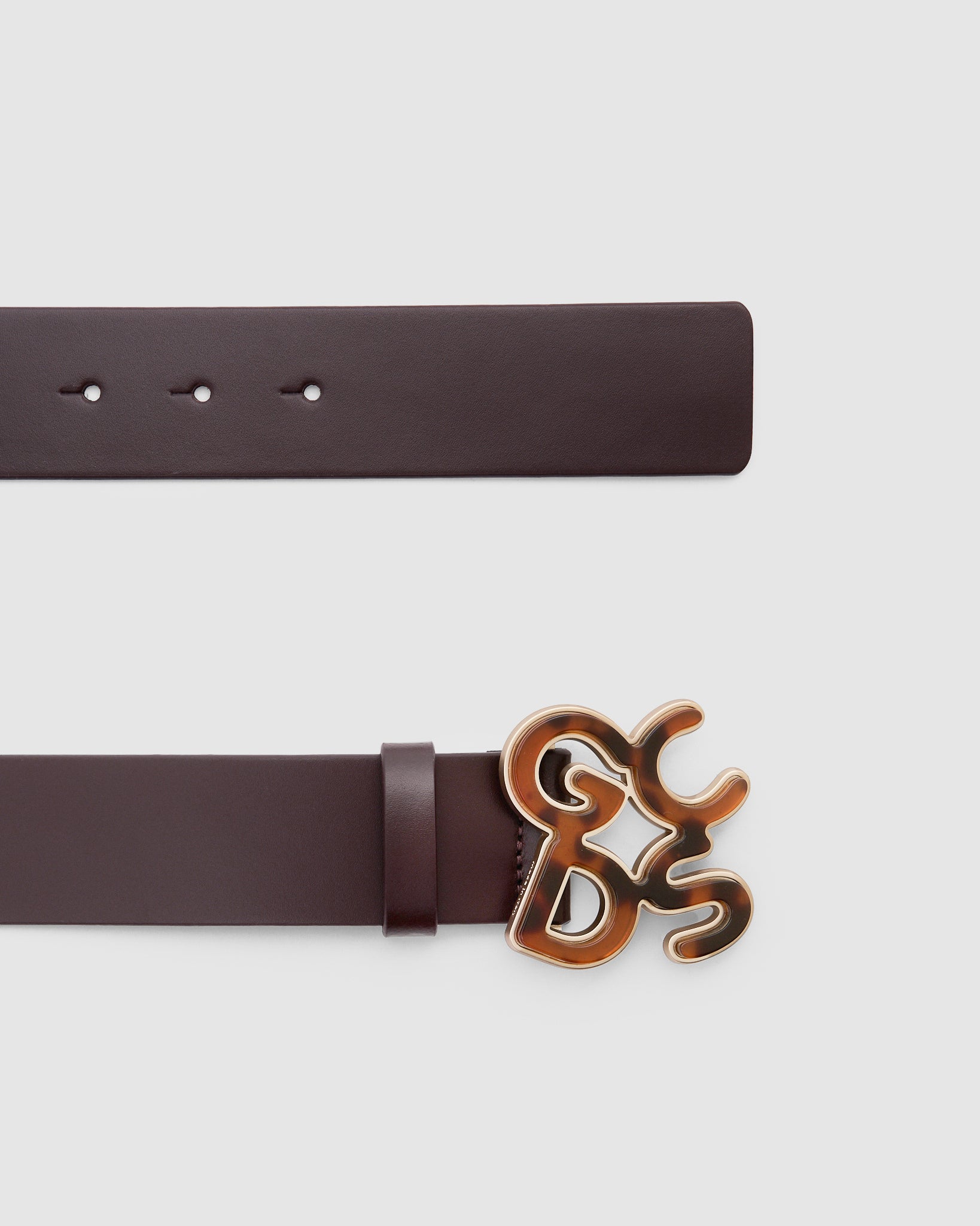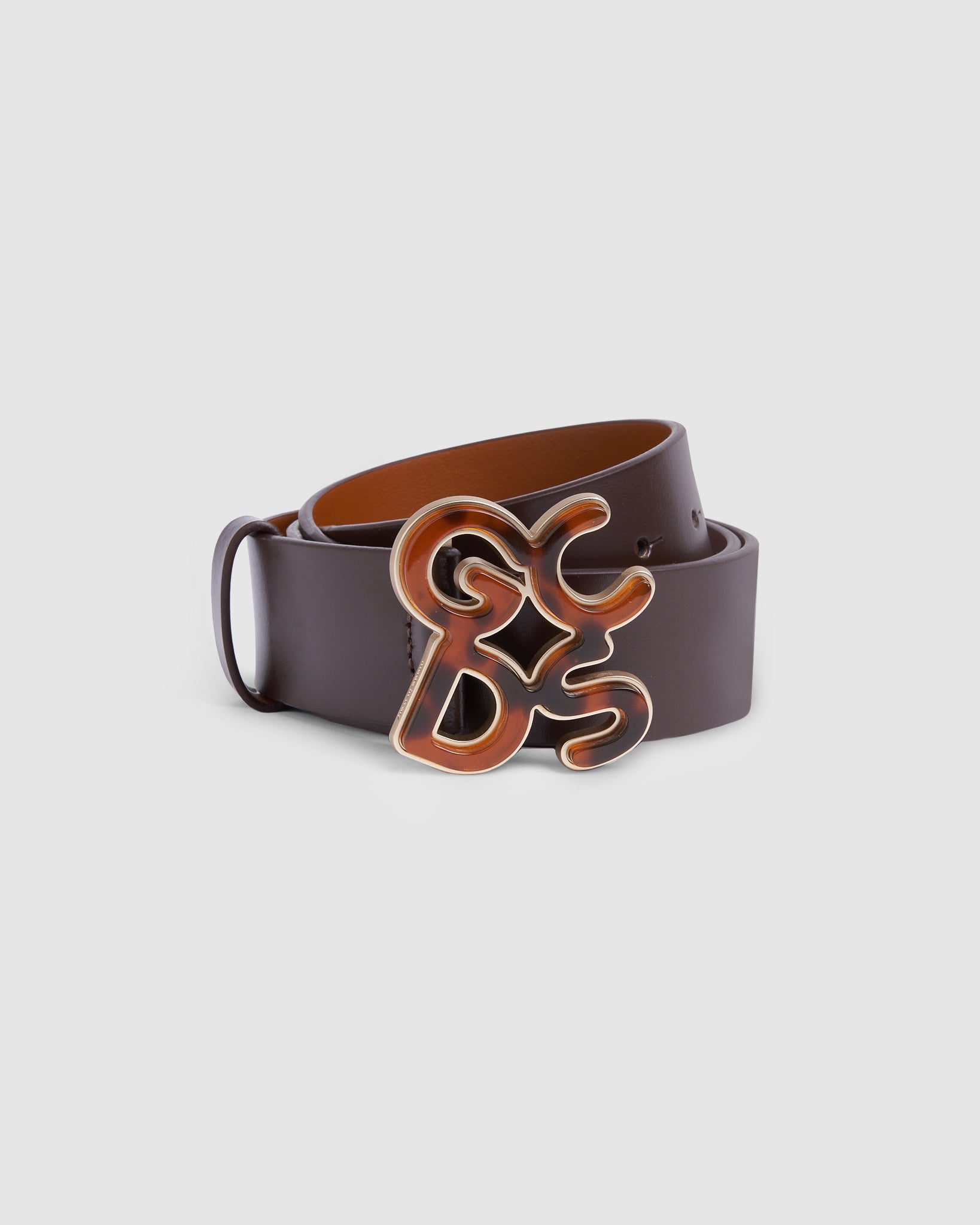 Leather GCDS belt with loops and new Andy logo buckle in tortoiseshell effect lamé PVC.