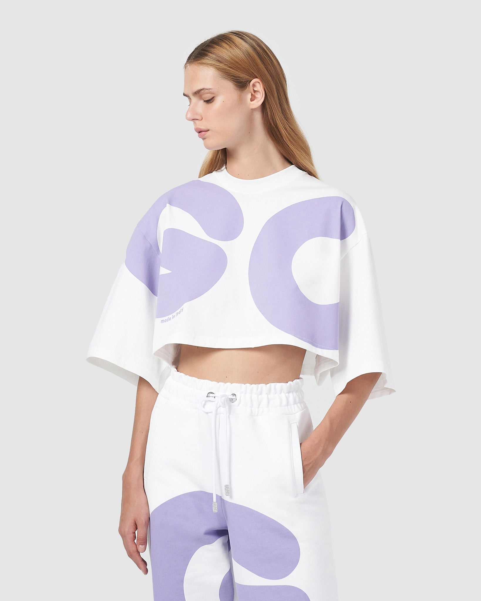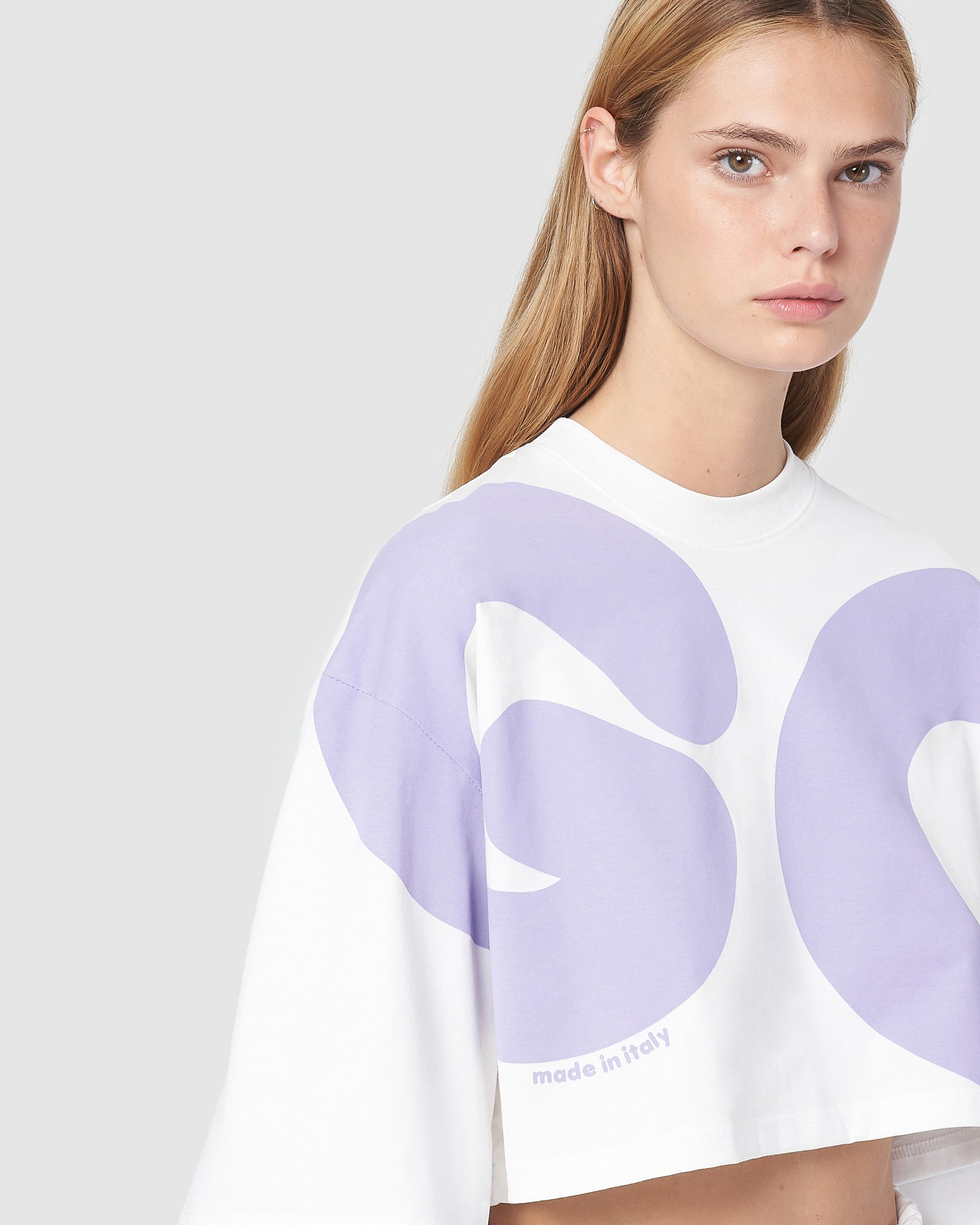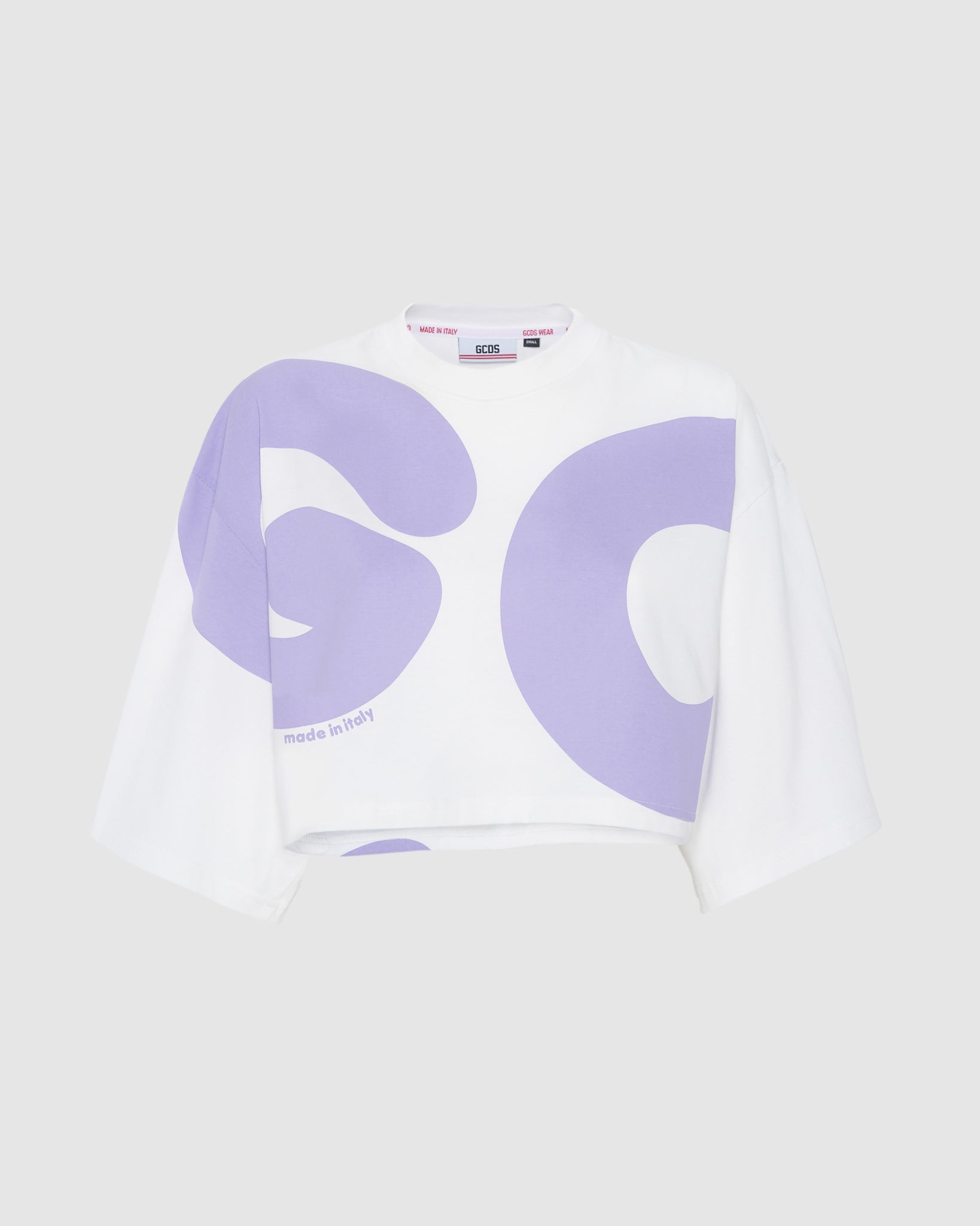 GCDS cropped cotton T-shirt with maxi Andy logo print on the front and back. Made in Italy print on the front. Over-sized.