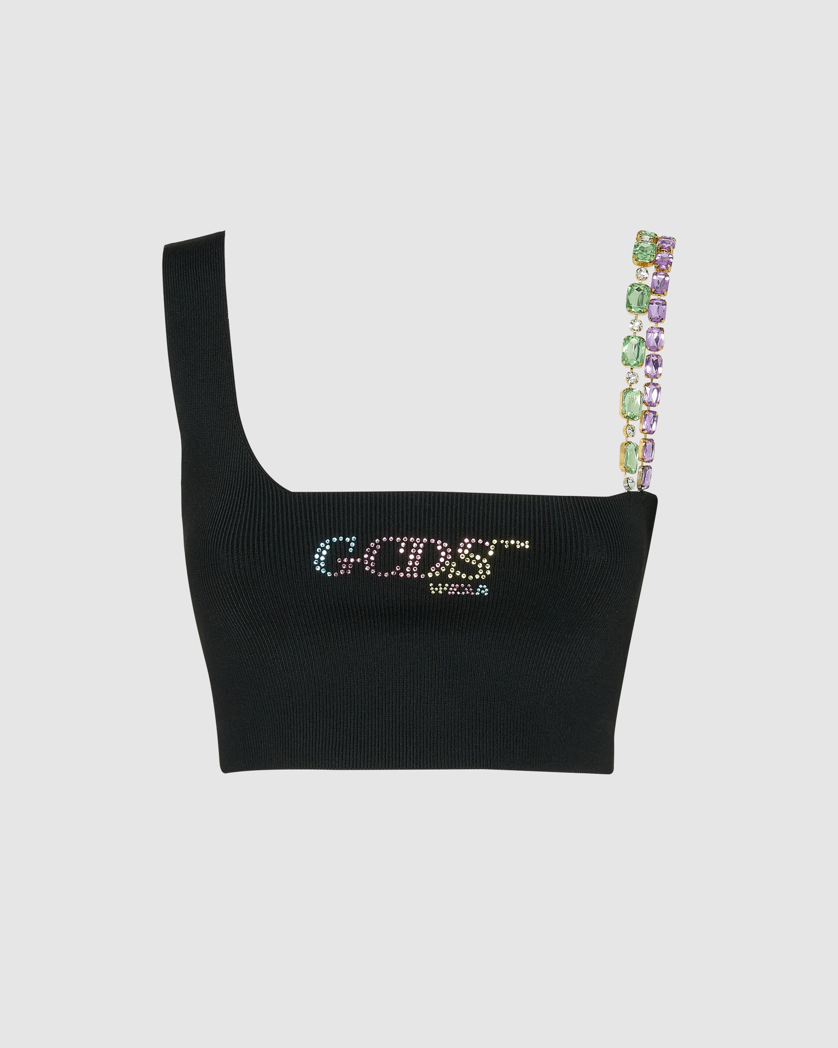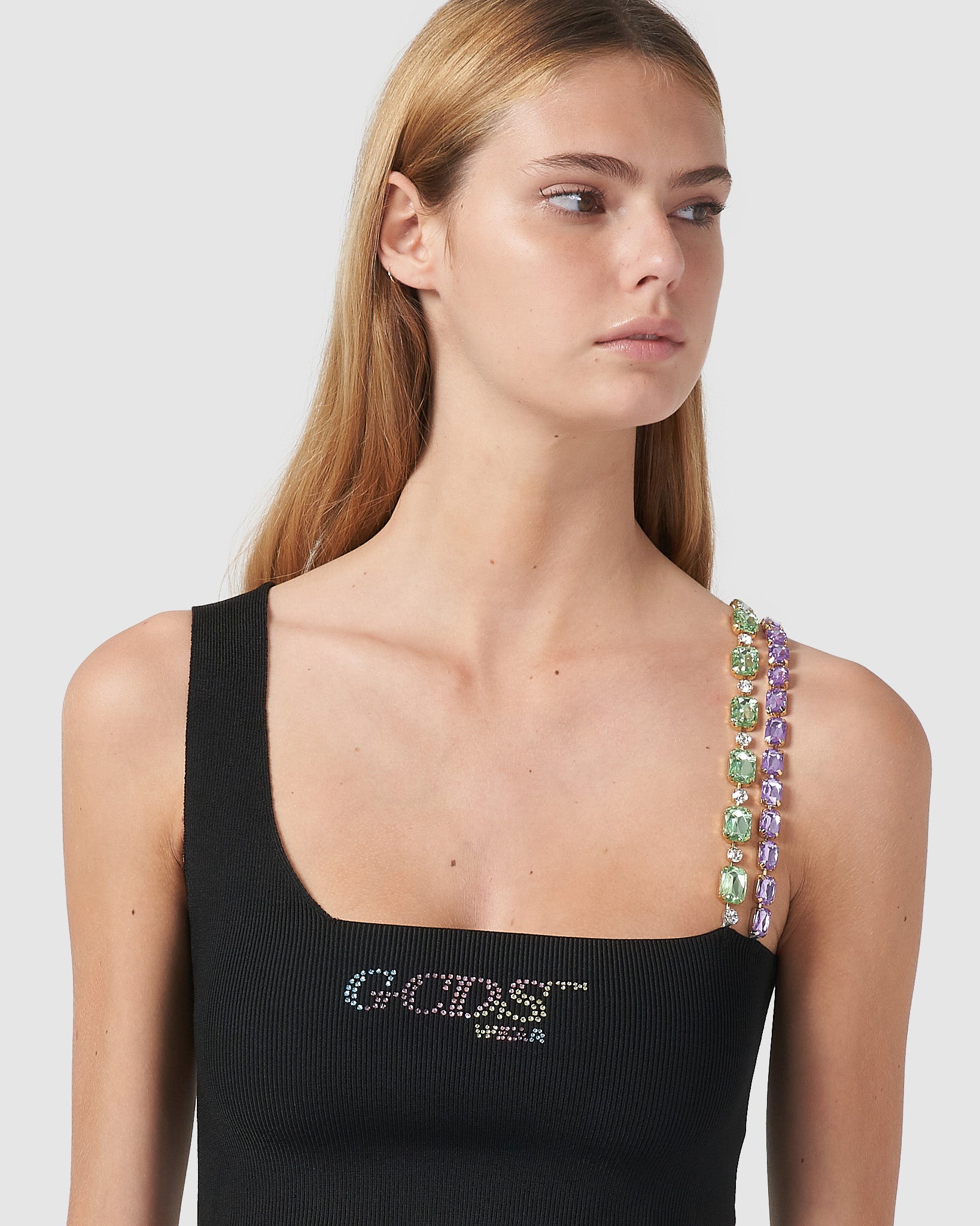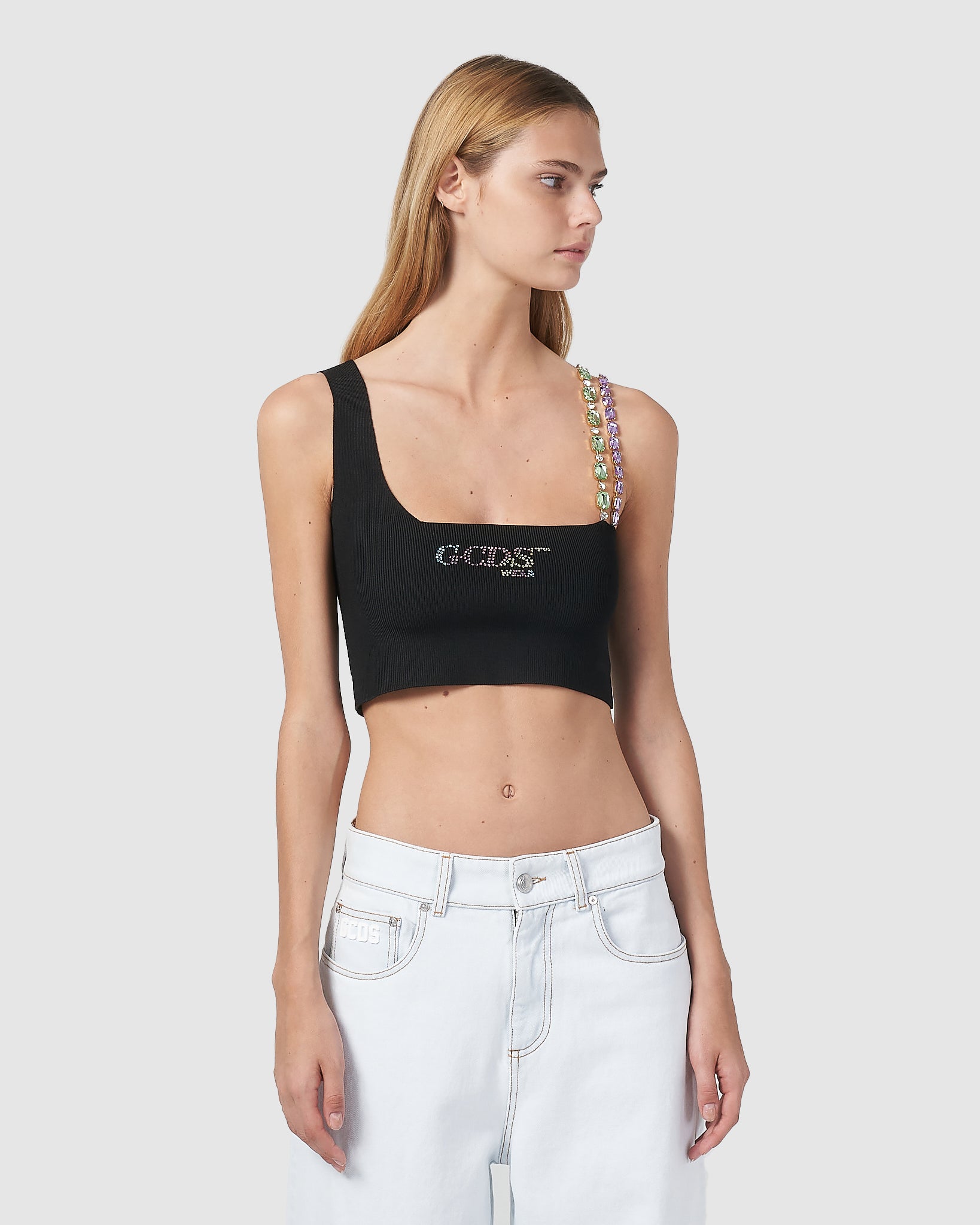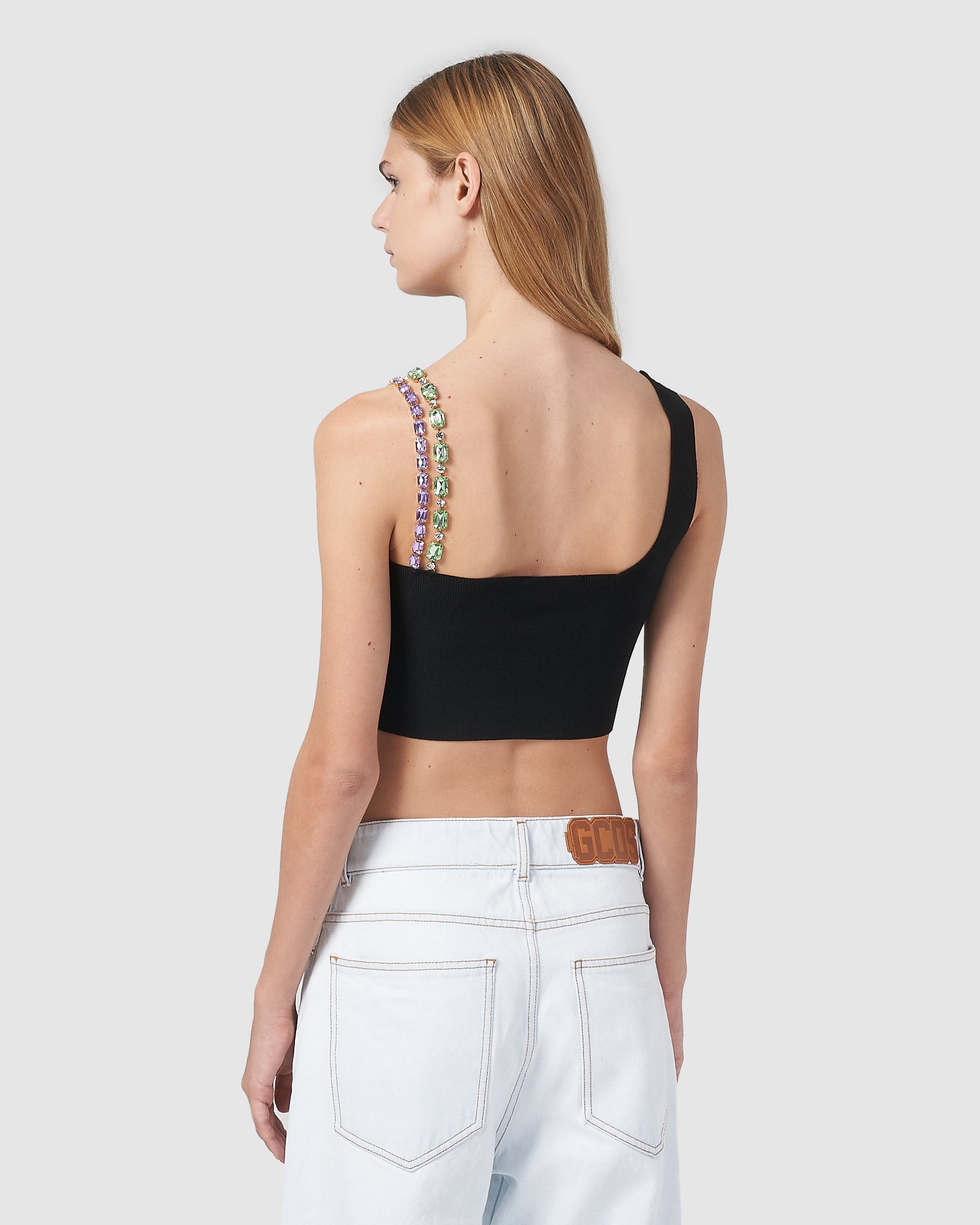 GCDS one-shoulder solid knit mini top. Logo detail in heat-set rainbow crystals by Preciosa on the front. Left shoulder strap with double chain of two-tone stones.