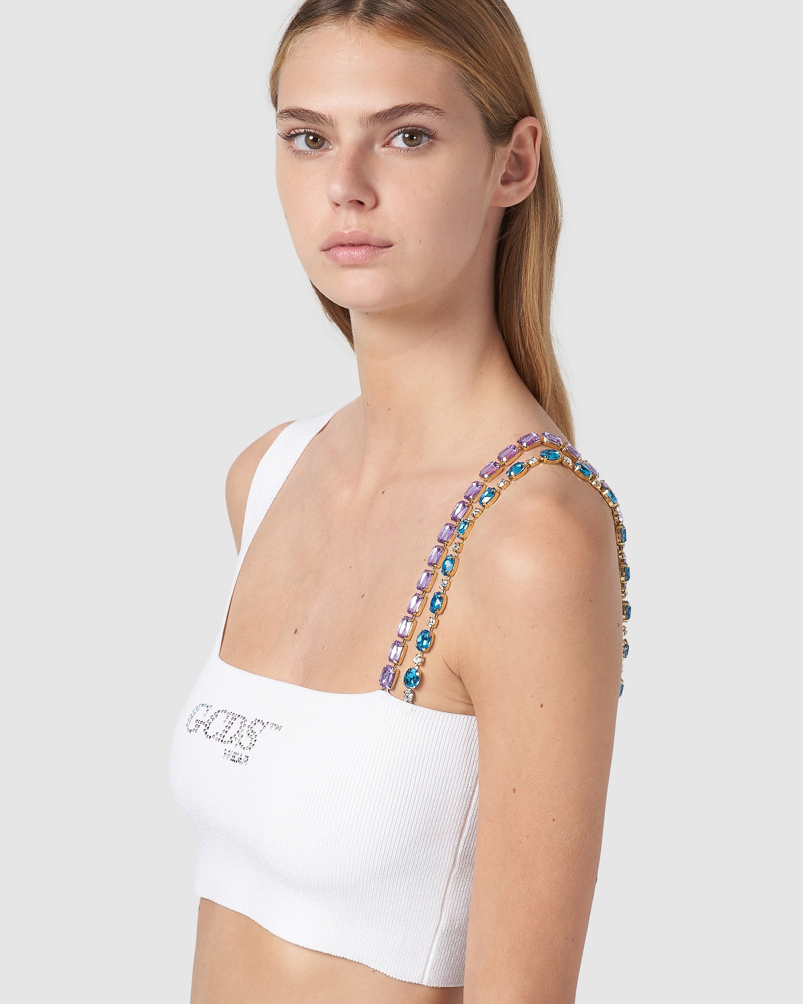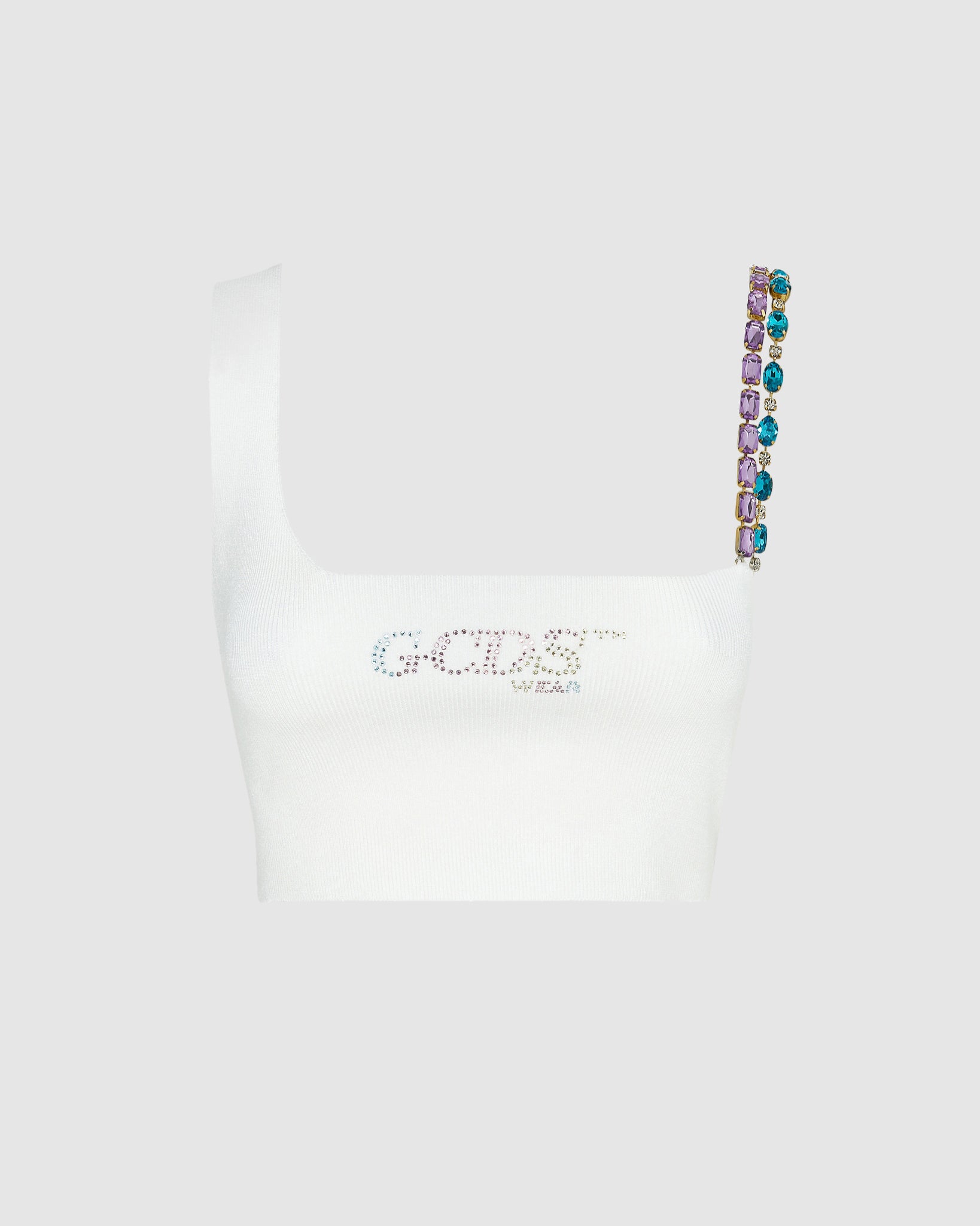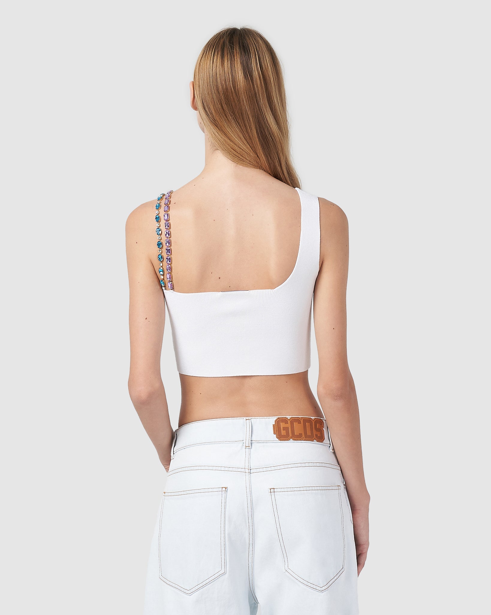 GCDS one-shoulder solid knit mini top. Logo detail in heat-set rainbow crystals by Preciosa on the front. Left shoulder strap with double chain of two-tone stones.