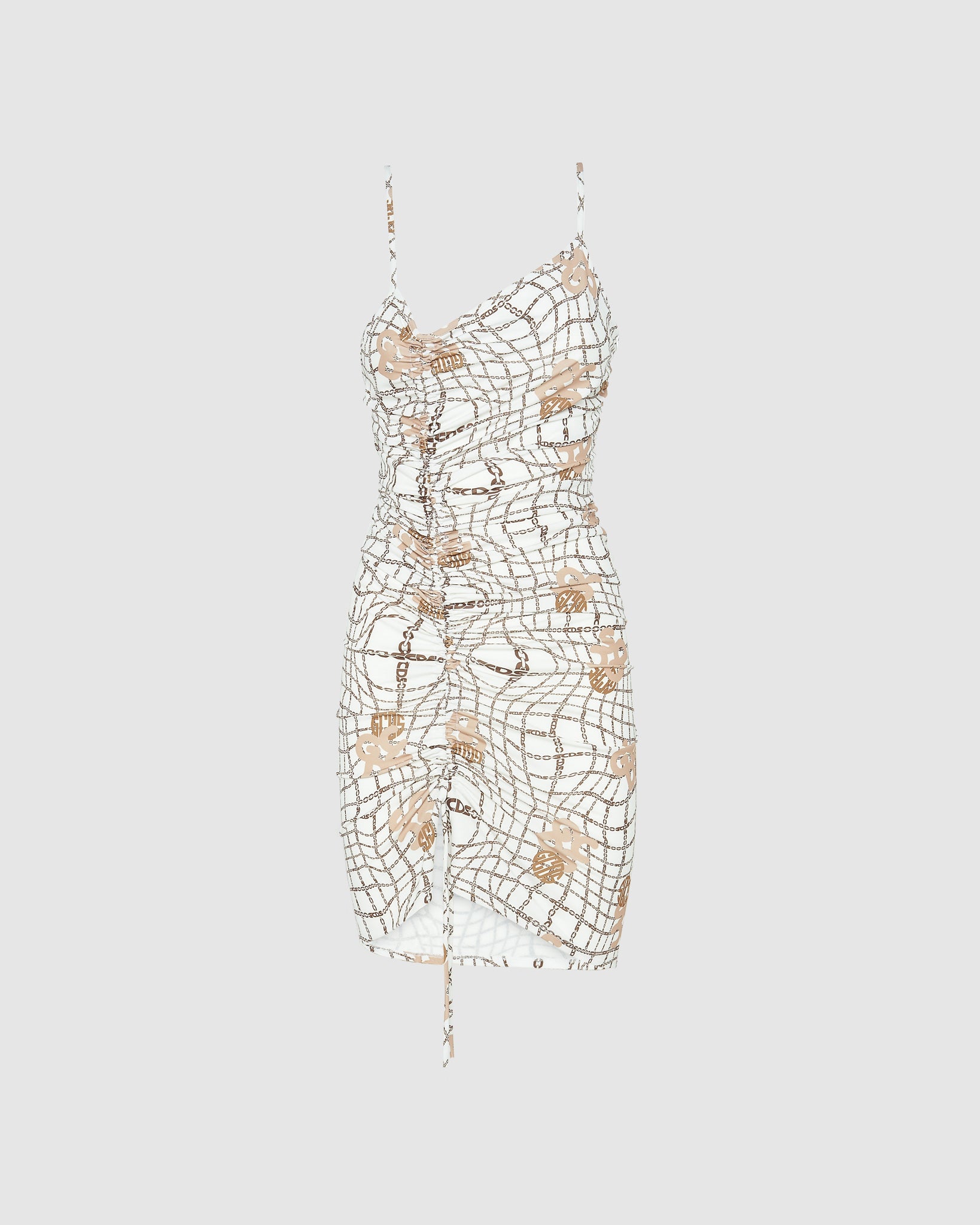 GCDS Lycra mini dress with an asymmetrical neckline and all-over blurred chain motif print. Adjustable cord tie at the bottom. Invisible zipper on the left hip.