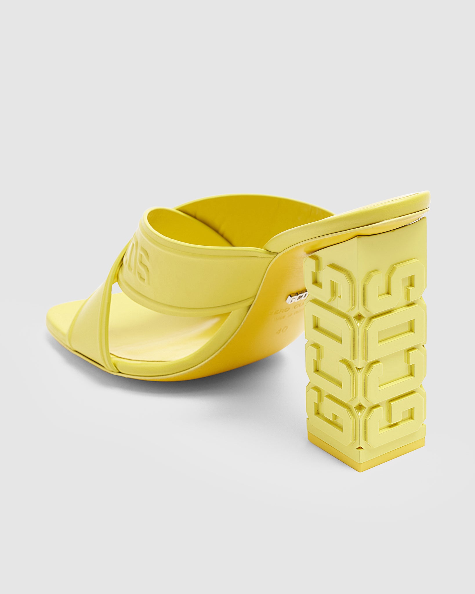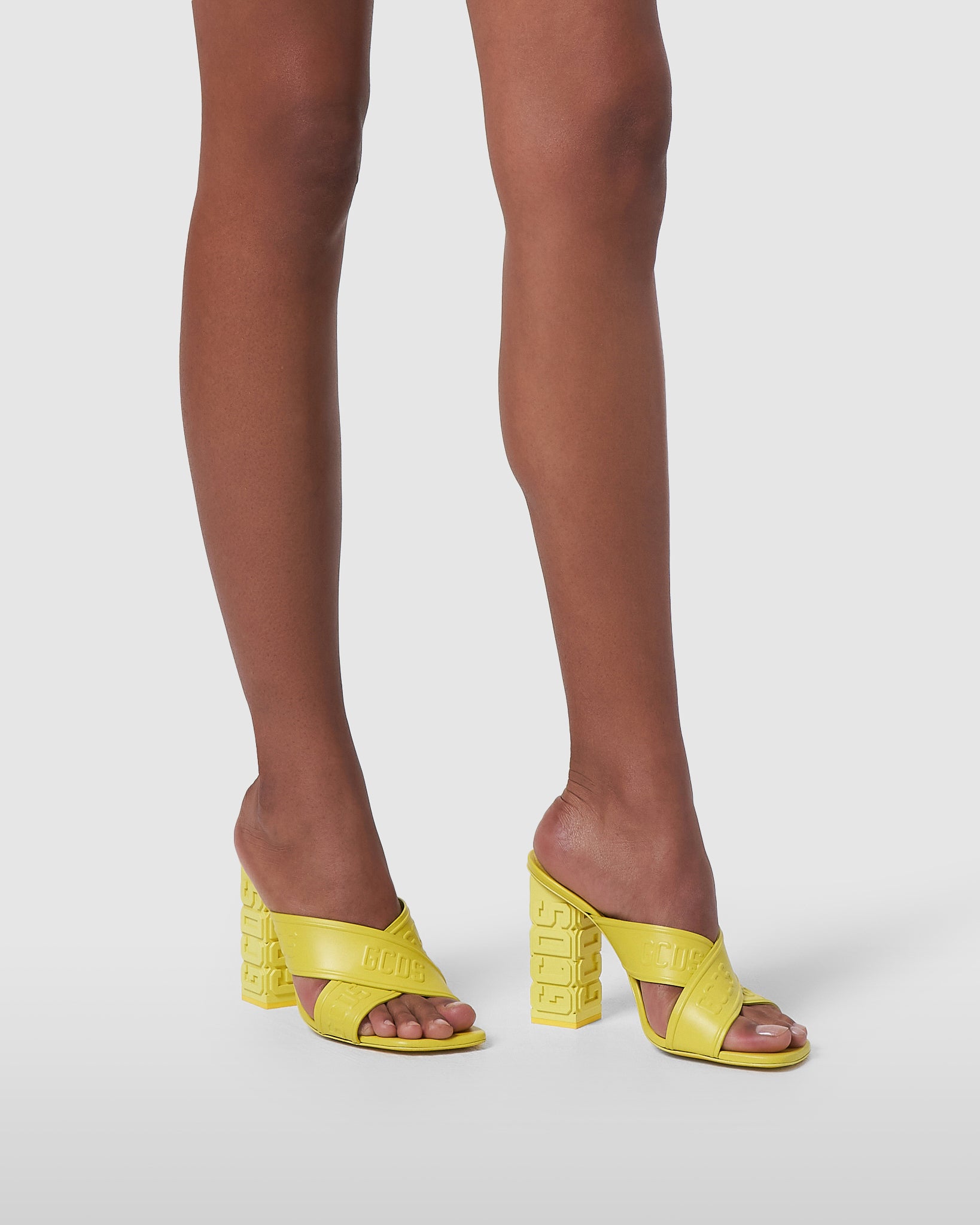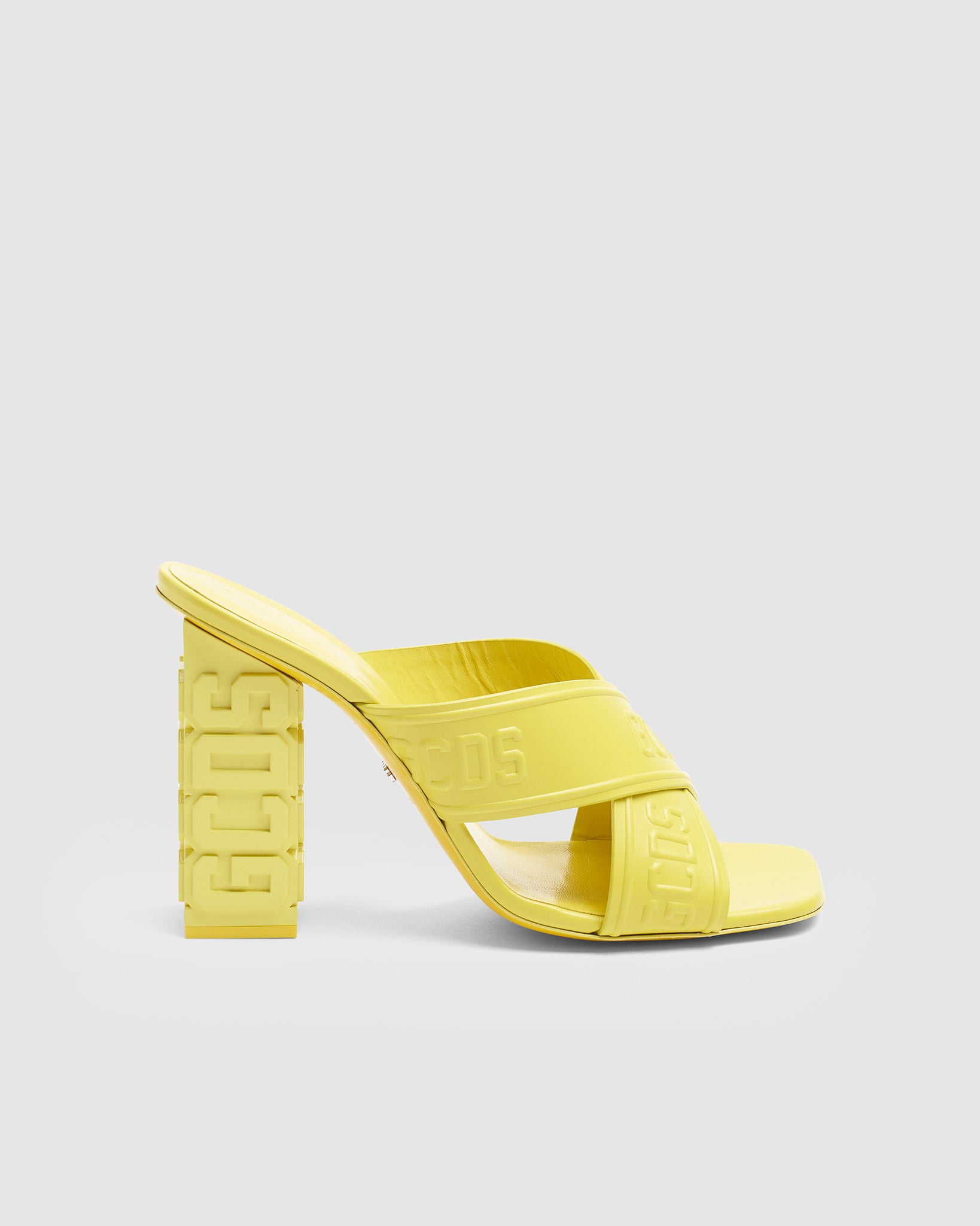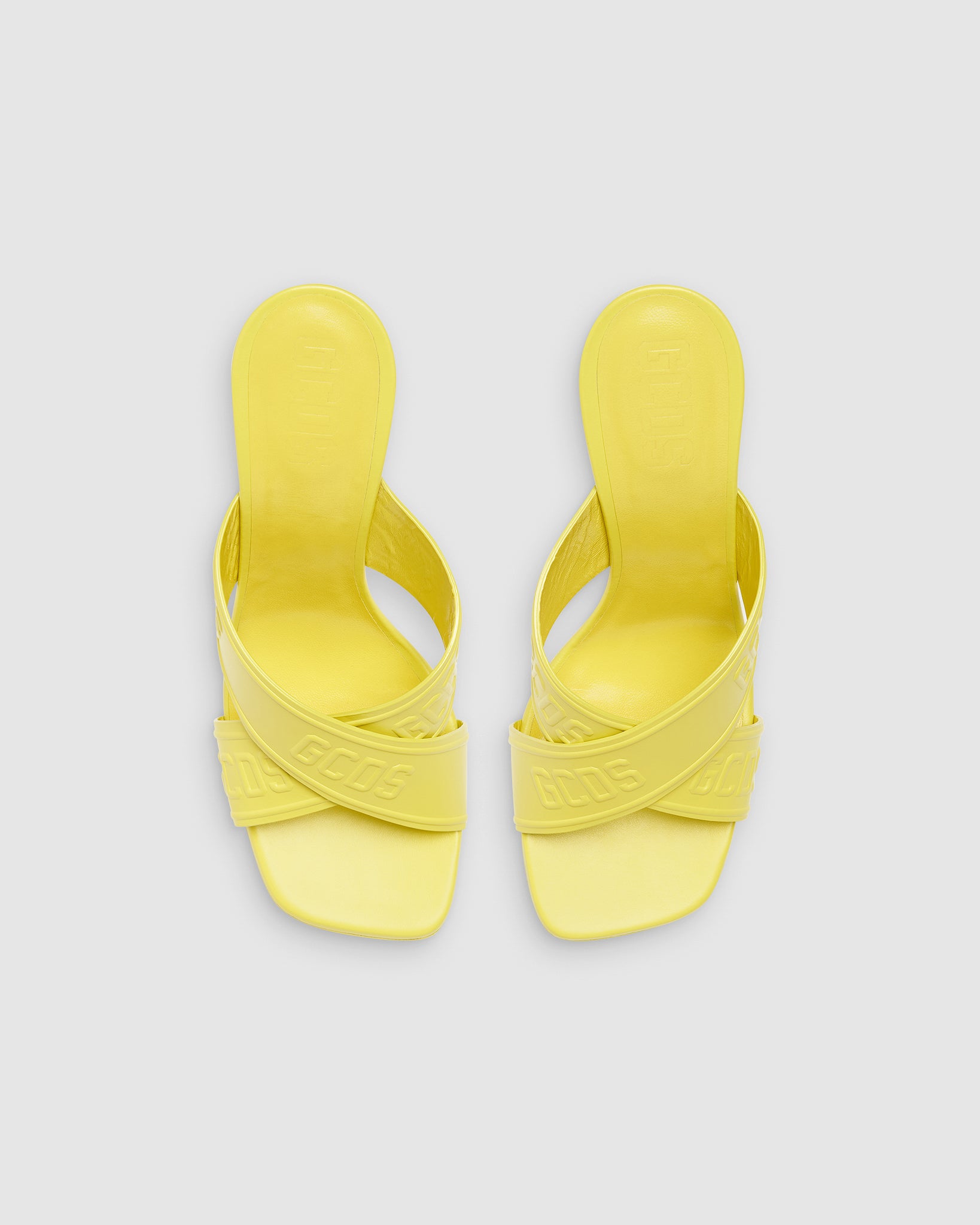 GCDS criss-cross banding on the foot made with embossed logo straps. Square toe. Classic sculpted heel with polished logo.