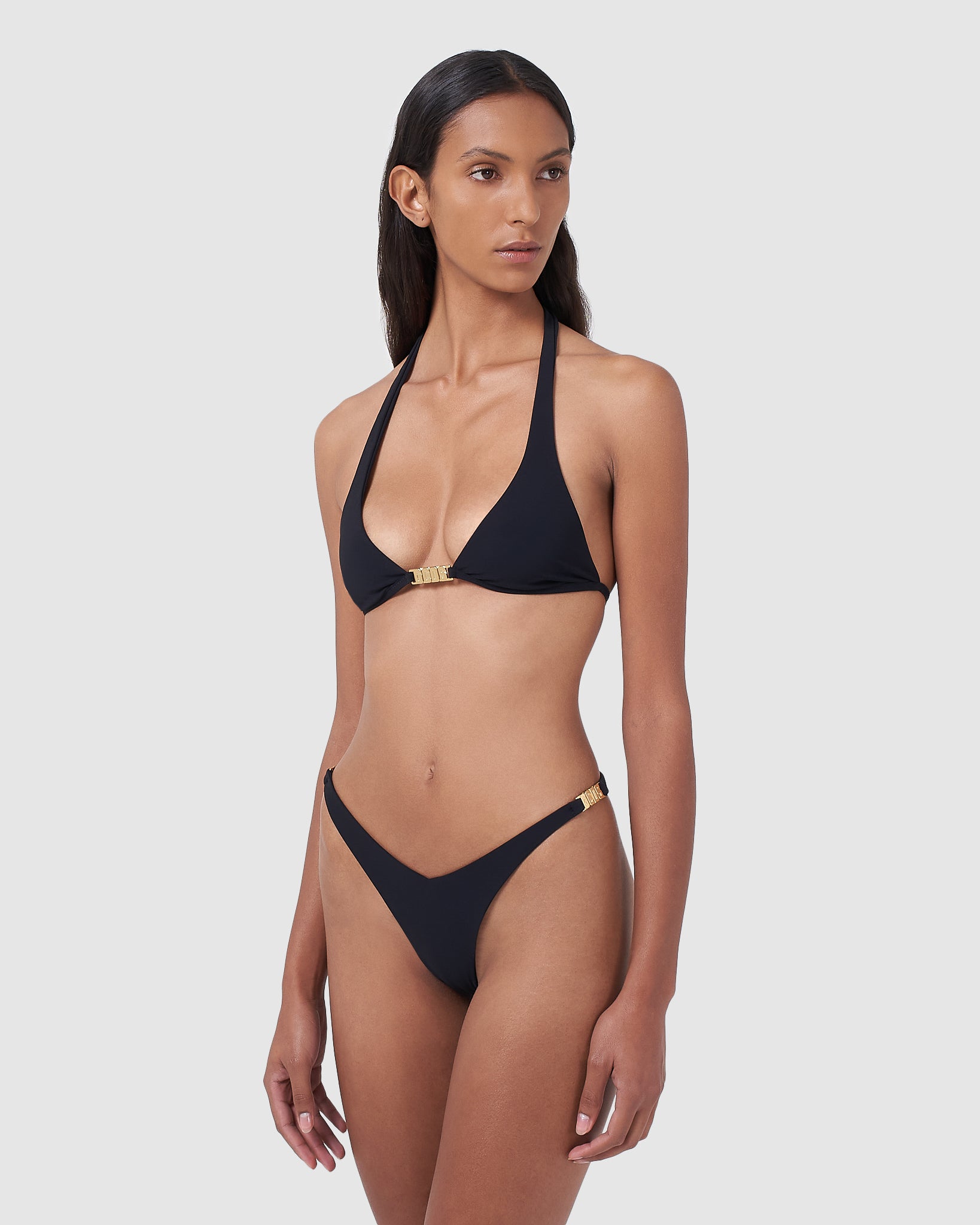 GCDS slim triangle bikini without cups or underwire. It ties up at the back and has multi-position straps. Functioning golden logo clip at the center front. V-cut Brazilian panties with high leg contour and two functioning golden logo clips on the sides.