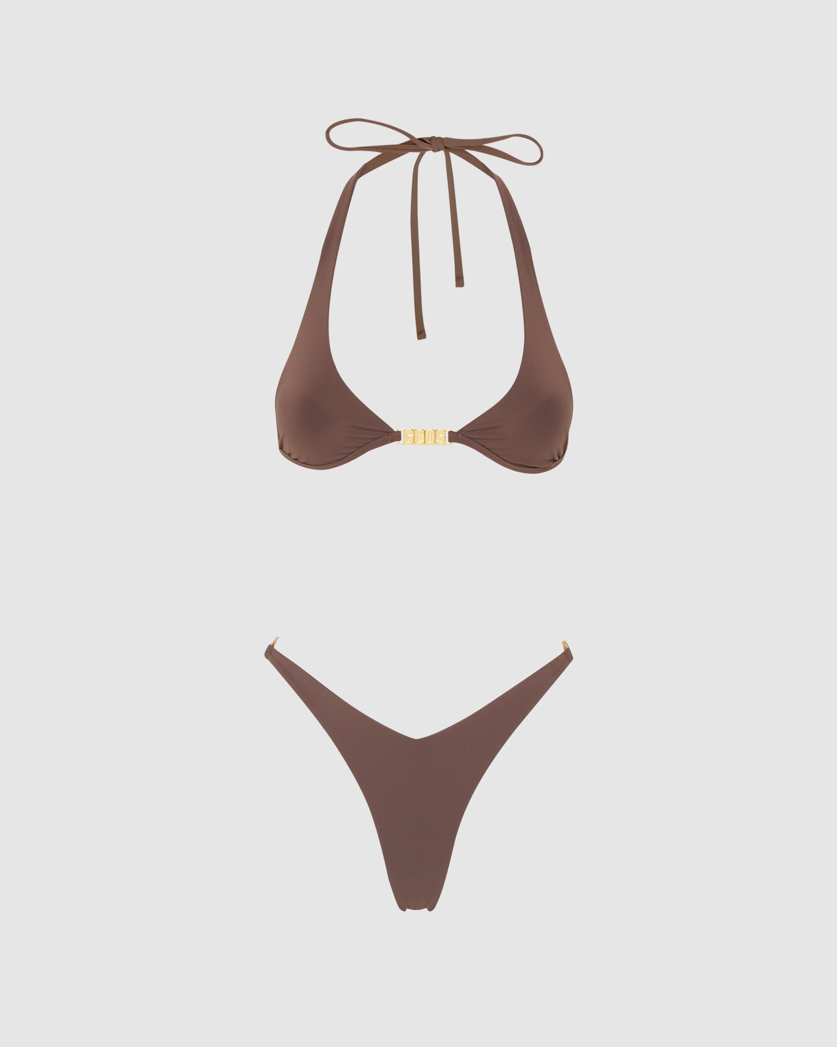 GCDS slim triangle bikini without cups or underwire. It ties up at the back and has multi-position straps. Functioning golden logo clip at the center front. V-cut Brazilian panties with high leg contour and two functioning golden logo clips on the sides.