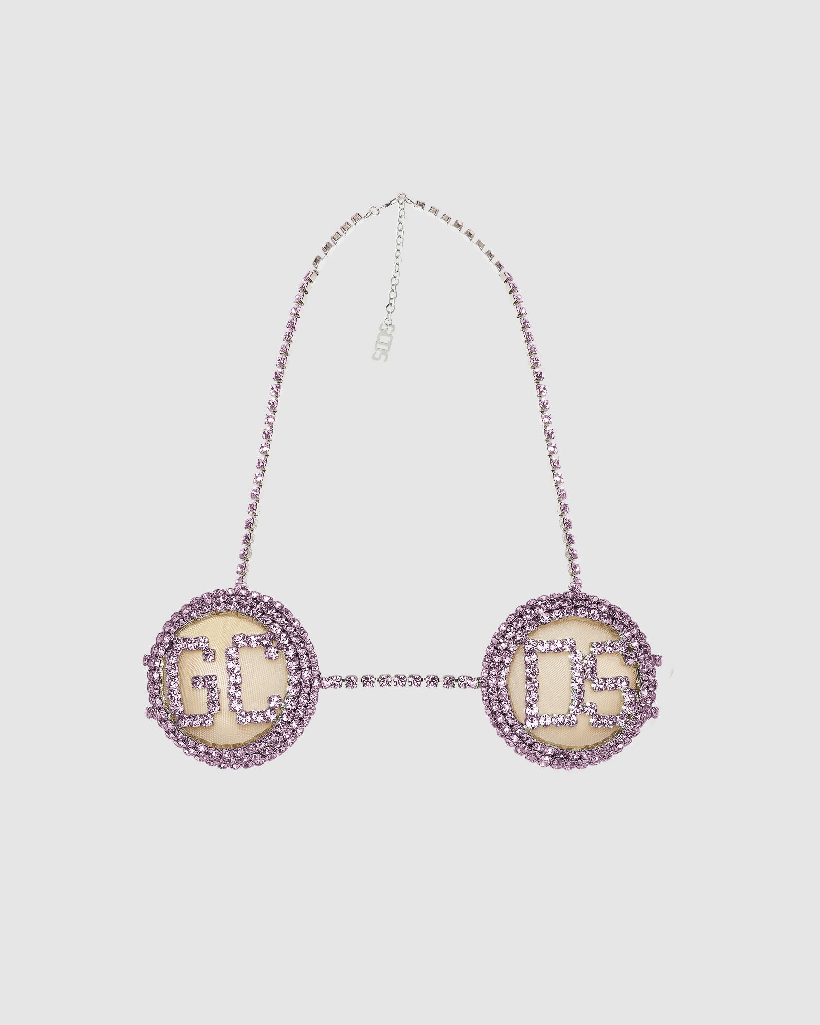 GCDS bra with rigid cups adorned with three rounds of rhinestones and logo letters. Cups internally lined with flesh-colored tulle with crystals by Preciosa cup chain.