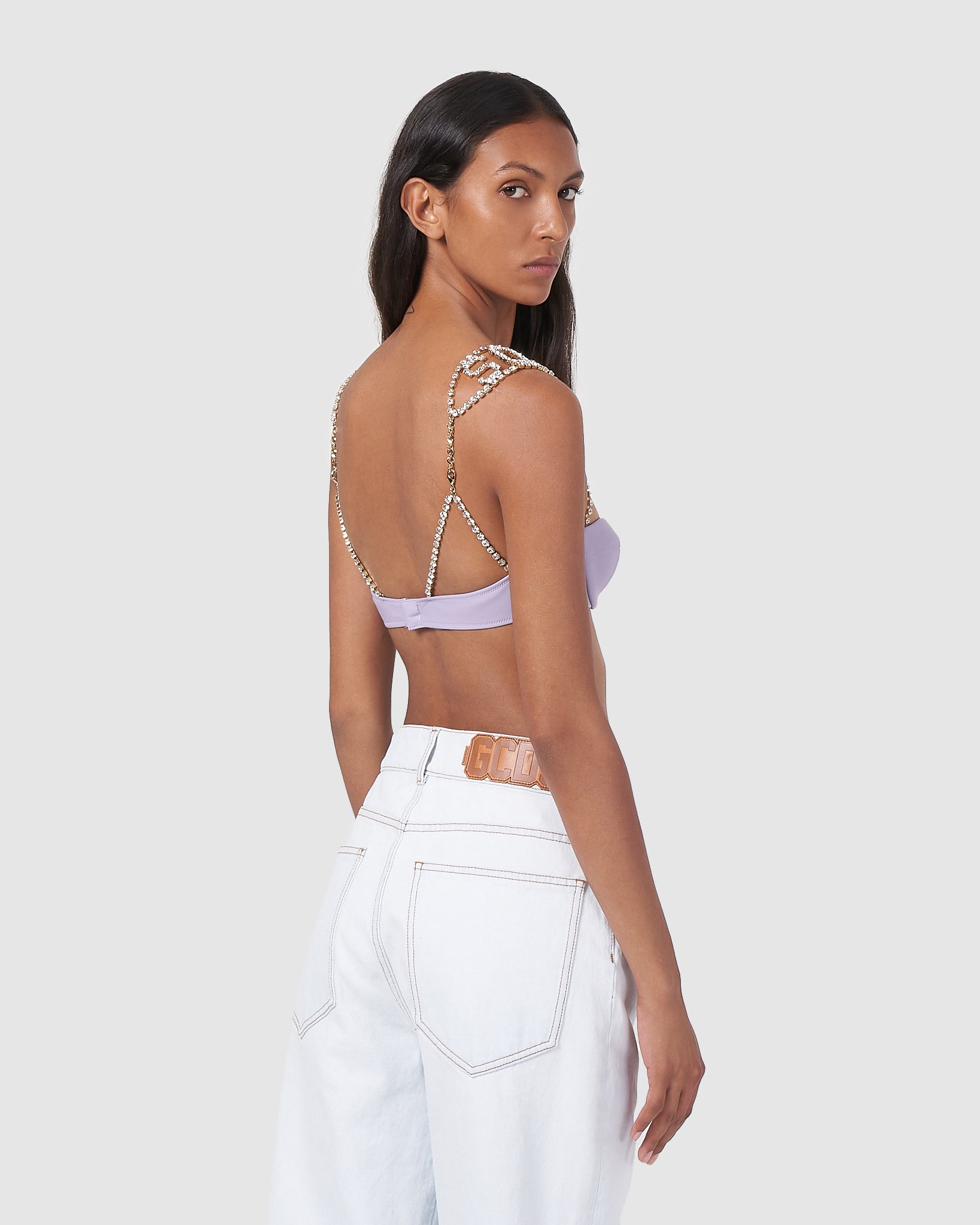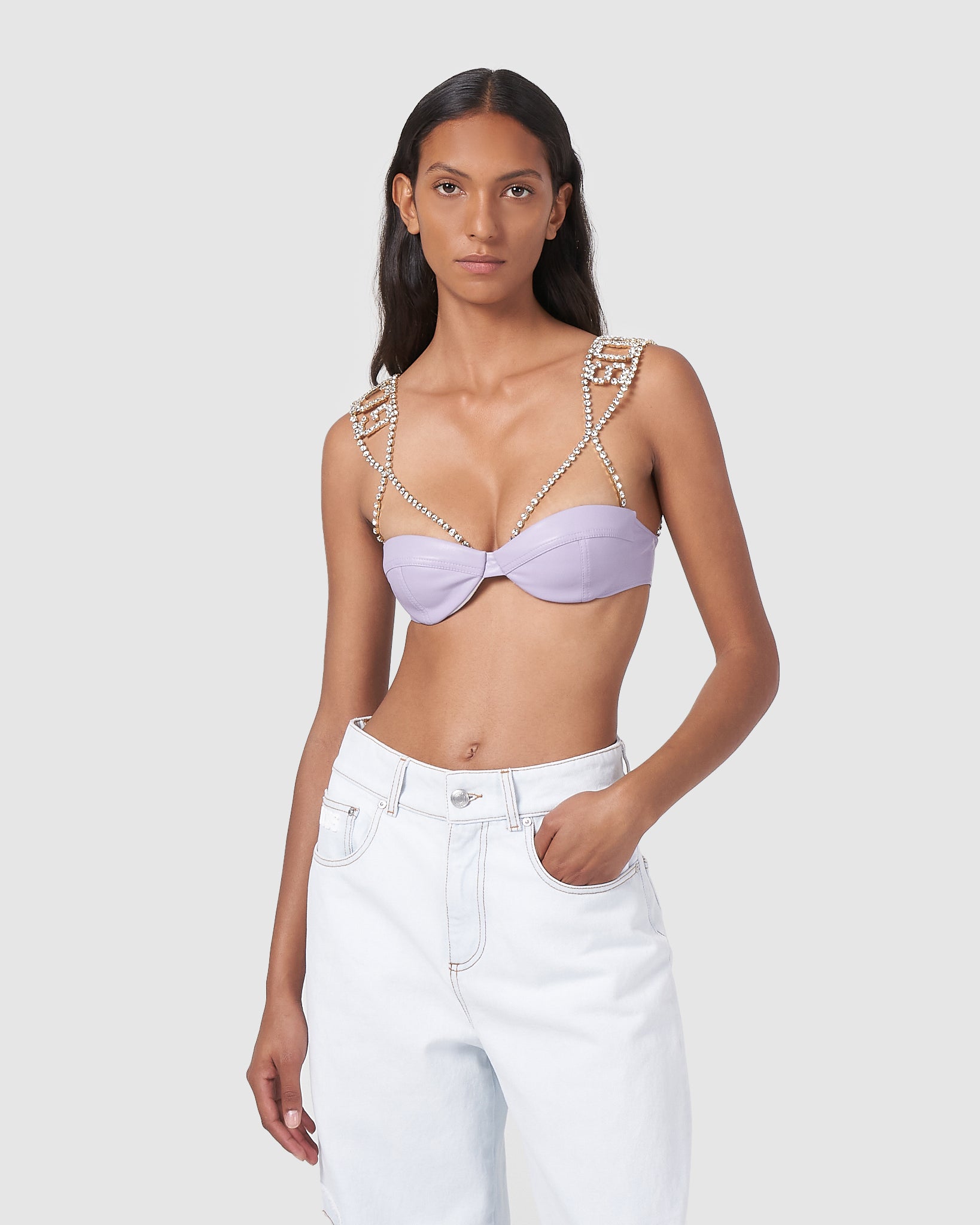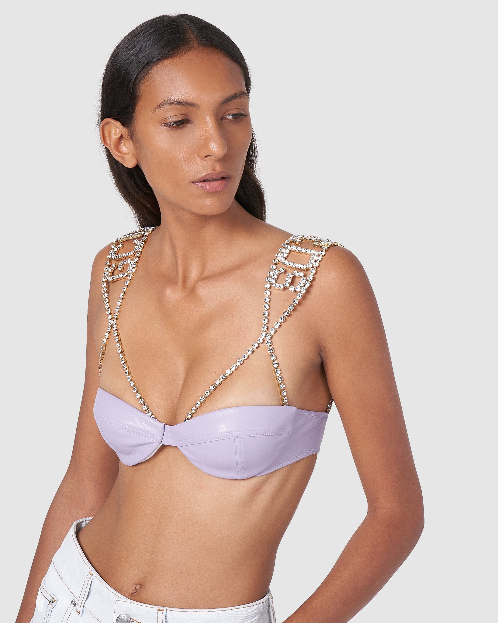 GCDS faux leather balconette bra. Jewel straps with logo in crystals by Preciosa.